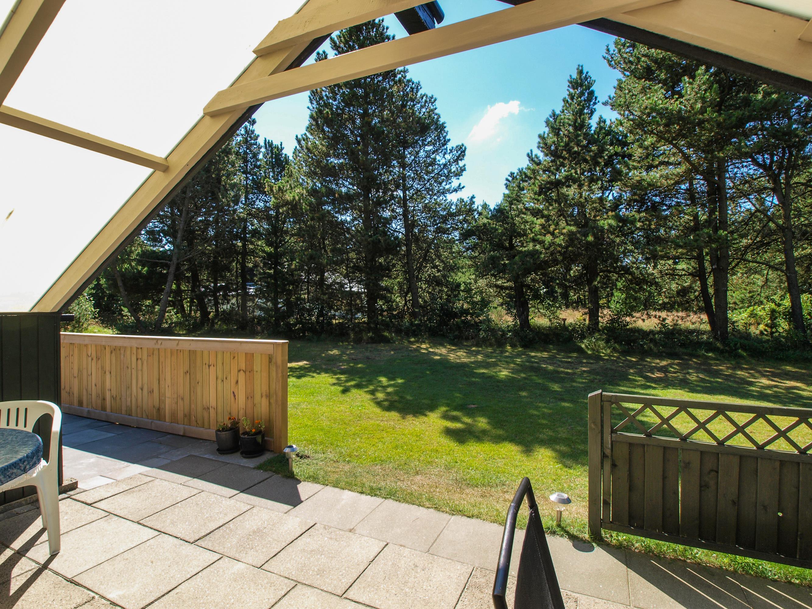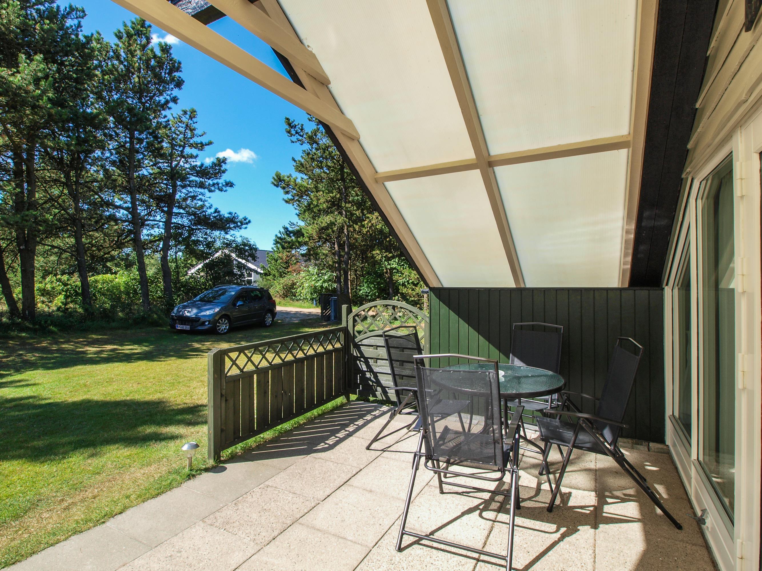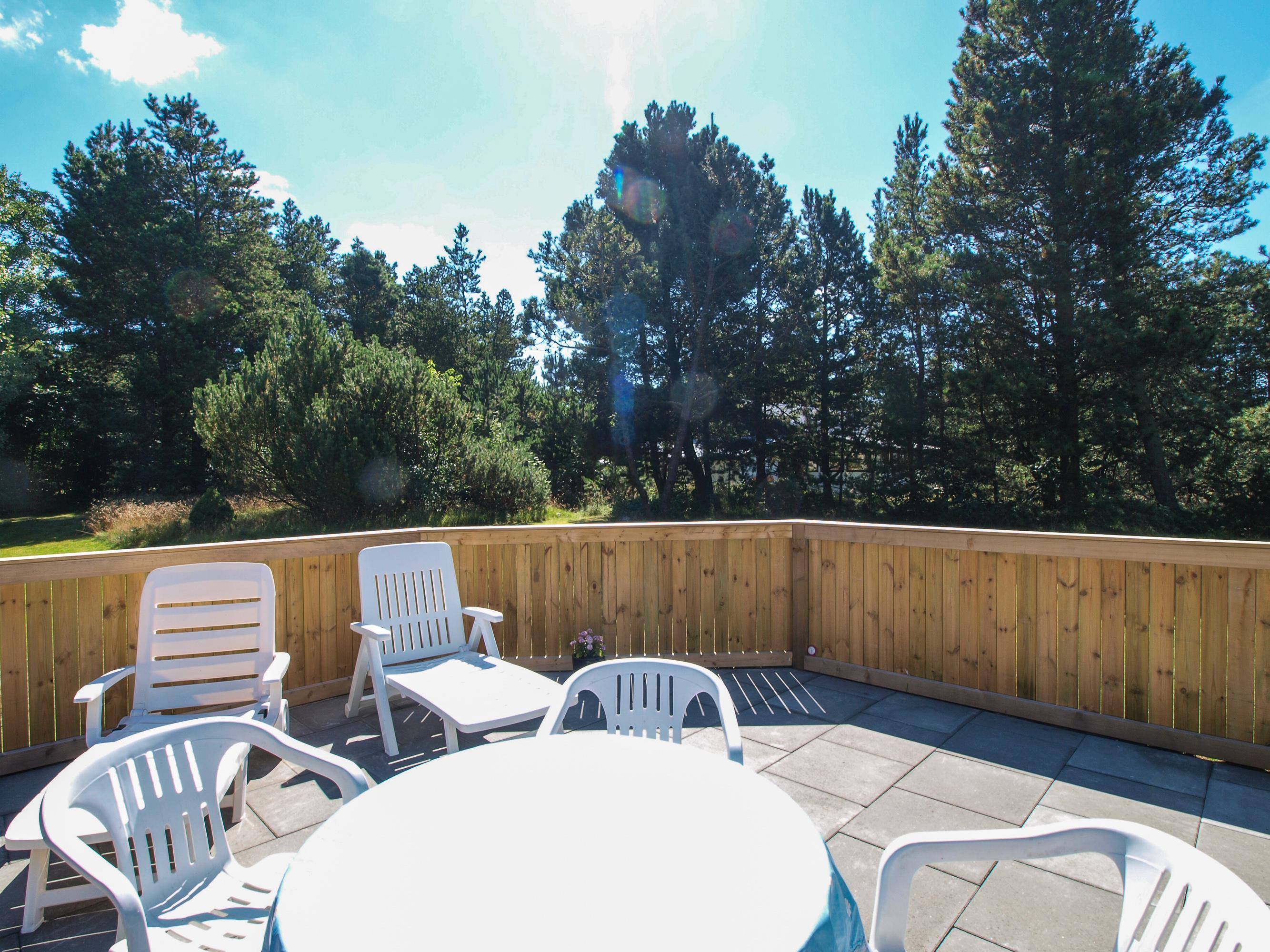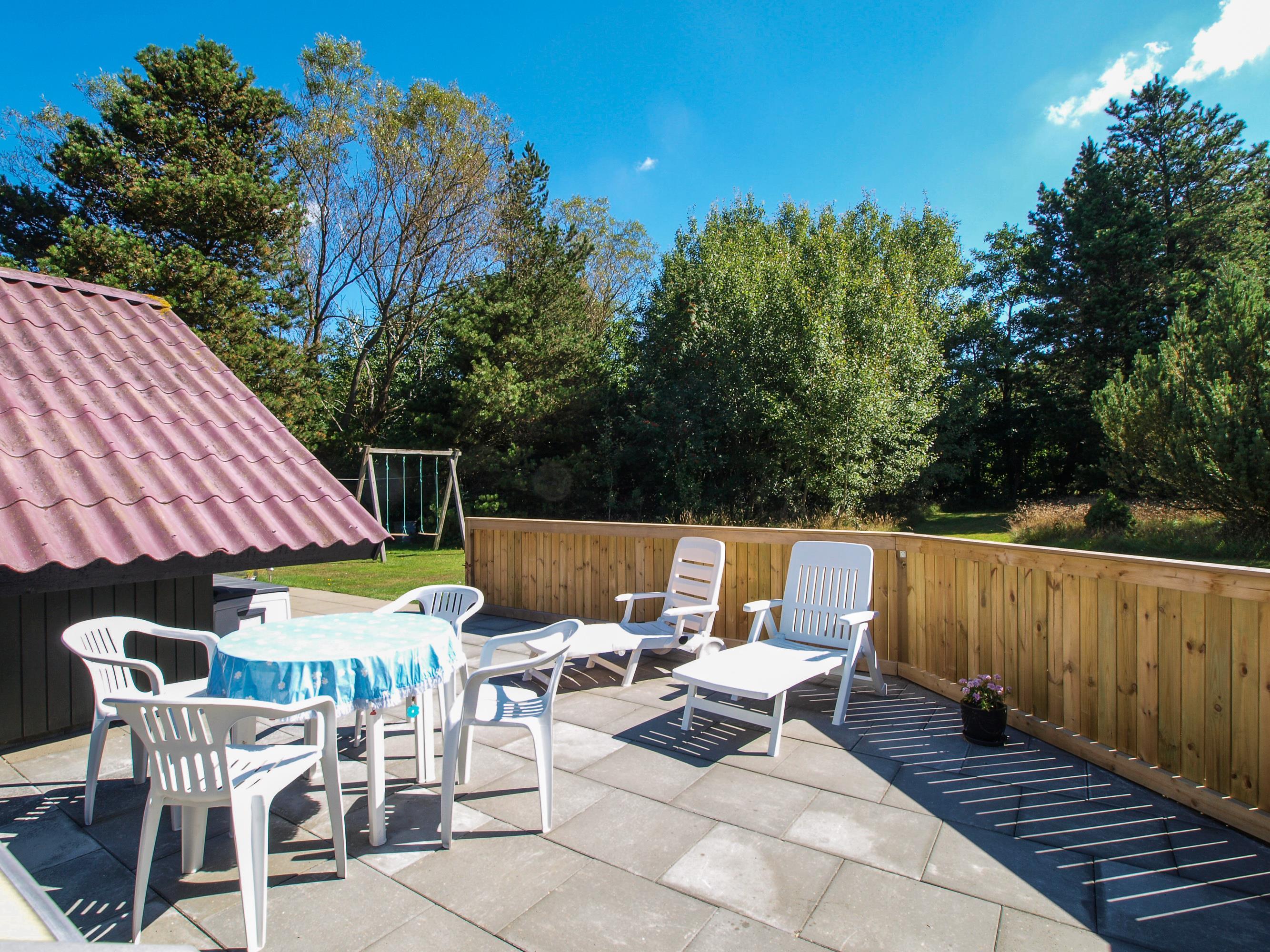 Fra sommerhusets stue er der direkte udgang til terrassen, som til dels er overdækket med plastplader, for at bevare lysindfaldet. Her er der ly og læ, hvilket giver mulighed for at sidde ude og nyde den friske luft, når vejret ikke arter sig. Det er også det perfekte sted at sætte sig med sin kaffe, imens børnene leger på den store grund, hvor der både er gynger og en sandkasse til rådighed.
