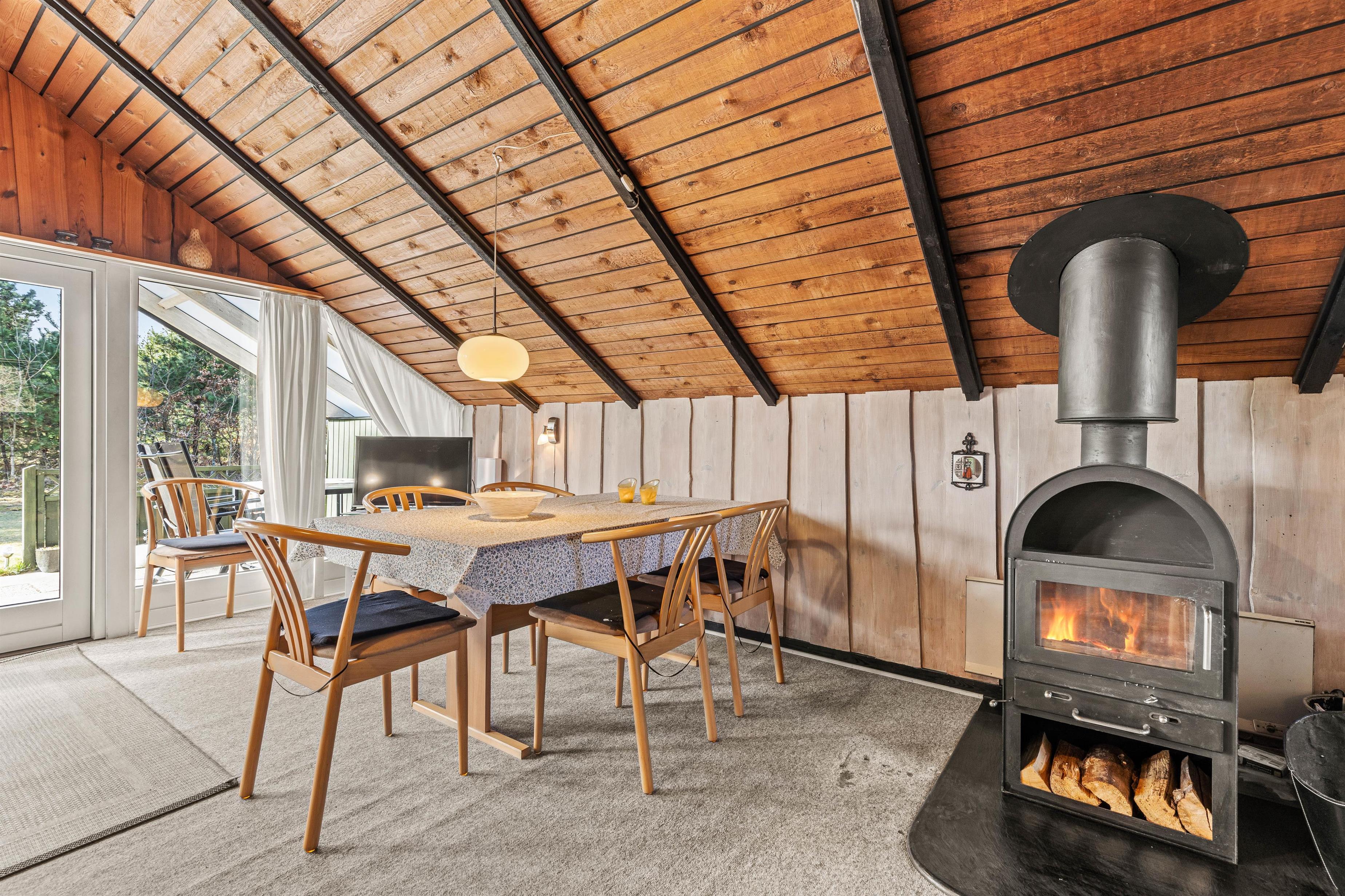 Sommerhuset er et typisk Kalmarhus, med det klassiske træværk med synlige spær og det hyggeligt mørke lave loft. Køkkenet er åbent ud mod stuen, hvor terrassedøren og store vinduer giver et fint udsyn på den dejlige naturgrund. En brændeovn sørger for varme og hygge på kolde dage.
