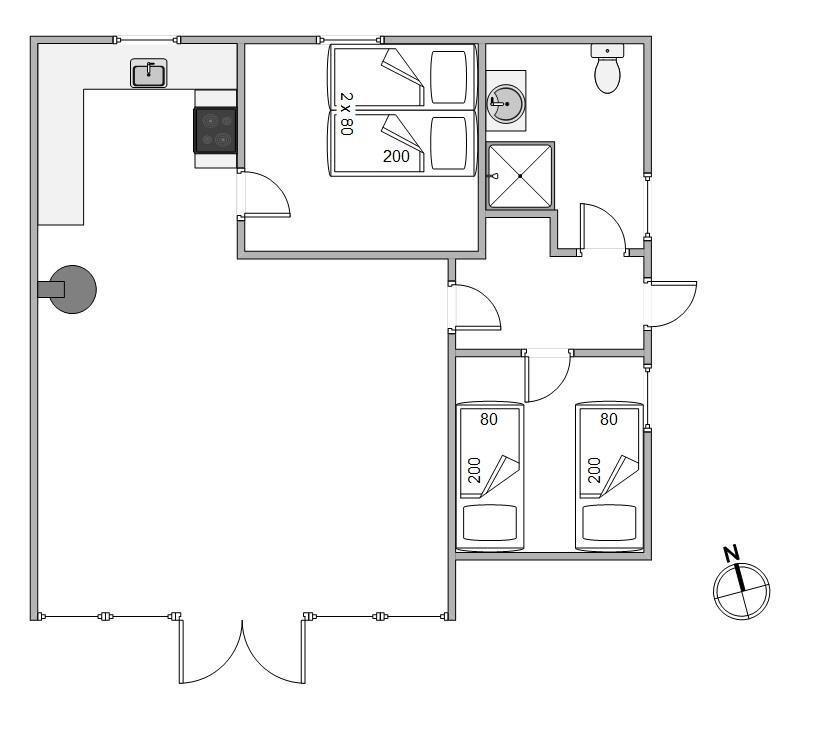 Sommerhusets sovepladser til op til 4 personer er fordelt på 2 soveværelser, det ene med dobbeltseng og det andet med 2 enkeltsenge.