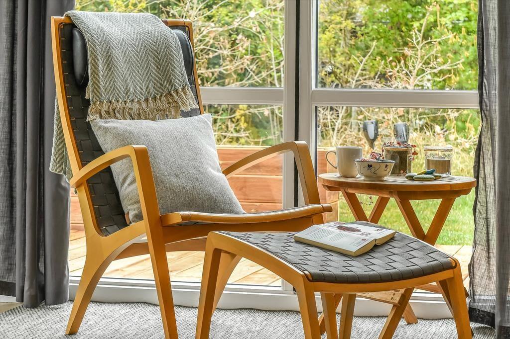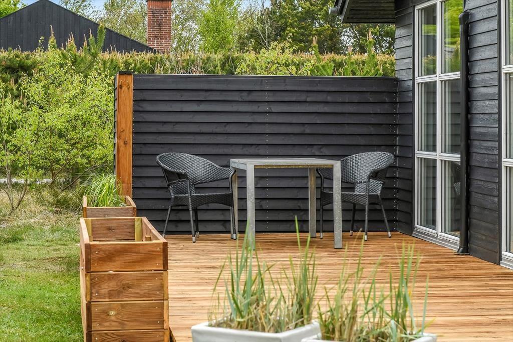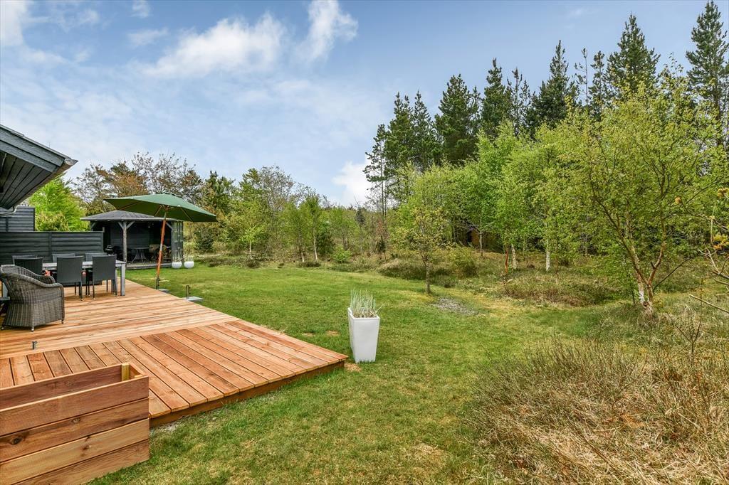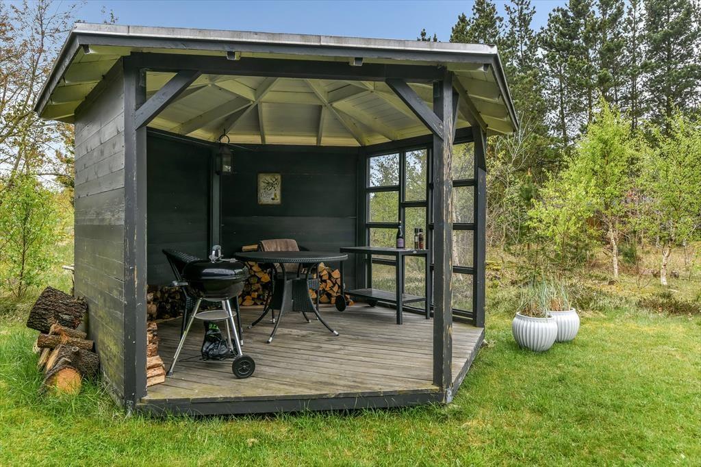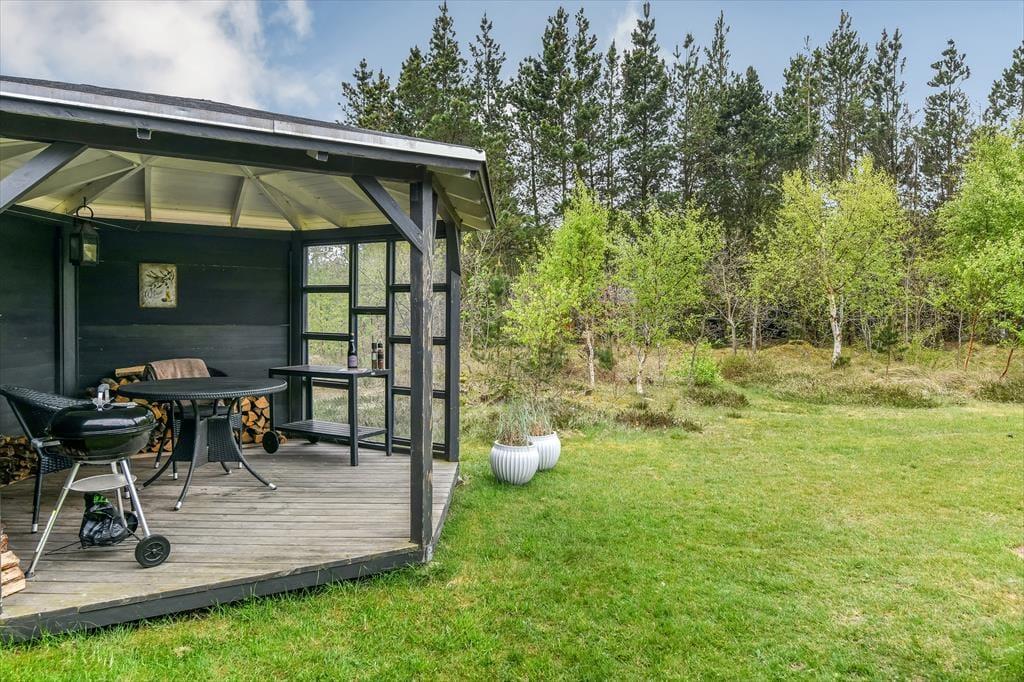 Udenfor venter en skøn, solrig terrasse, der danner den perfekte ramme om feriens udeliv. Her kan du finde din favoritplads i solen, læne dig tilbage i liggestolen og lade dig omfavne af roen, der kendetegner Henneby. Den hyggelige pavillon forlænger udesæsonen og giver dig mulighed for at nyde middagen i det fri – også selvom aftenduggen falder, eller vinden suser i trætoppene. Måske tænder I stearinlysene og nyder et glas vin i pavillonen, mens solen langsomt går ned bag trætoppene? Alt omkring huset indbyder til ro, nærvær og lange, afslappende feriedage, hvor du ikke skal andet end at nyde nuet.