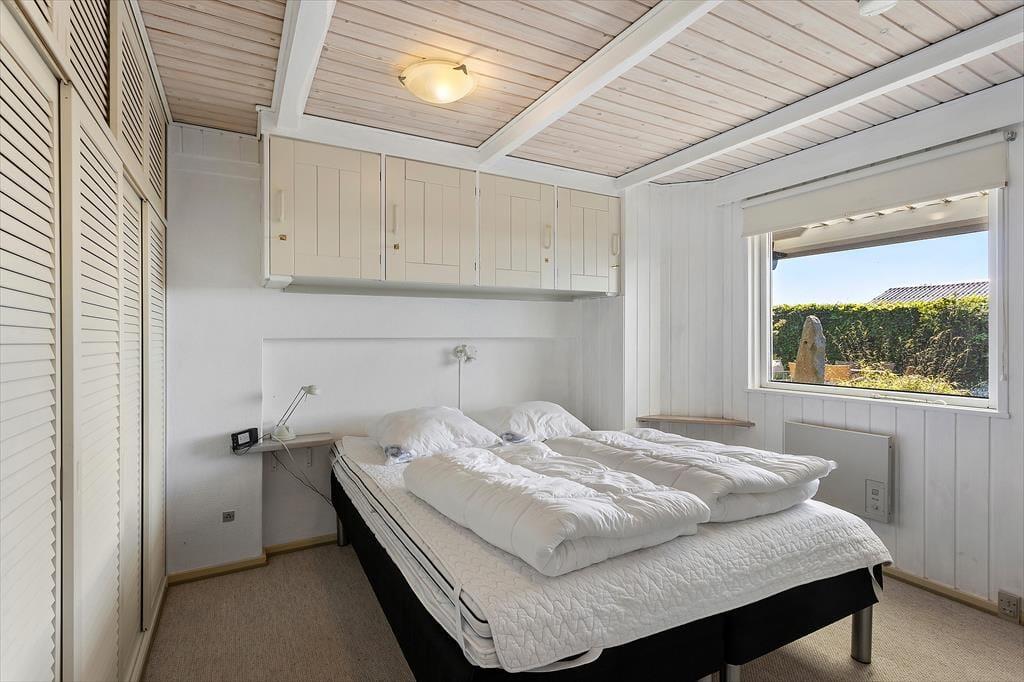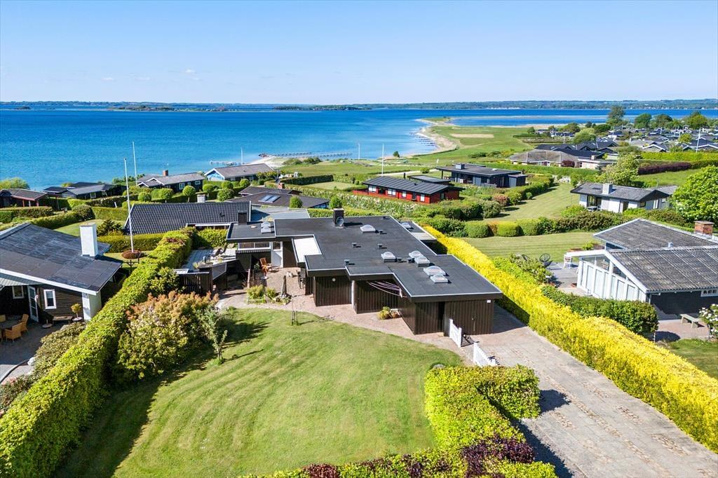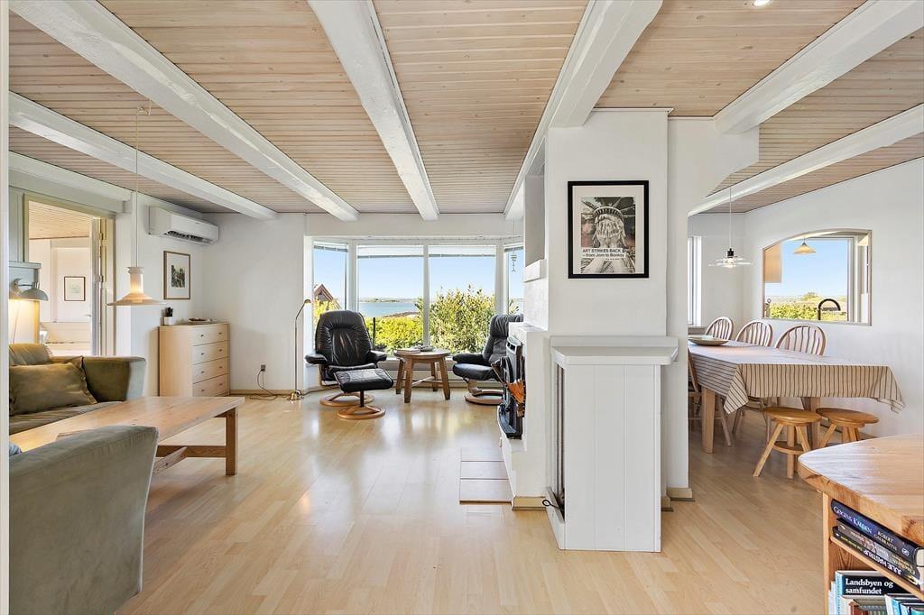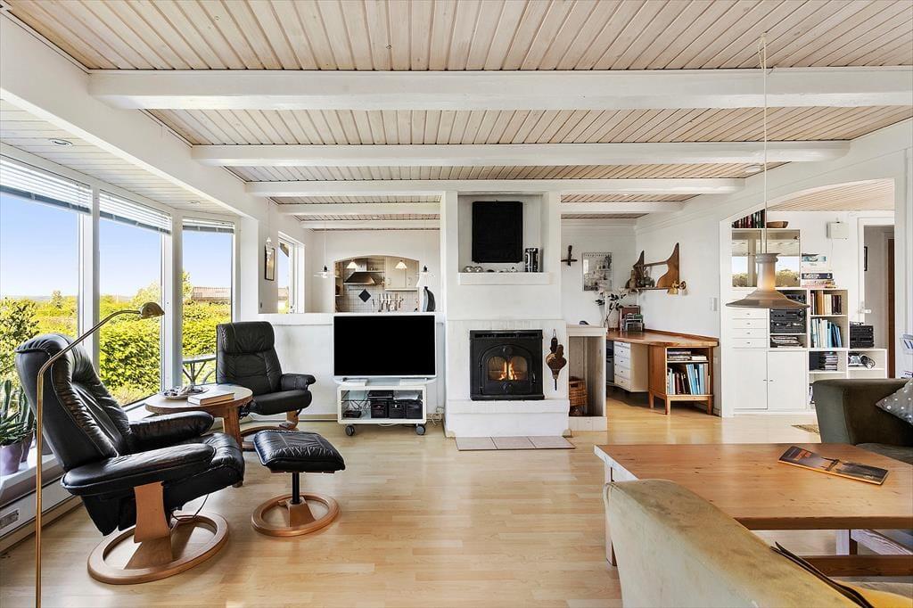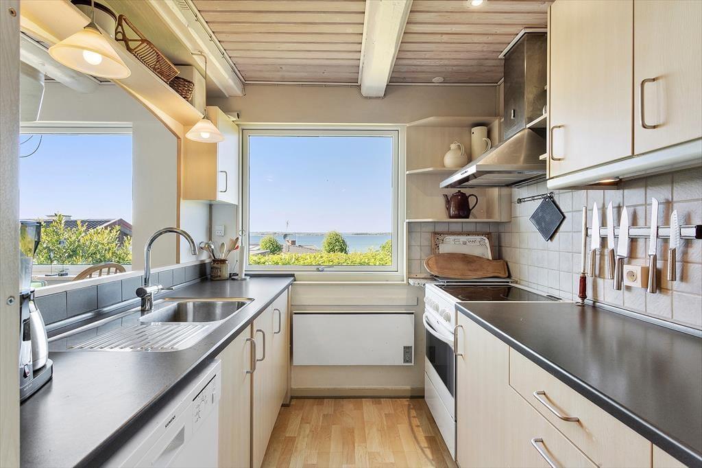 Rummeligt feriehus med plads til 8 personer. I huset er der et veludstyret køkken i åben forbindelse med spiseplads. Herfra er der adgang til en hyggelig opholdsstue med brændeovn og udsigt til vandet. Herudover er der en spisestue med udgang til terrasse, et godt badeværelse med bruser og 3 gode soveværelser. Der er desuden endnu et badeværelse kun med bruser (ikke toilet) samt en vaskemaskine. Fra terrassen er der adgang til et yderlige soverum.