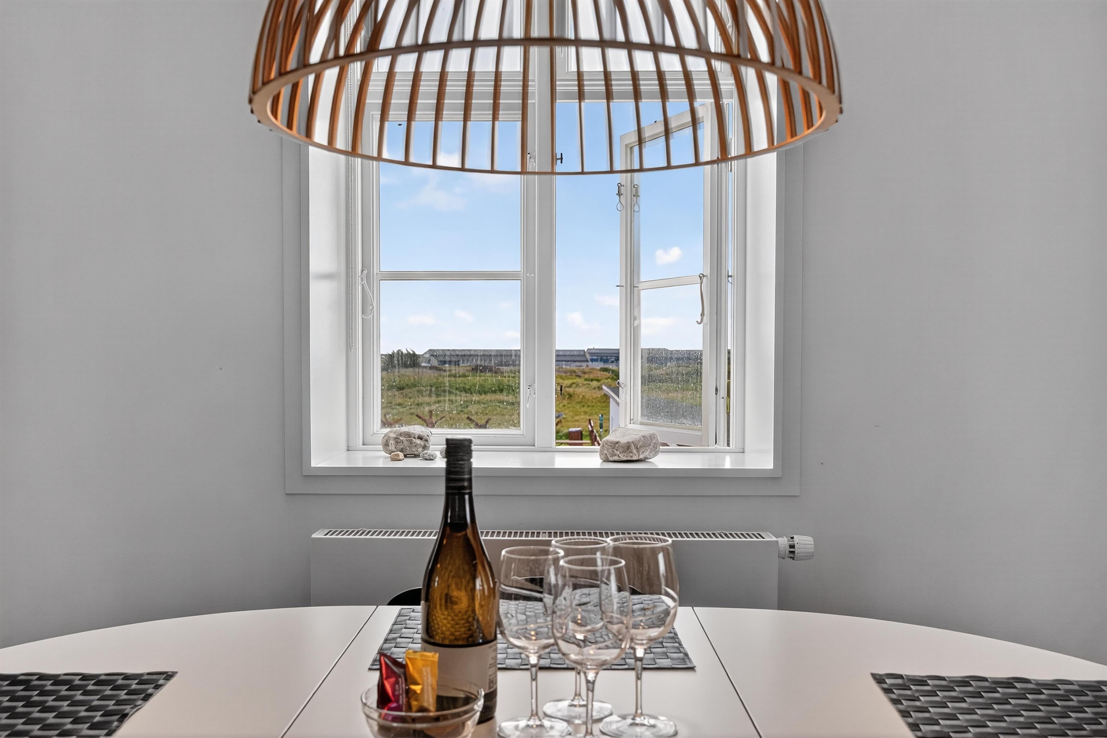 Lejligheden emmer af kvalitet og velvære. Det åbne opholdsrum rummer et fuldt udstyret køkken, en hyggelig spiseplads og et komfortabelt sofahjørne, hvor I kan nyde en kop kaffe med udsigt til fyret og havet. Den franske altan kan åbnes helt op, så I kan lade den friske havluft og lyden af bølgerne strømme ind – det er ægte afslapning på Vestkysten.