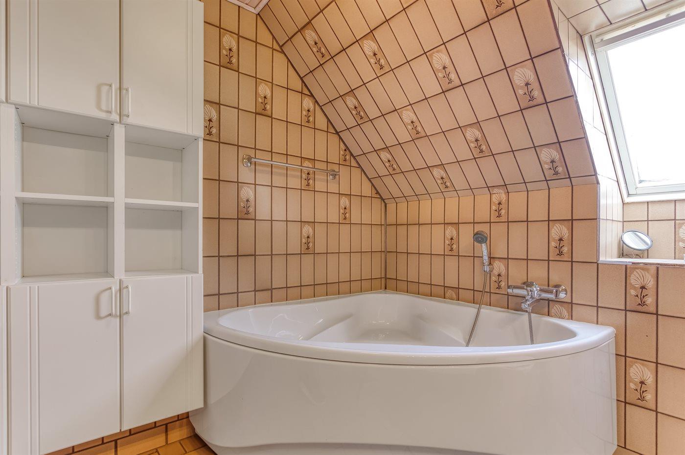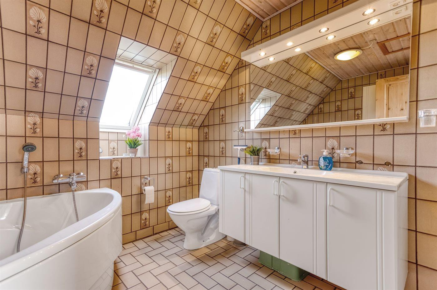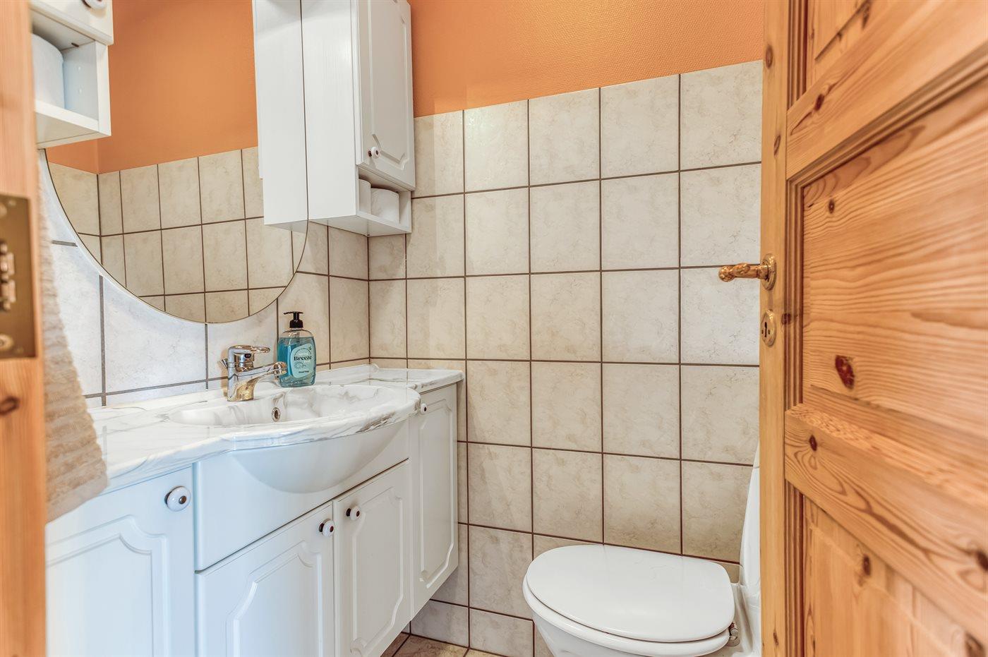 Der er 1 badeværelse med bruseniche og 2 toiletter, heraf 1 gæstetoilet. Der er gulvvarme på 1 badeværelse. Der er gulvvarme på gæstetoilettet.