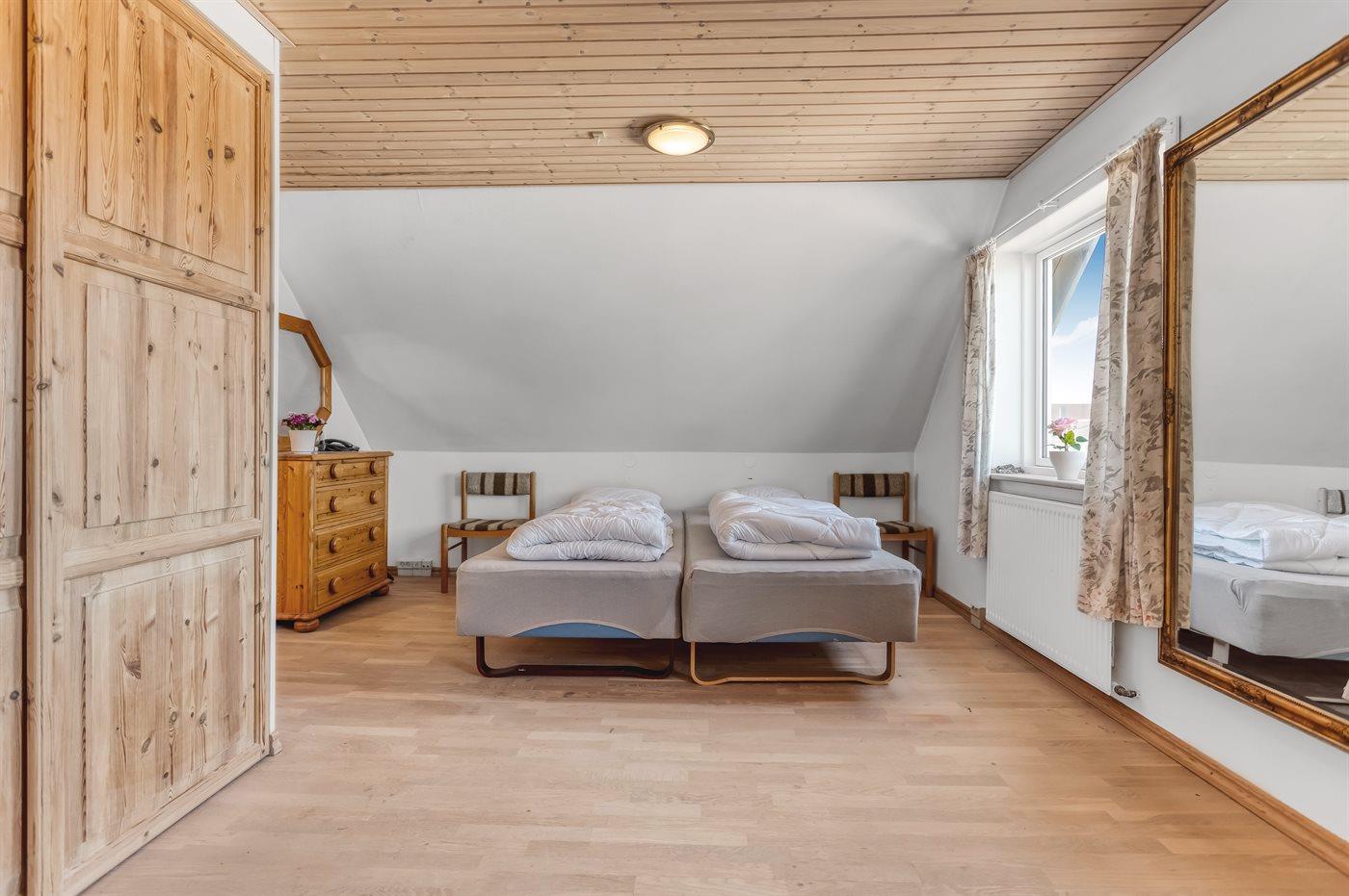 Der er i alt 2 soveværelser. Sovepladserne fordeler sig på: 2 sovepladser i dobbeltseng. 2 sovepladser i enkeltsenge.
