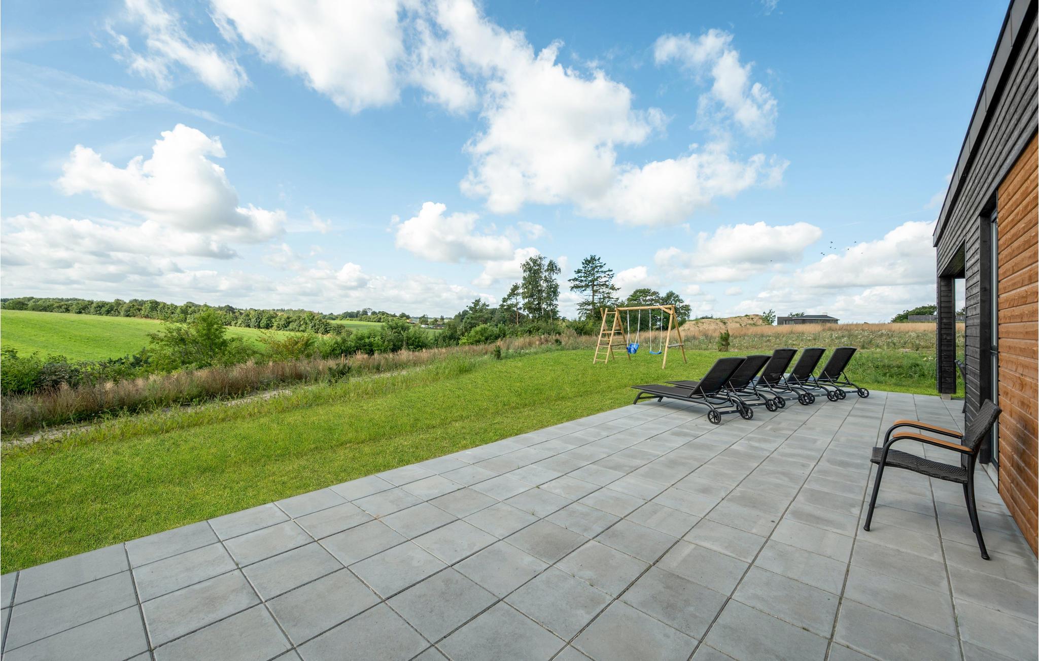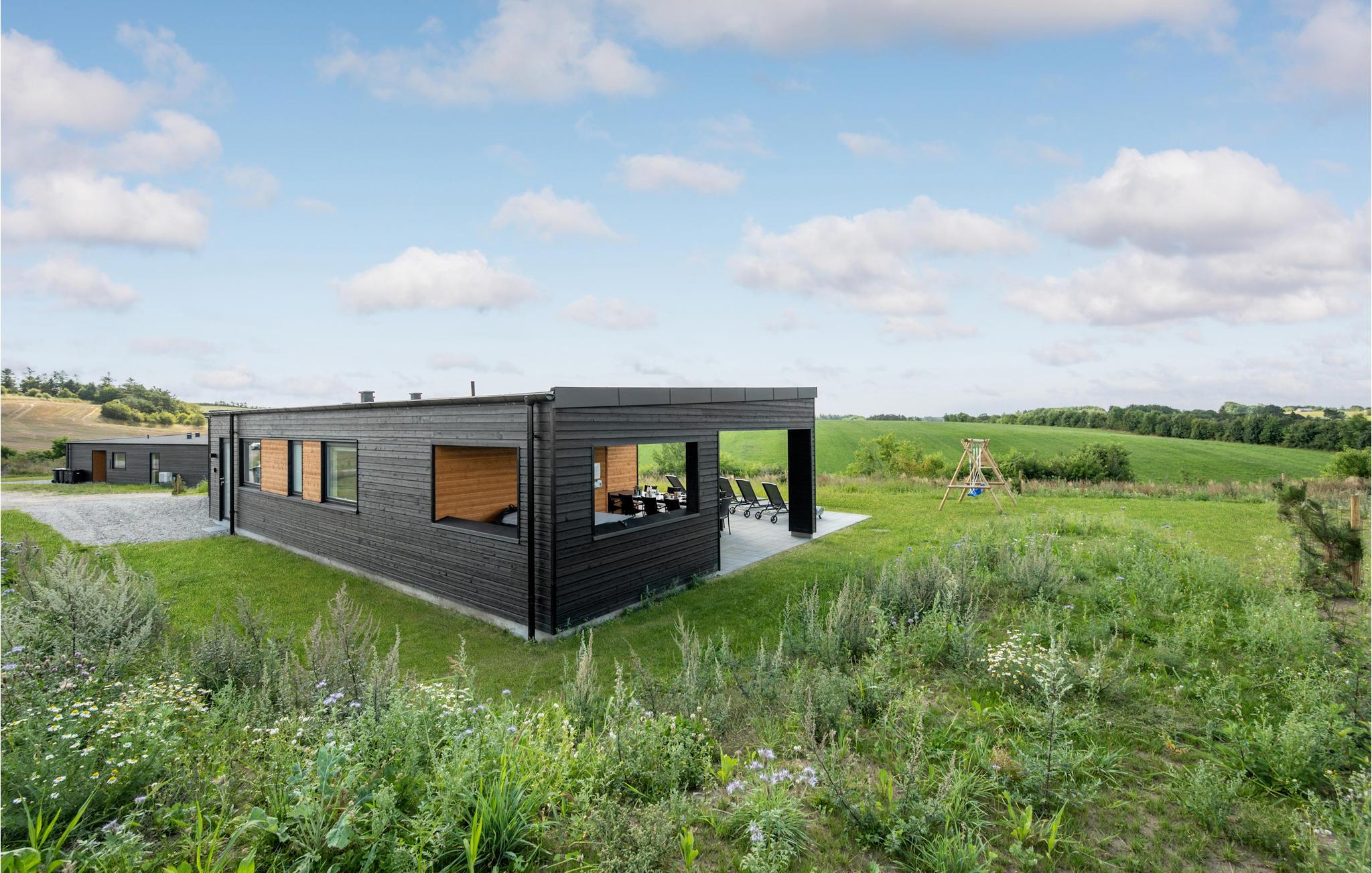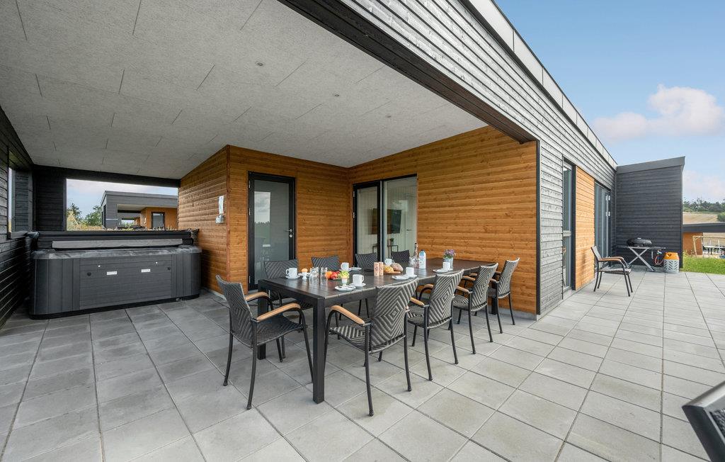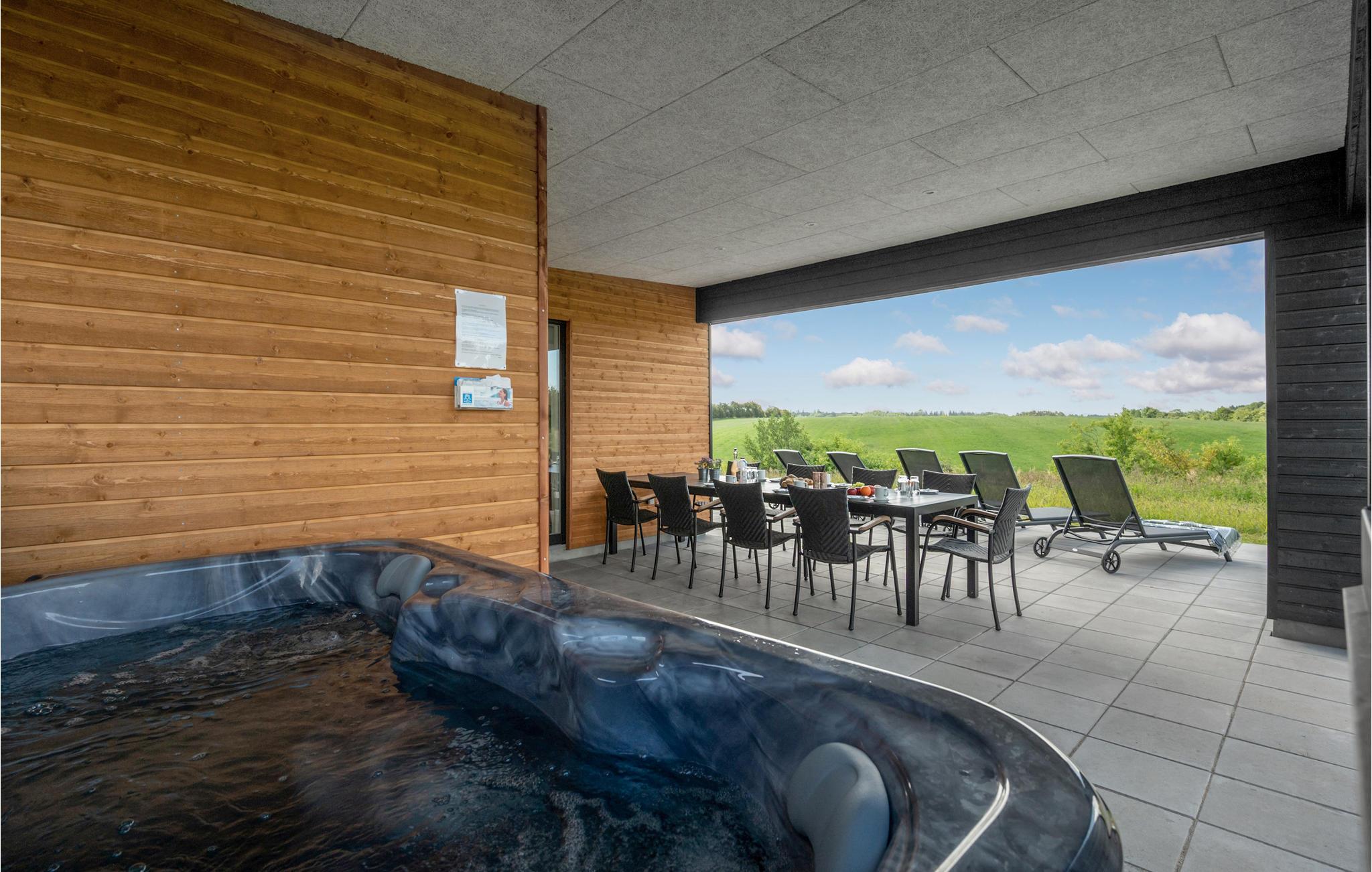 Moderne sommerhus ved Hjarbæk Fjord med jacuzzi, aktivitetsrum og stor terrasse i naturskønne omgivelser.