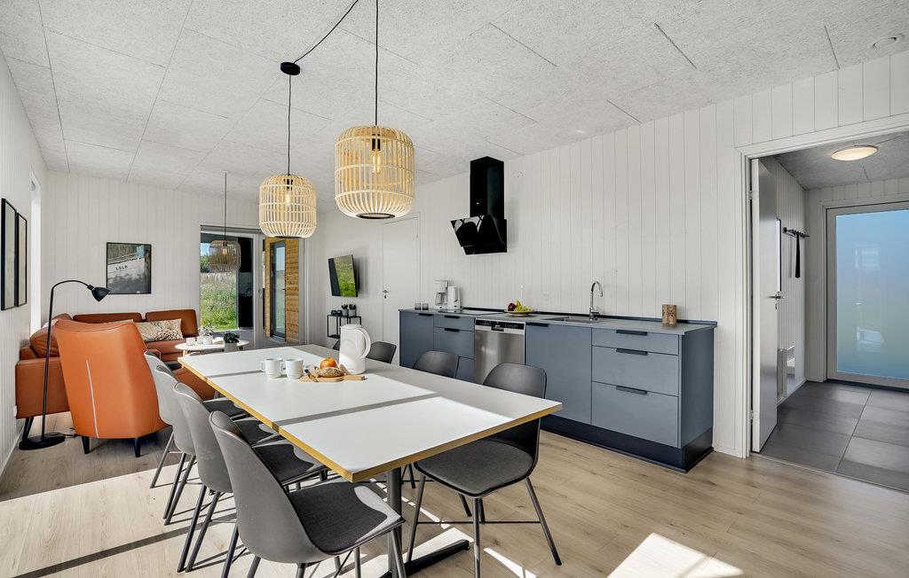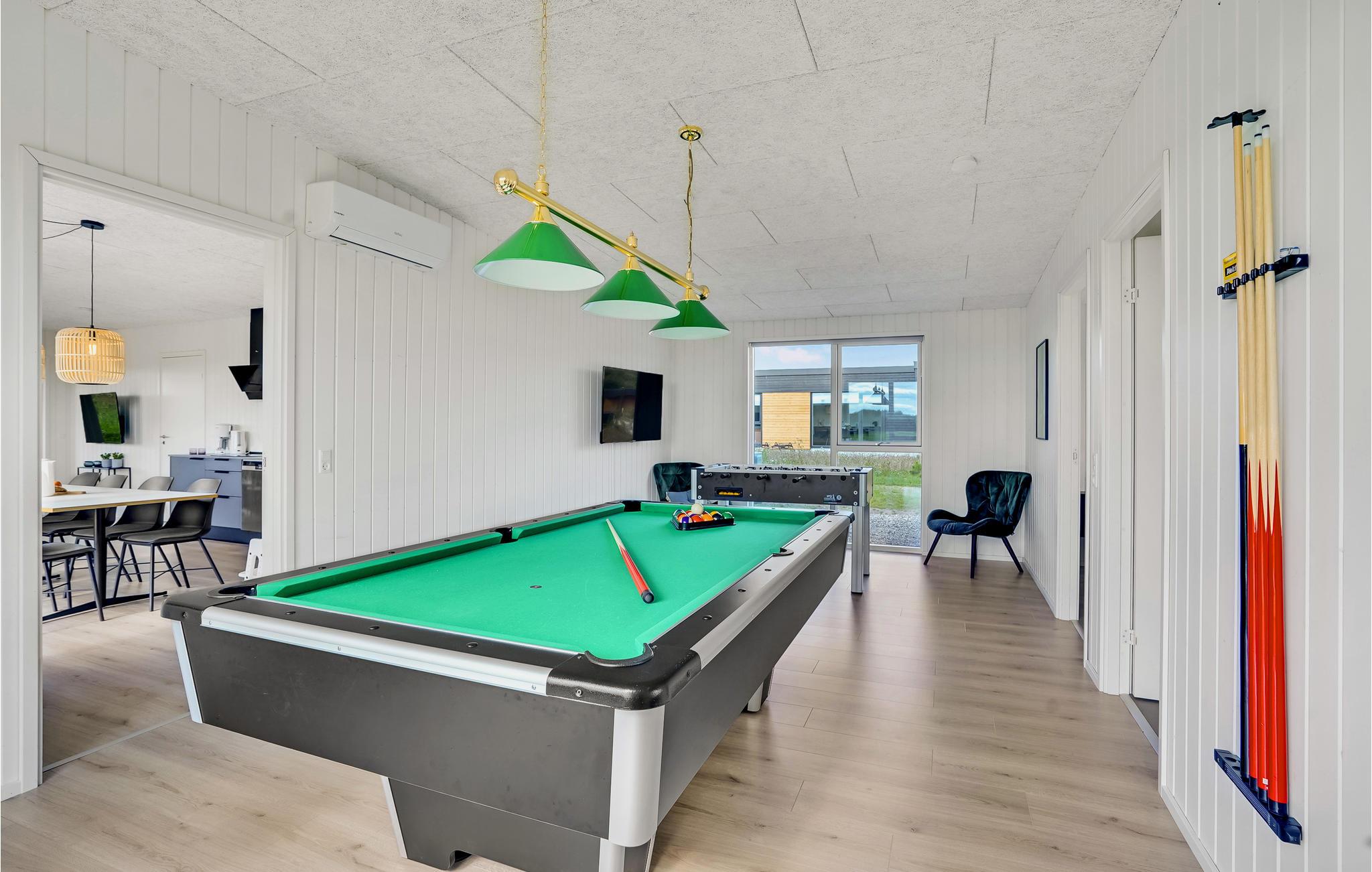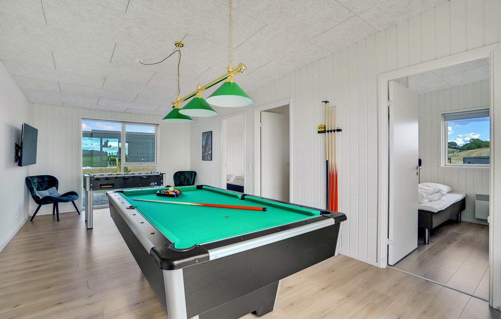 Glæd jer til ferien i dette smukke sommerhus, der kombinerer moderne elementer med hjemlige detaljer. Takket være det åbne opholdsrum og den store vinduesfront fordeles det indkommende lys jævnt og giver jer et rummeligt og lyst rum, hvor I hurtigt vil føle jer hjemme. Træd ud på den delvist overdækkede og åbne terrasse i den velplejede have, hvor I kan nyde et friskgrillet måltid og en opkvikkende morgenmad. Der er også et aktivitetsrum i huset med billard, hvor I kan konkurrere mod hinanden. Slap af i jacuzzien, mens de små gæster nyder legepladsen, og får mange timer til at gå på gyngen og i klatretårnet.