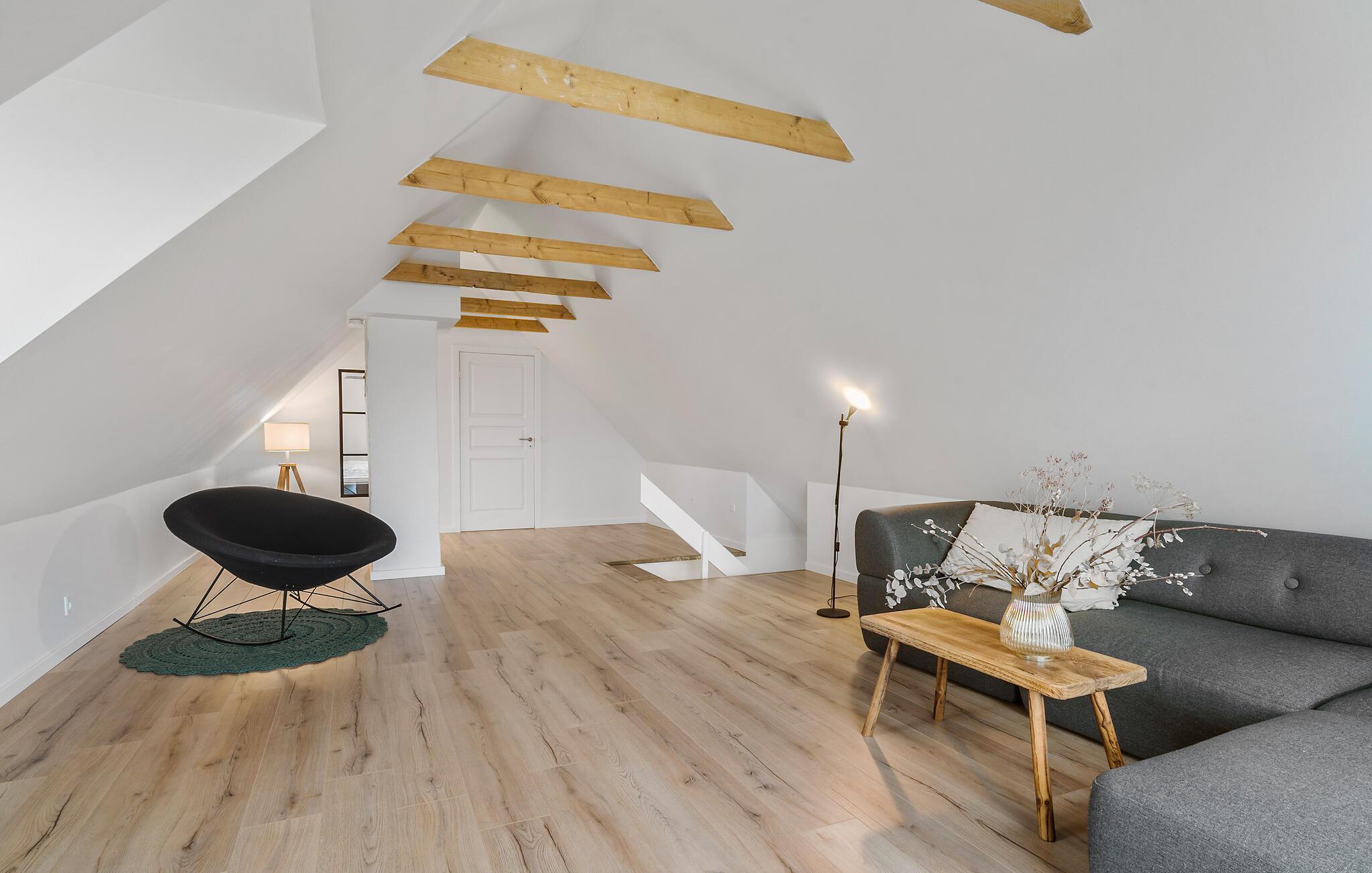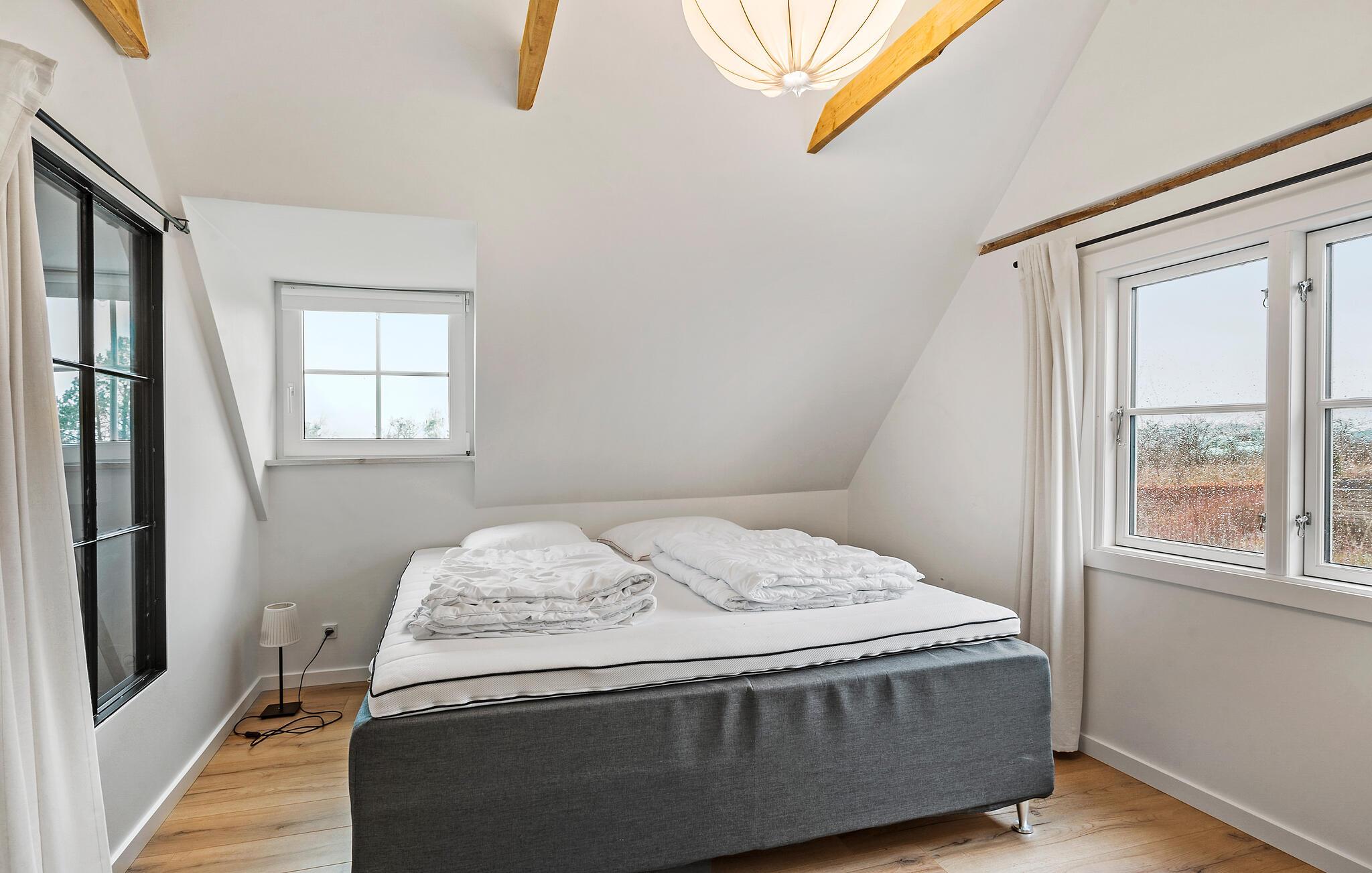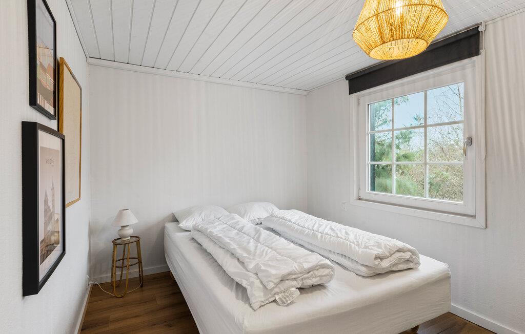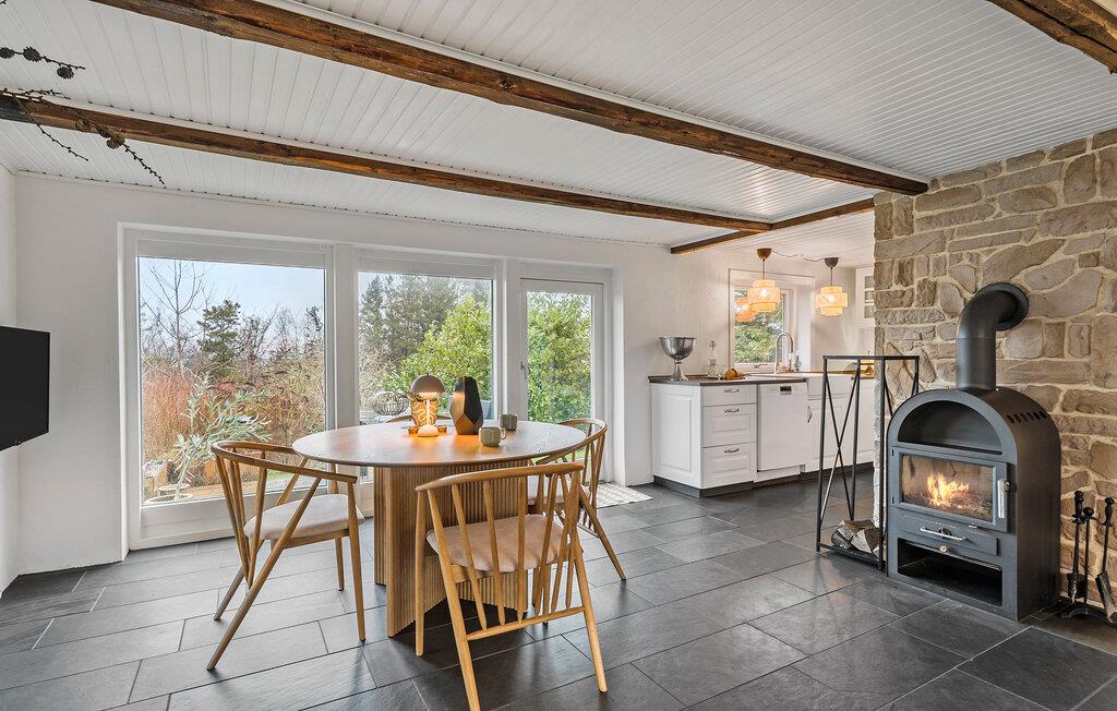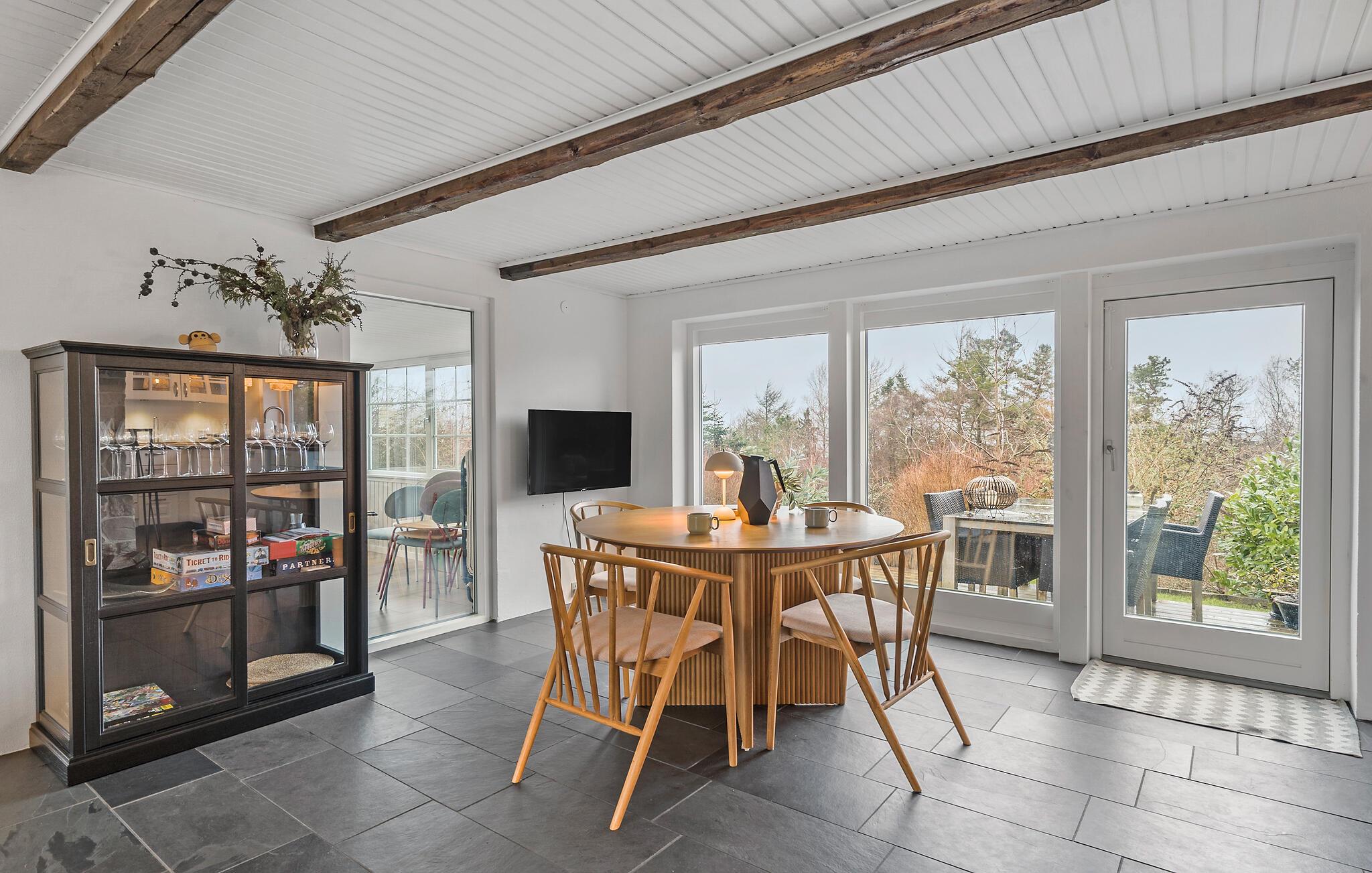 Lad jer inspirere af den særlige atmosfære i dette hyggelige sommerhus og nyd en afslappende ferie nær Hjarbæk Fjord. Så snart I kommer ind, vil I blive overrasket over den lyse og smagfulde indretning. Det åbne opholdsrum med synlige loftsbjælker og store vinduer skaber en indbydende, venlig atmosfære. Find jer godt til rette i de komfortable sofaer og nyd den hyggelige varme fra brændeovnen på kølige aftener. Det moderne køkken lægger op til at tilberede lækre ferieretter sammen, mens den hyggelige spiseafdeling i træ byder på perfekte betingelser for fælles måltider.