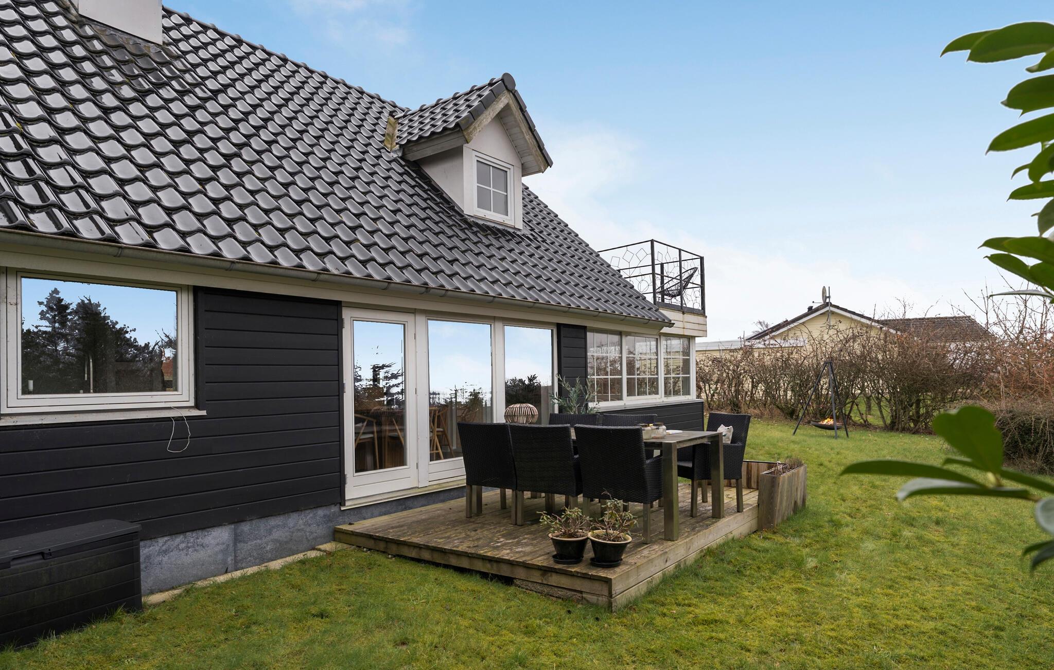 Udeområdet lover ren afslapning med en lille terrasse og et rummeligt haveområde. Altanen på øverste etage inviterer også til at nyde den friske luft. Her kan I lade blikket vandre ud over det grønne landskab og fjorden. I slutningen af ??dagen, samles med familien omkring bålpladsen for at afslutte dagen under aftenhimlen.