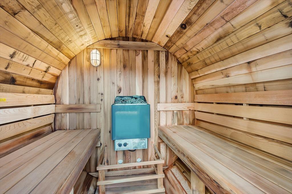 Sommerhusets wellnesskvaliteter fortsætter ude i det fri, for på terrassen står en saunatønde og en udendørs spa. Terrassen er stor og solrig, så I kan også finde en god liggestol at slå jer ned i – og hvis I slet ikke har lyst til at forlade haven, kan I sågar tilbringe natten i shelteret. Legebørn i alle aldre kan hygge sig med at spille haveskak, volley og fodbold, og de yngste kan hoppe på trampolin og gynge.