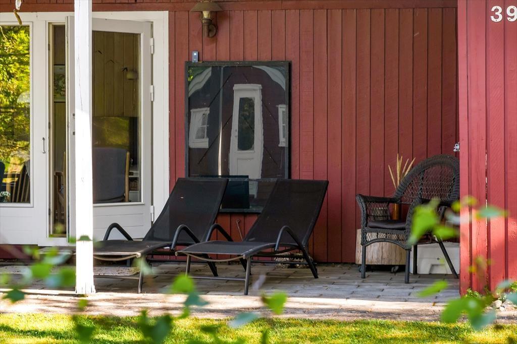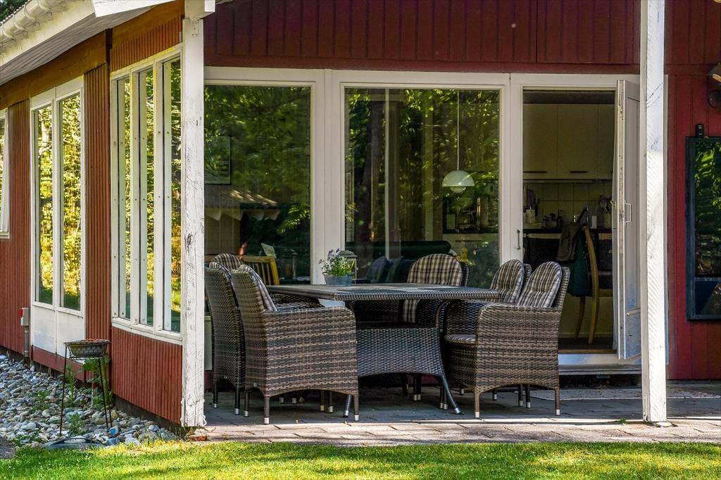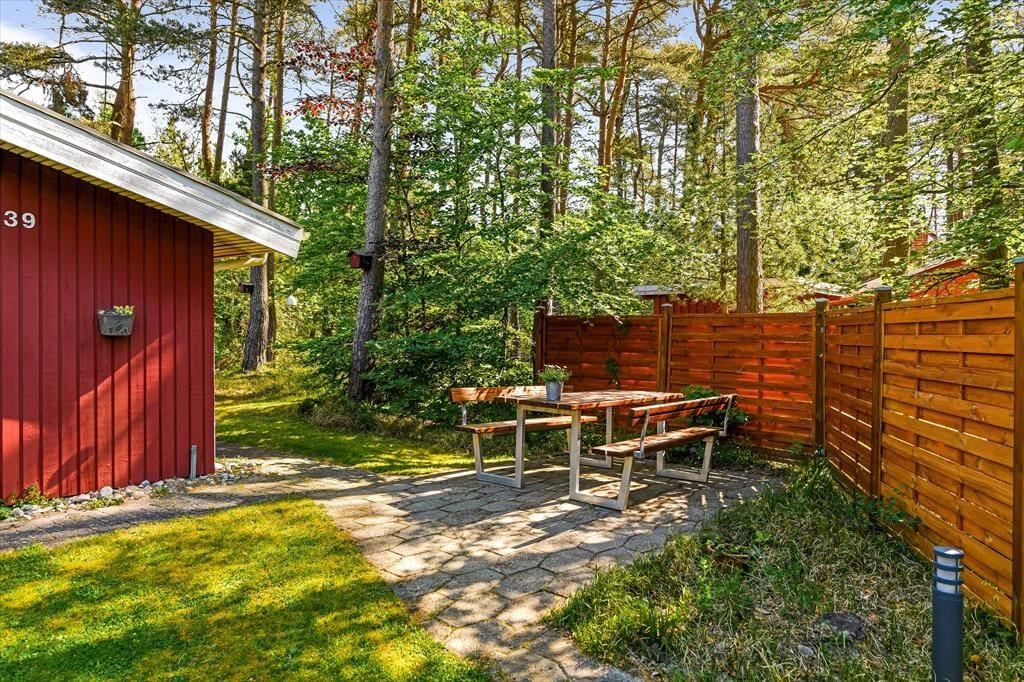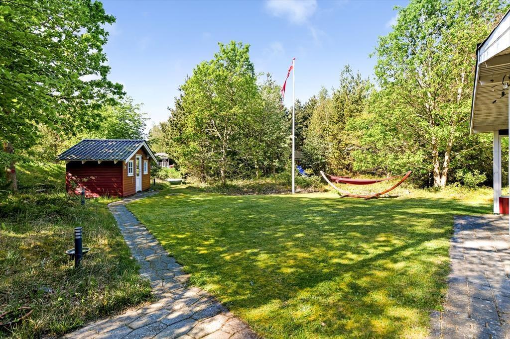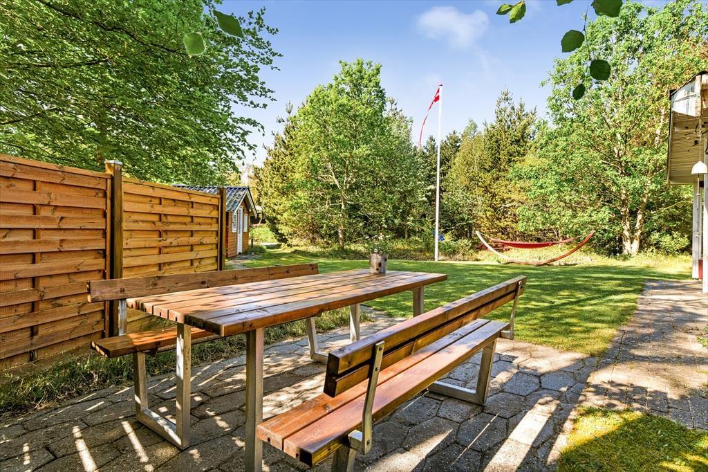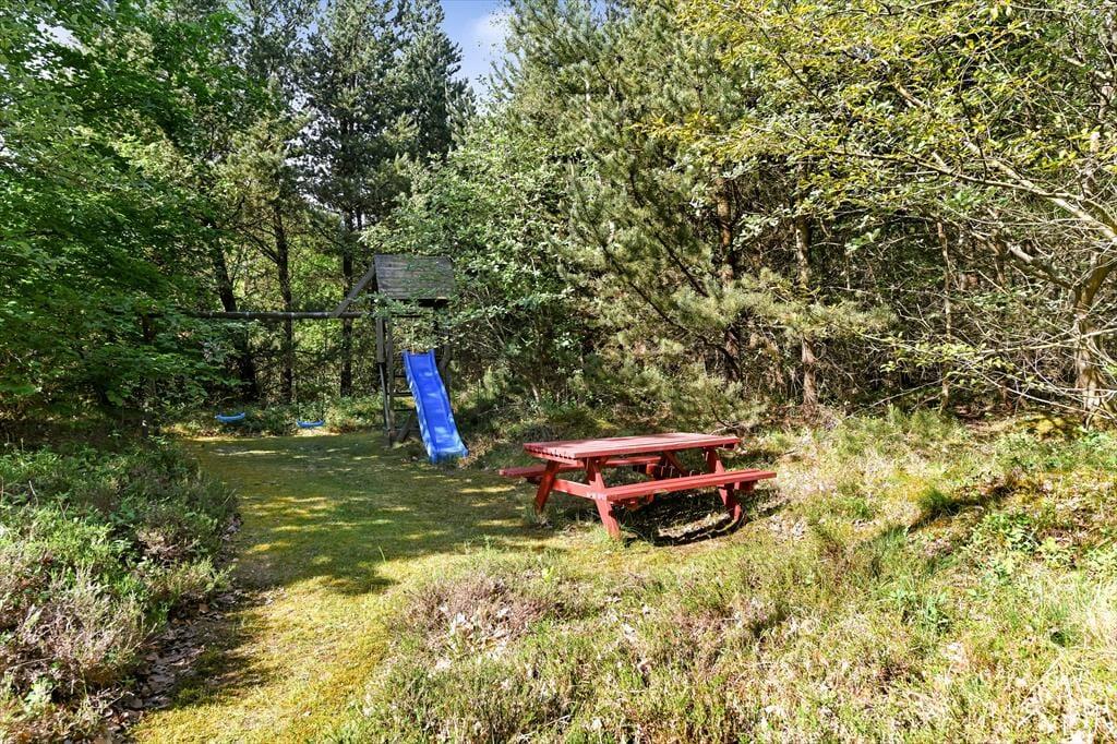 Fra stuen har du adgang til en stor overdækket terrasse, men det er kun én af mange dejlige opholdspladser på den 2572 m2 store naturgrund. Der er derudover flere åbne terrasser at vælge imellem, og hvis børnene vil rutsje og gynge, kan de voksne sætte sig og få noget koldt at drikke ved bord-bænke-sættet lige i nærheden. Træer og anden naturskøn bevoksning skærmer udearealerne godt af, og med fuglesang og frisk luft føles det nærmest som at bo i et skovbryn – hvilket giver god mening, fordi plantagen breder sig lige på den anden side af Tane Hedevej.