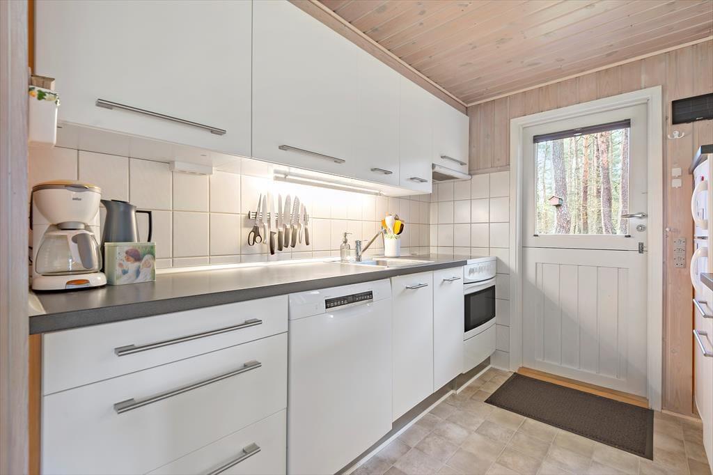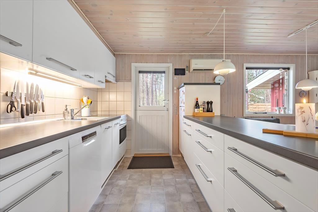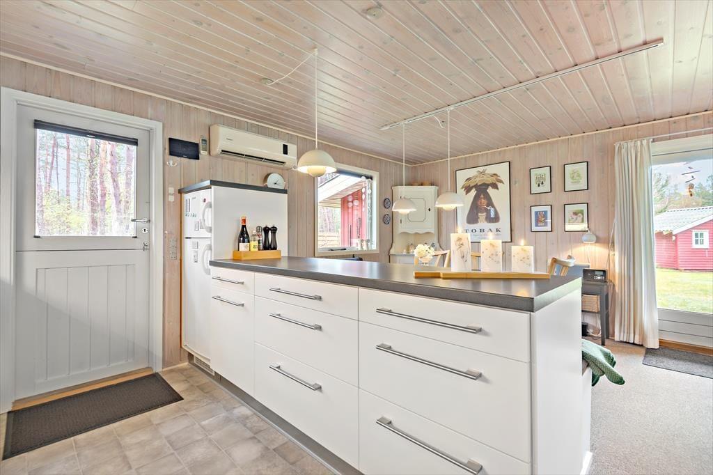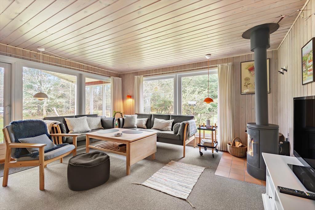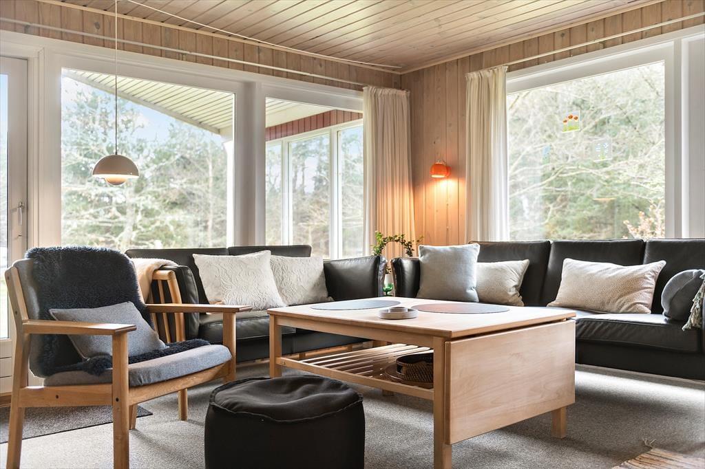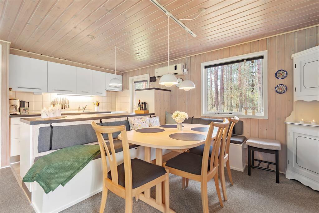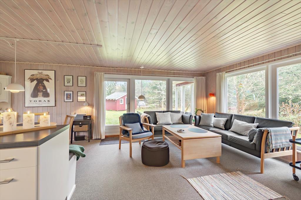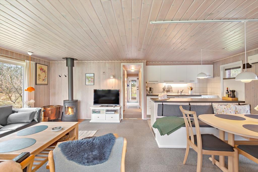 Hvis du har planer om at holde en aktiv ferie i naturen, er Ho et oplagt sted at søge hen. Men når du bor i et hyggelig sommerhus som dette, er der nu også god grund til at lægge en masse pauser ind, for det er skønt bare at tage den med ro inden døre. Tænd op i brændeovnen, sæt kaffe over i det åbne køkken, og find en god siddeplads i stuens sofaarrangement! Spisebordet er et dejligt sted at samles til brætspil, gode middage eller bare en hyggesnak, og når det er sengetid, kan du se frem til en god nats søvn på et af husets tre soveværelser.