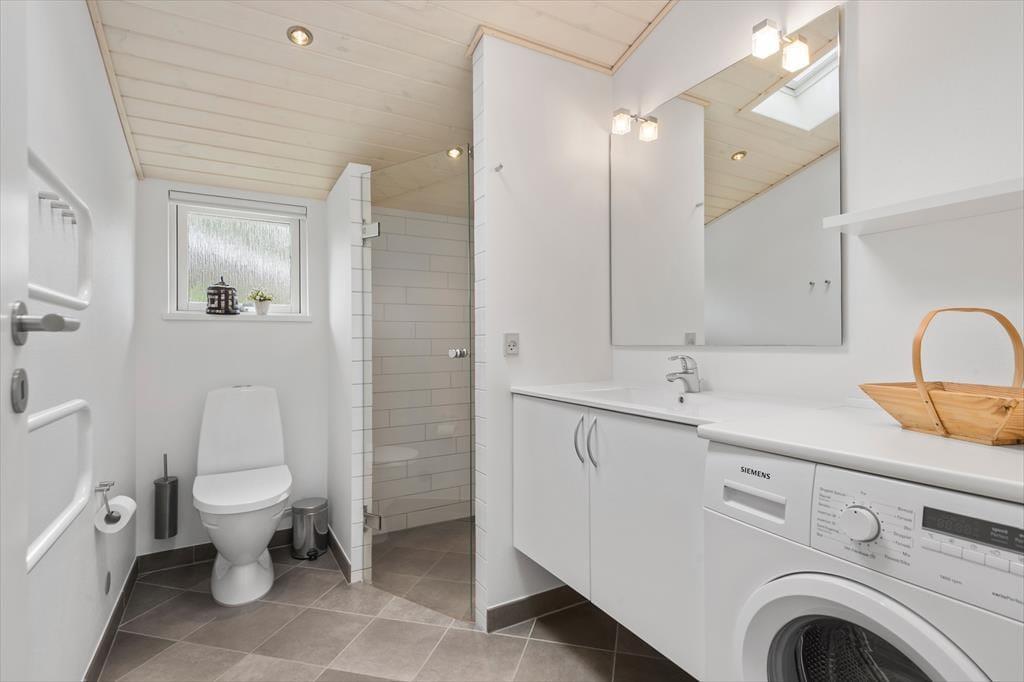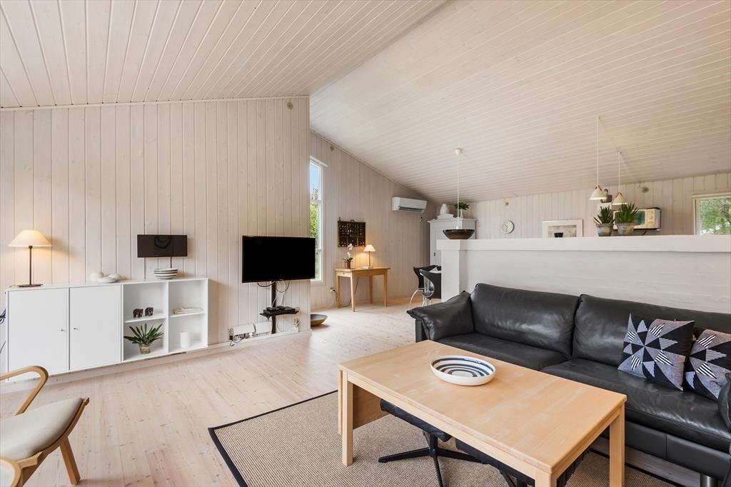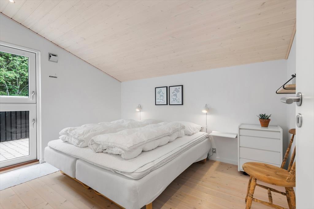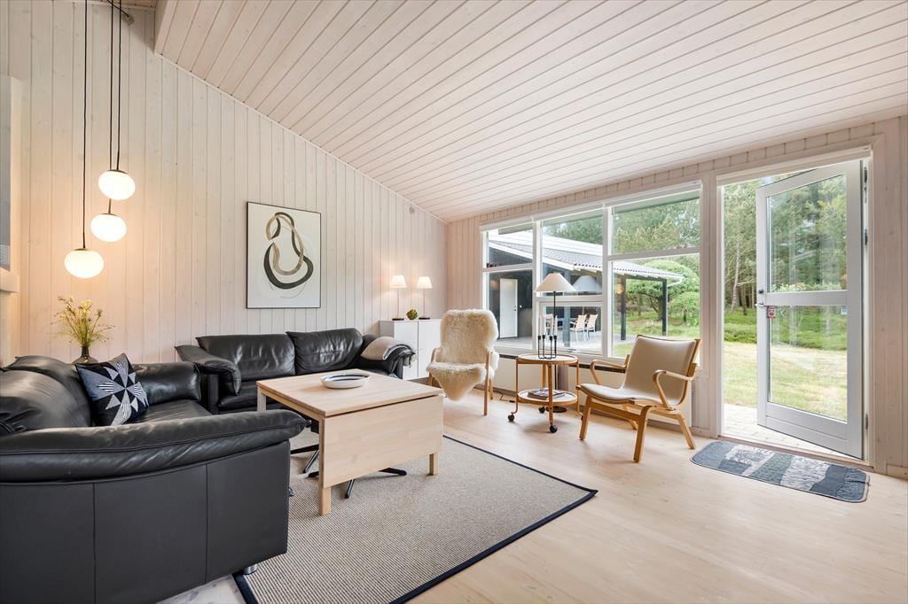 Mens sommerhusets indre er klædt i lyse farvetoner, er det grøn i alle nuancer, der pryder naturgrunden. I sæsonen lyser lyngen op med sin klare lilla farve, og med frit udsyn til den høje blå himmel, bliver det ikke meget smukkere end her i de fredelige omgivelser. På det flisebelagte og dejligt ugenrede terrassemiljø har du rig mulighed for at finde både sol og læ– og skygge, hvis det er det, du går efter – og så kan du endda se frem til at sidde komfortabelt i havemøblerne. Til børnene er der magien at gå på opdagelse eller lege fangeleg i de smukke naturomgivelser.