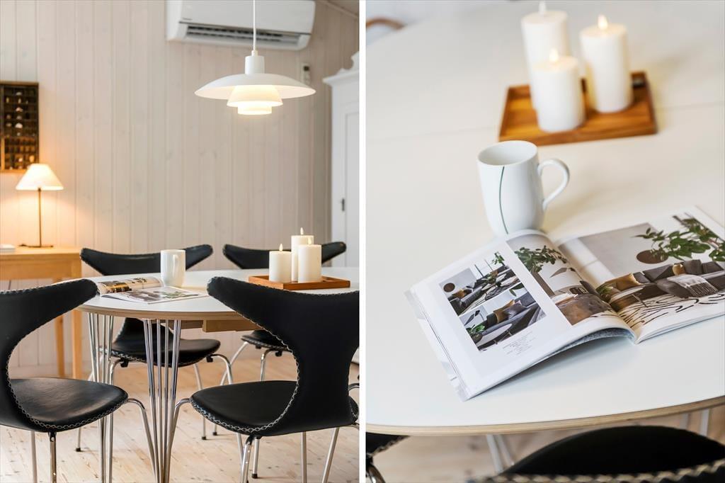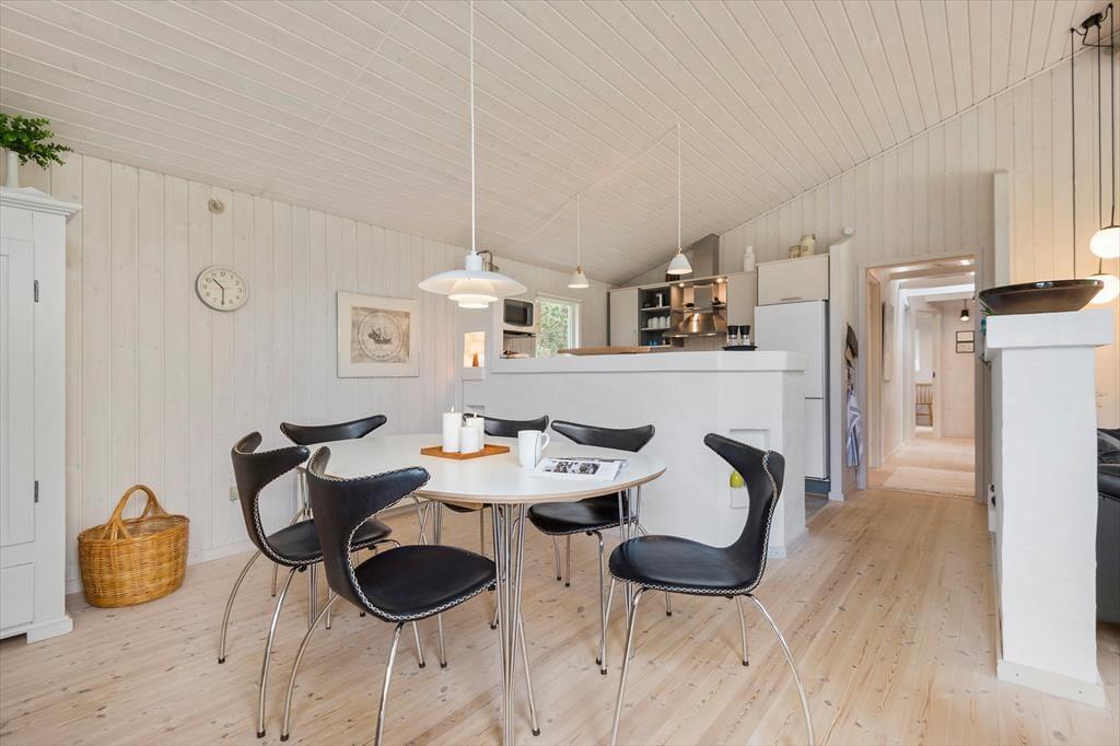 Sommerhusets stue vil sikkert være der, hvor de fleste af indelivets vågne stunder bliver tilbragt. Her kan du nyde det smukke lysindfald og udsigten til naturgrunden gennem de store vinduer, og hvis du vil drikke kaffe, mens du sidder der og kigger ud, kan du hurtigt smutte hen til det åbne køkken for at brygge en kop eller en hel kande. Spisebordet er et rart sted at samles, uanset om I vil spise, spille brætspil eller bare hyggesnakke om alt mellem himmel og jord. Og når det er tid til at sige godnat, kan du og dit selskab fordele jer på husets tre gode soveværelser – selvfølgelig efter at I lige har rundet badeværelset for at børste tænder.