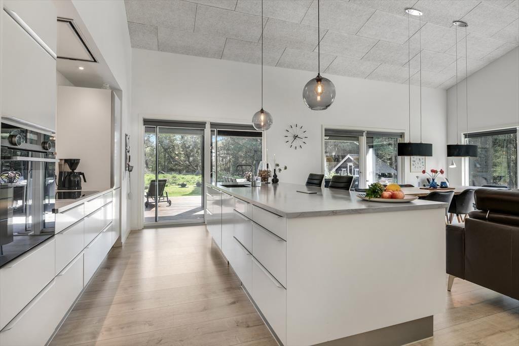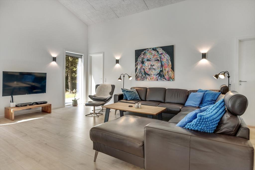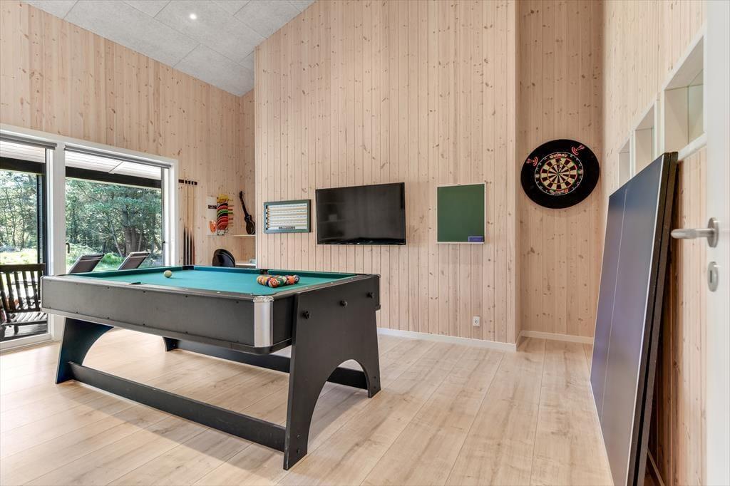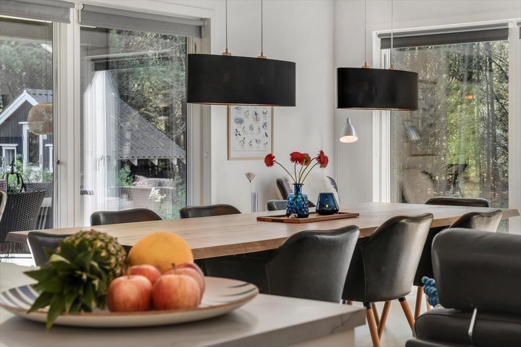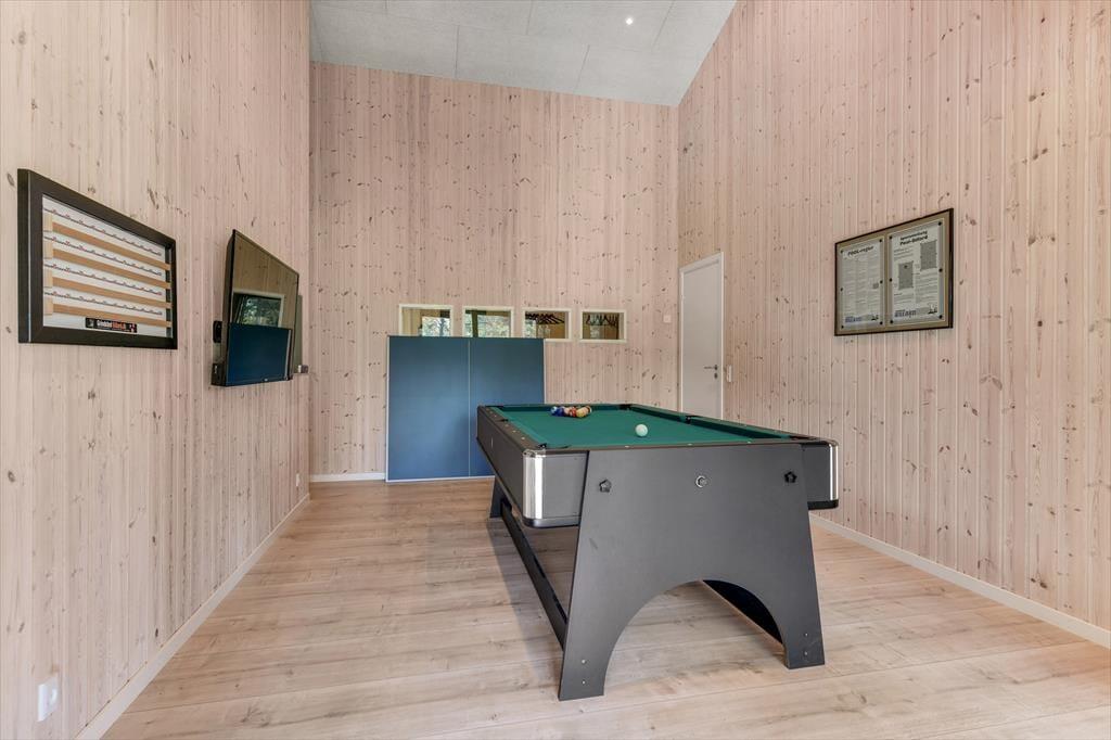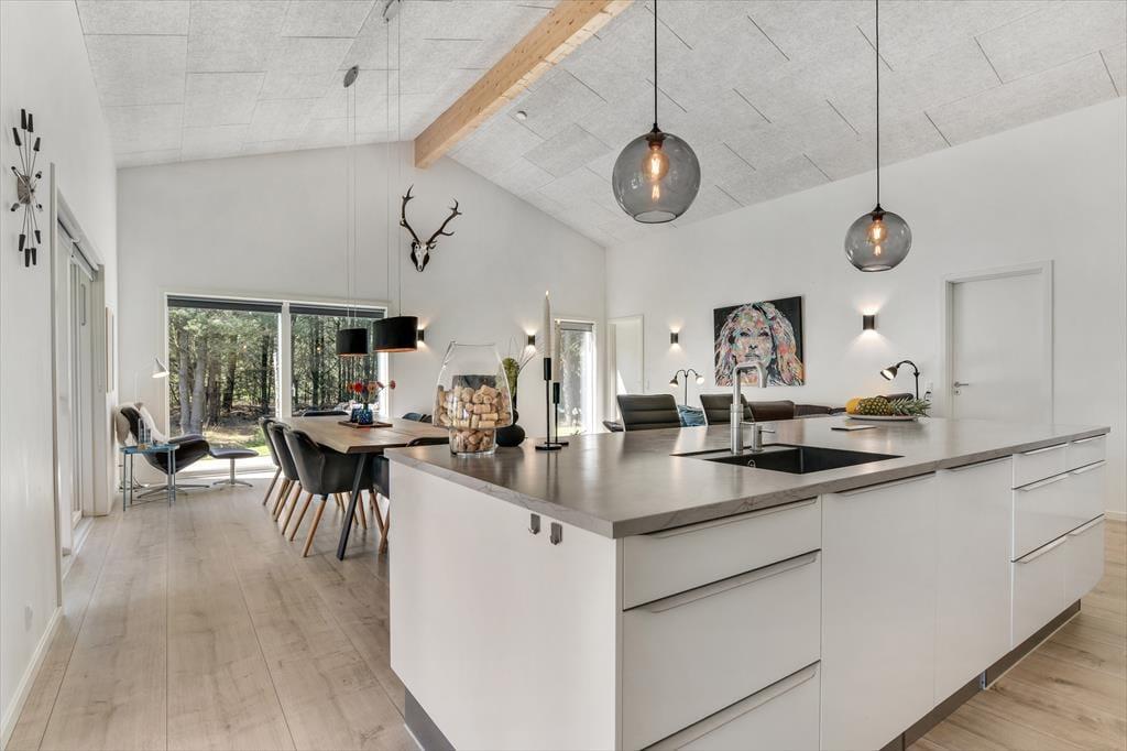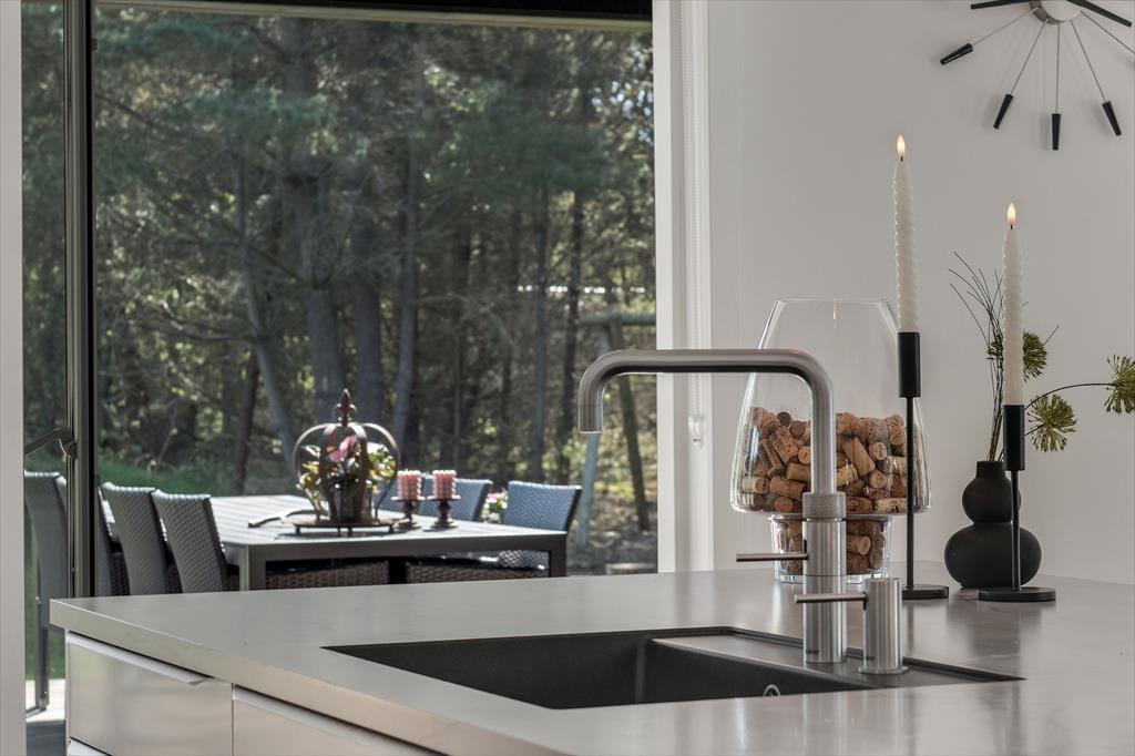 Med en planløsning på hele 165 m2 har du og familien masser af plads inden døre, og fordi der er fire soveværelser og to badeværelser til rådighed, kan i overveje, om I vil invitere vennerne med på ferie. Der er god plads til alle i det store opholdsrum, hvor I kan slænge jer i sofaafdelingen eller samles ved spisebordet til et veltilberedt måltid. Maden kan du trylle frem i det åbne køkken, der er udstyret med Quooker og andre lækre detaljer – og hvis det ikke er dig, der har køkkentjansen, kan du i stedet sætte dig på en af barstolene for at spise snacks og hyggesnakke med kokken. Alternativt kan du gå ind ved siden af for at spille bordtennis, pool eller airhockey, indtil det er spisetid.