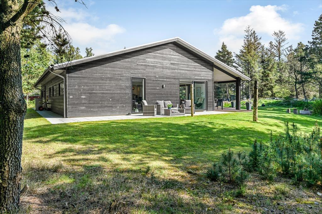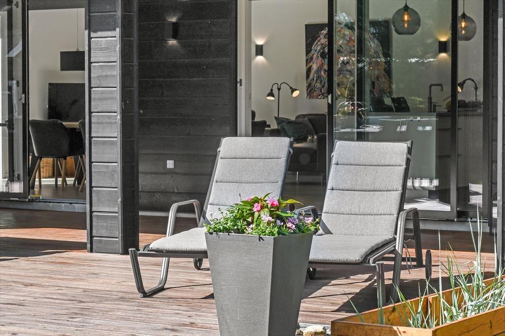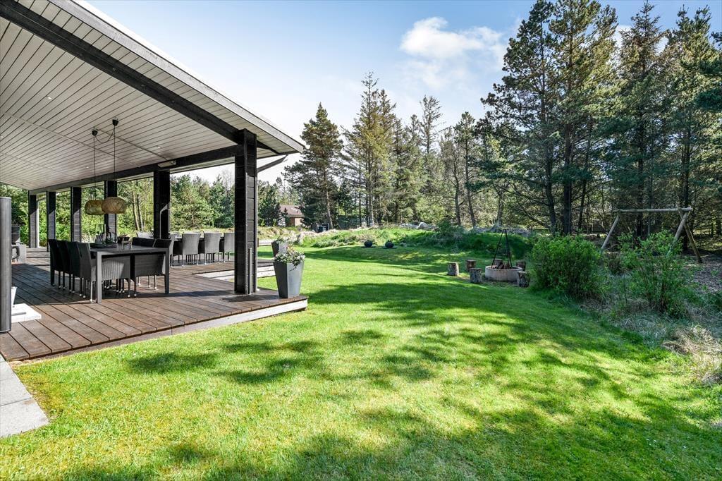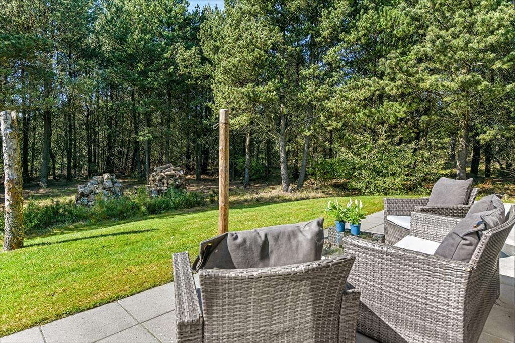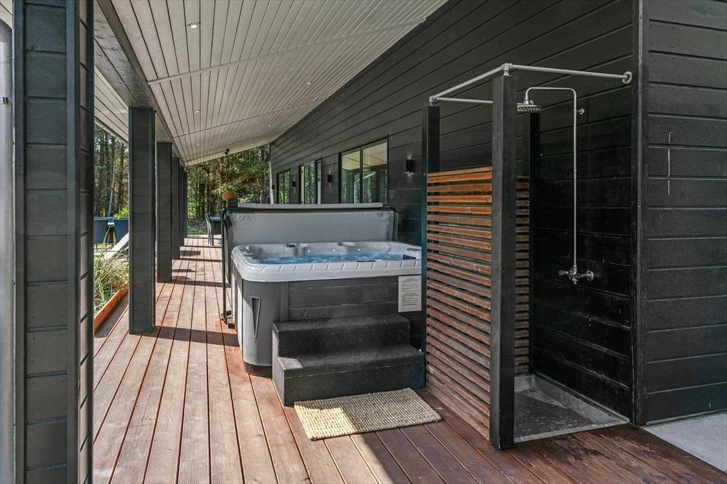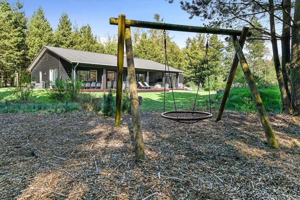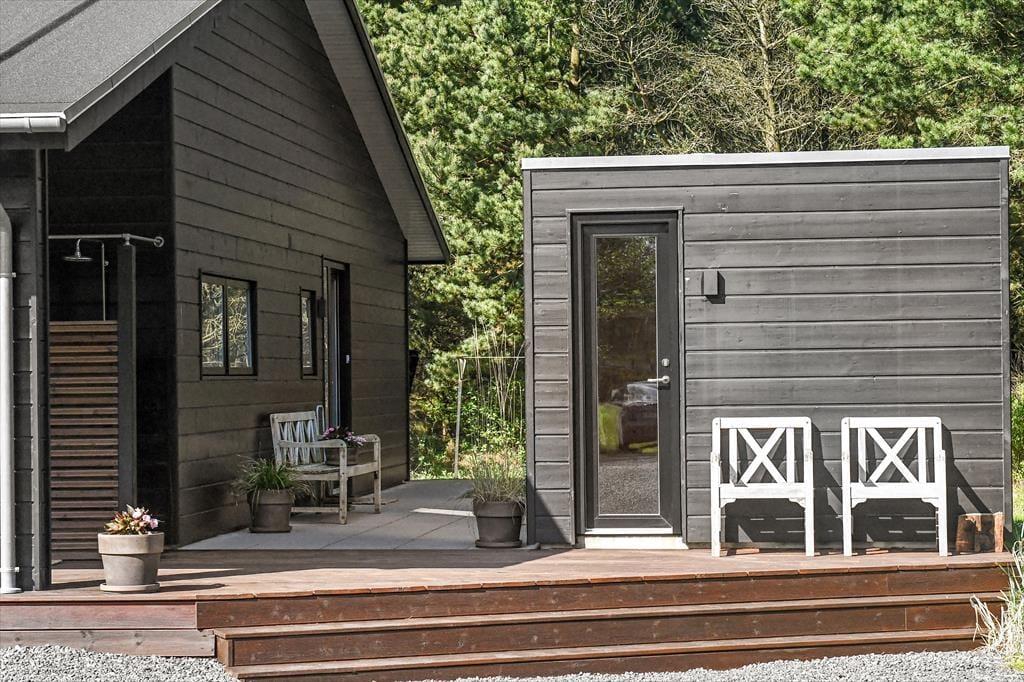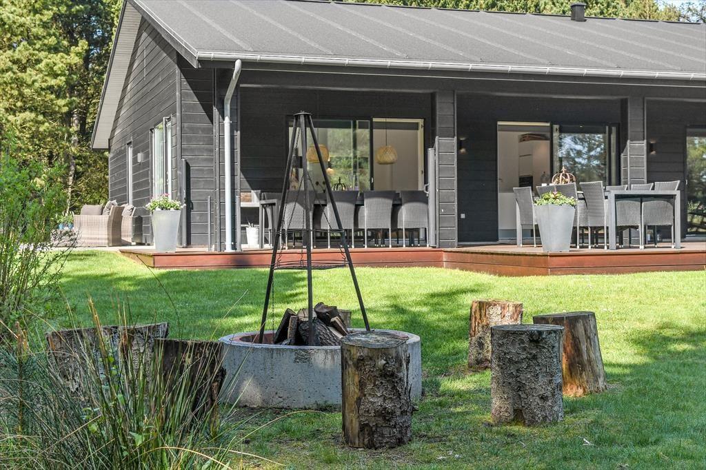 Sommerhusets store naturgrund er det helt rette sted at være, når sommeren viser sig fra sin skønneste side. Ja, faktisk behøver vejret ikke engang at være fabelagtigt, for selv på en kølig dag er det fantastisk at sidde i udespaen eller gå ind i den tilstødende sauna. Der er også en udendørs bruser til rådighed, hvis du vil have et morgenbad til lyden af fuglesang – og når solen kigger frem, kan du slå dig ned i en god havestol på en af husets dejlige terrasser. Rundt om græsplænen skærmes udearealerne af tæt beplantning, og der er blandt andet et gyngestativ og et bålsted at hygge sig med.