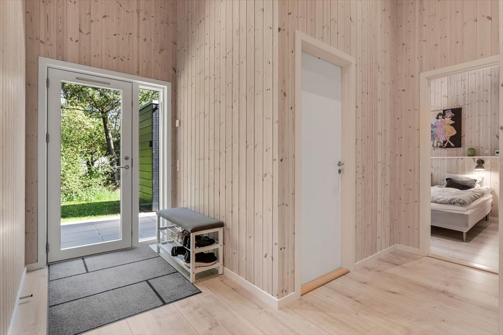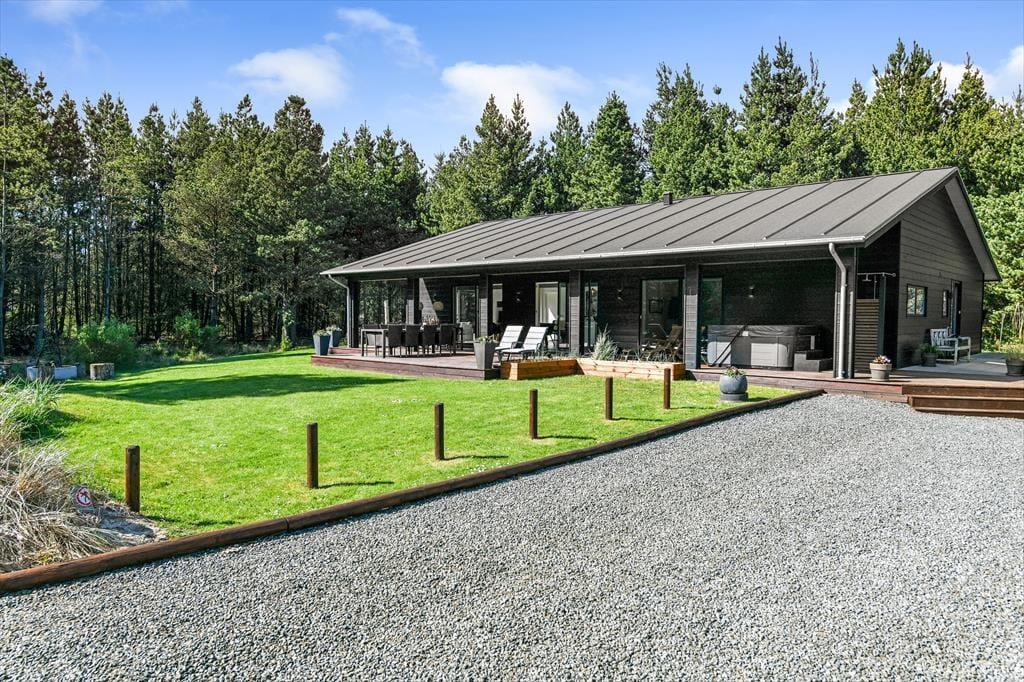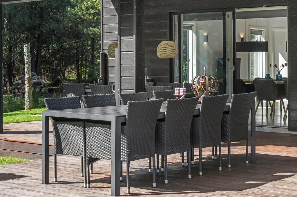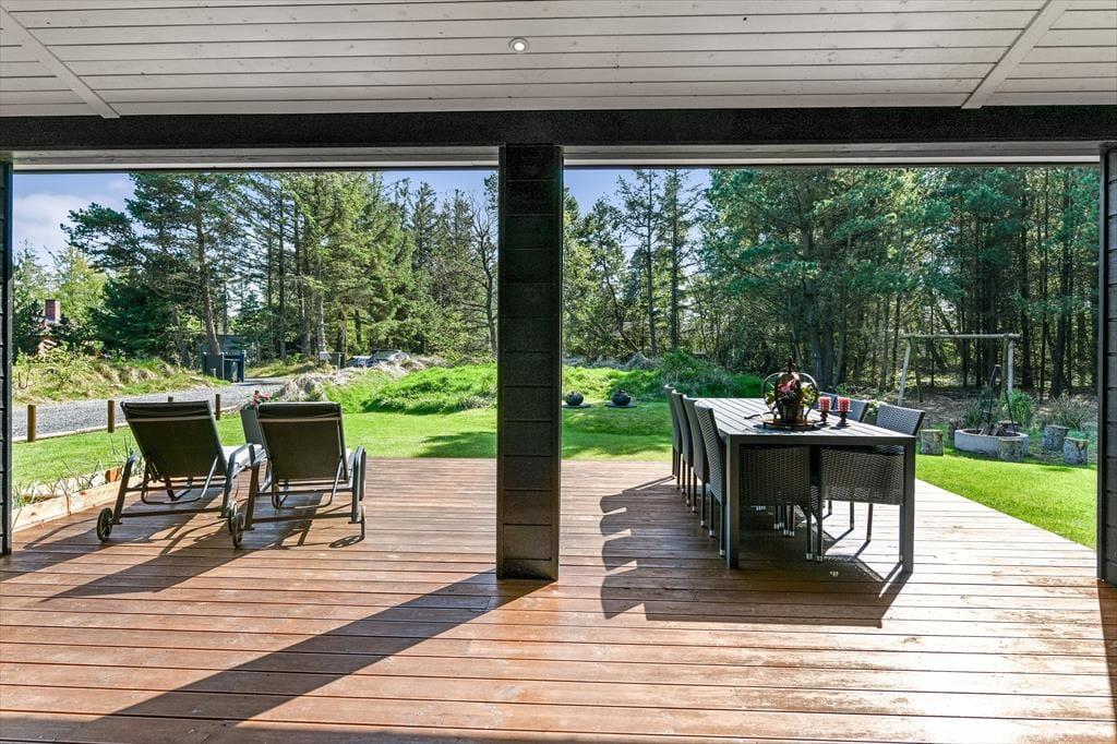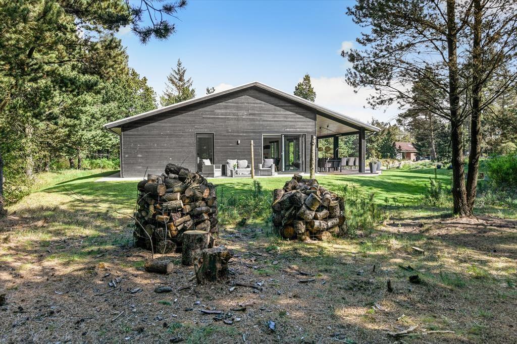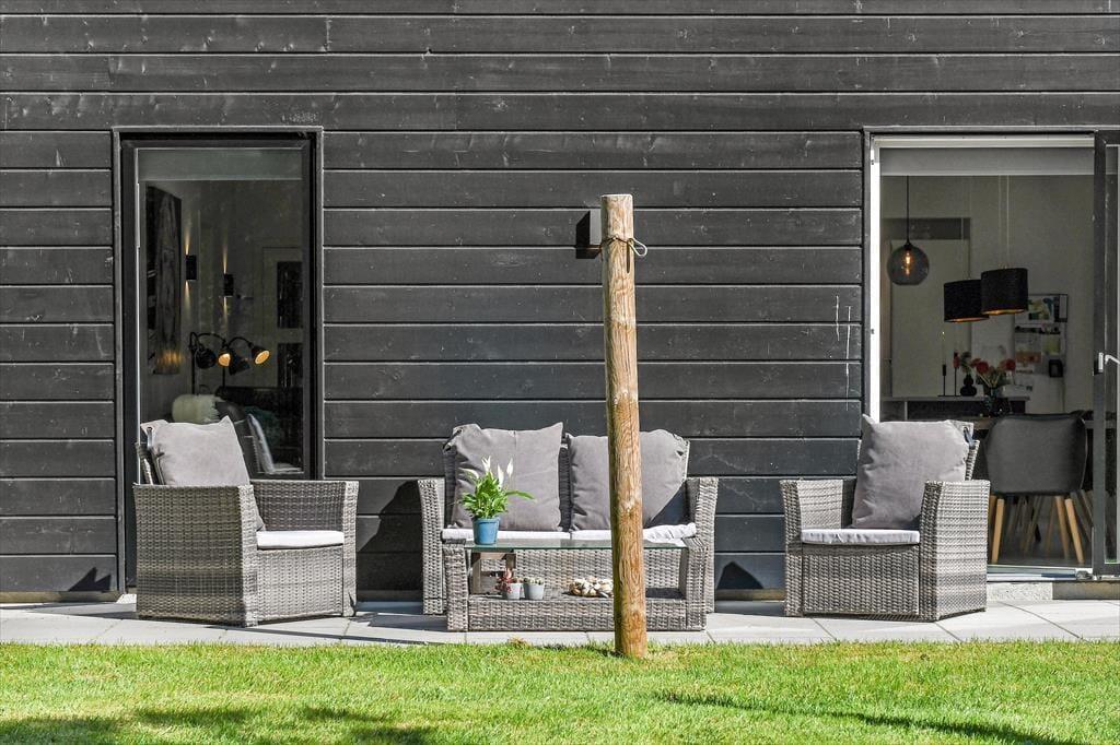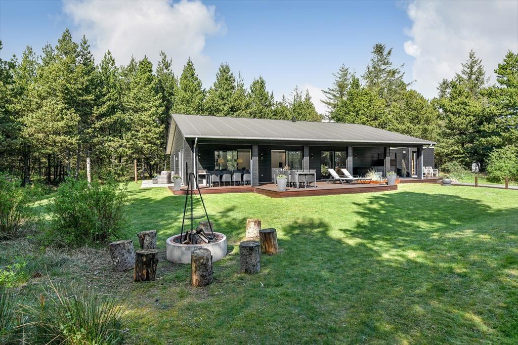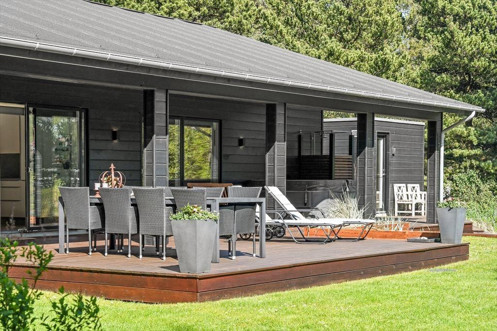 Sommerhusets store naturgrund er det helt rette sted at være, når sommeren viser sig fra sin skønneste side. Ja, faktisk behøver vejret ikke engang at være fabelagtigt, for selv på en kølig dag er det fantastisk at sidde i udespaen eller gå ind i den tilstødende sauna. Der er også en udendørs bruser til rådighed, hvis du vil have et morgenbad til lyden af fuglesang – og når solen kigger frem, kan du slå dig ned i en god havestol på en af husets dejlige terrasser. Rundt om græsplænen skærmes udearealerne af tæt beplantning, og der er blandt andet et gyngestativ og et bålsted at hygge sig med.