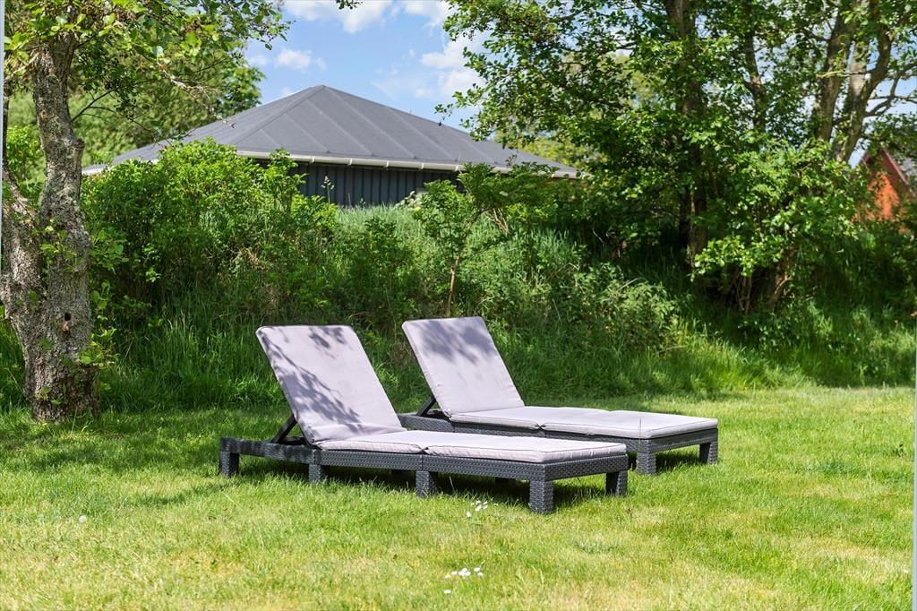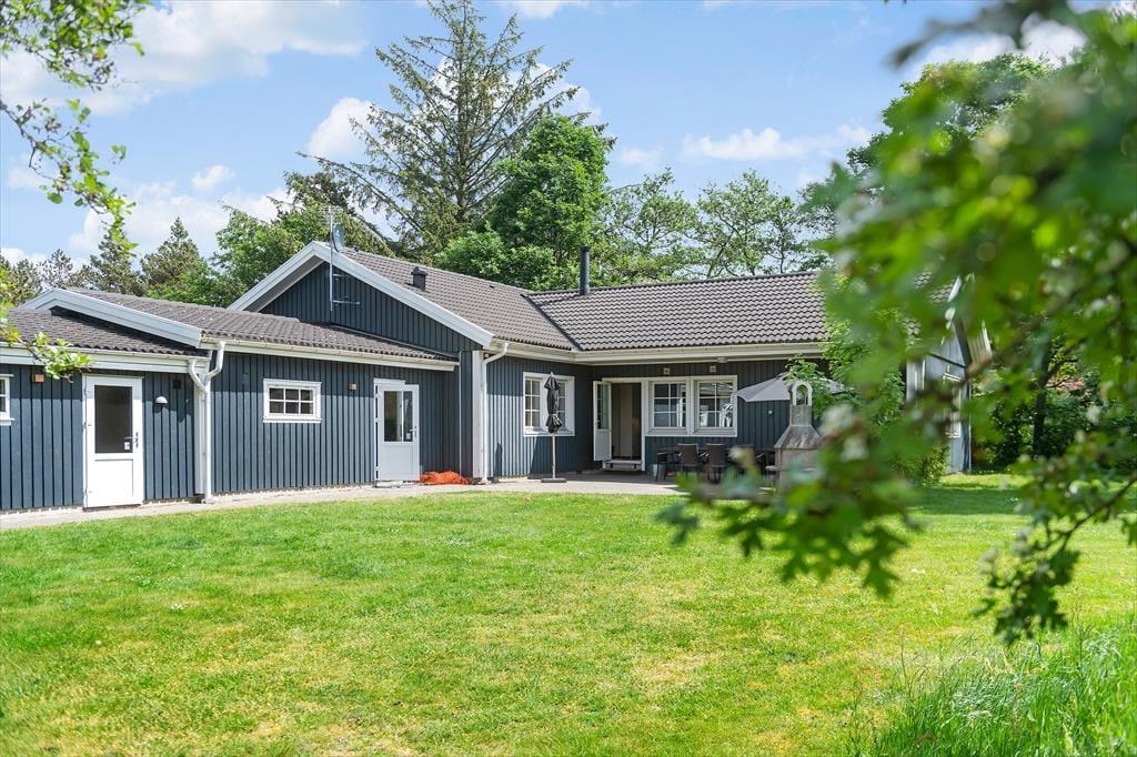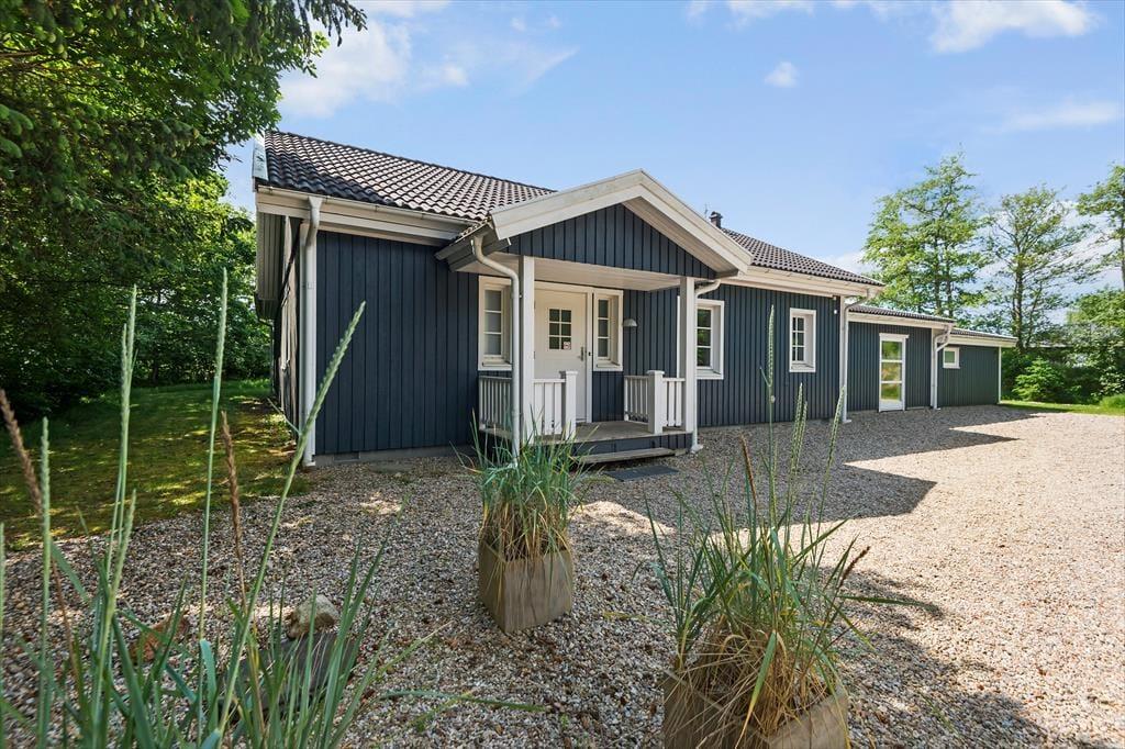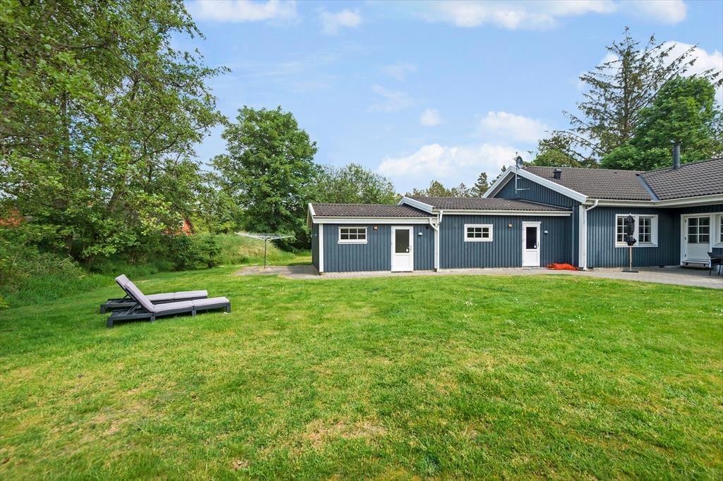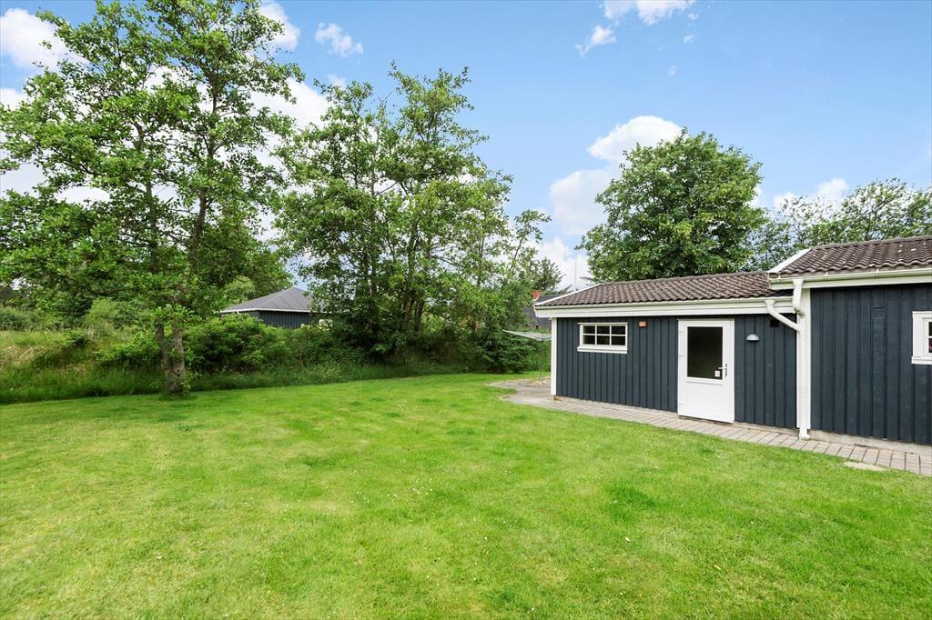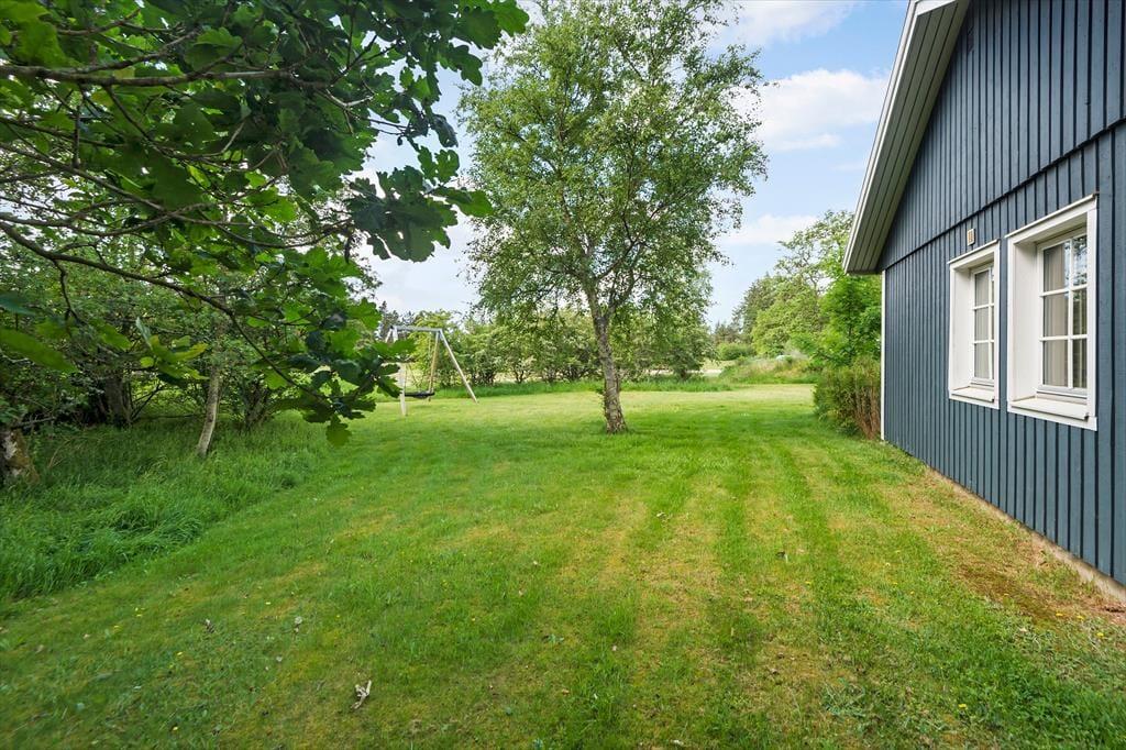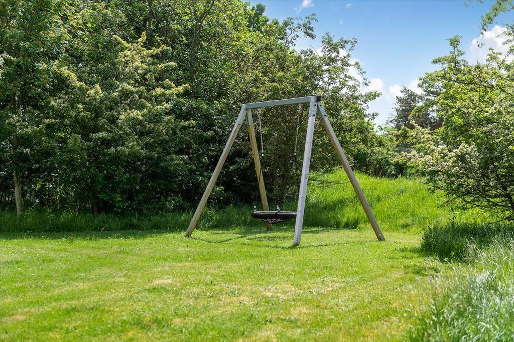 Ude i det fri er der også godt at være, for naturgrunden er stor og grøn, og smukke træer skærmer af ud mod vejen. Den delvist overdækkede terrasse er et herligt sted at slå sig ned med en kølig forfriskning og en god bog, mens børnene boltrer sig på græsplænen – og de yngste har for øvrigt også en sansegynge at hygge sig med. Ved minigolfbanen, der ligger lige i nærheden, finder I en skøn legeplads med rutsjebane, stor sandkasse og meget mere, og huset ligger næsten også som nabo til en fiskesø, så både store og små kan se frem til masser af udendørs sjov.