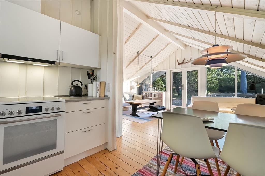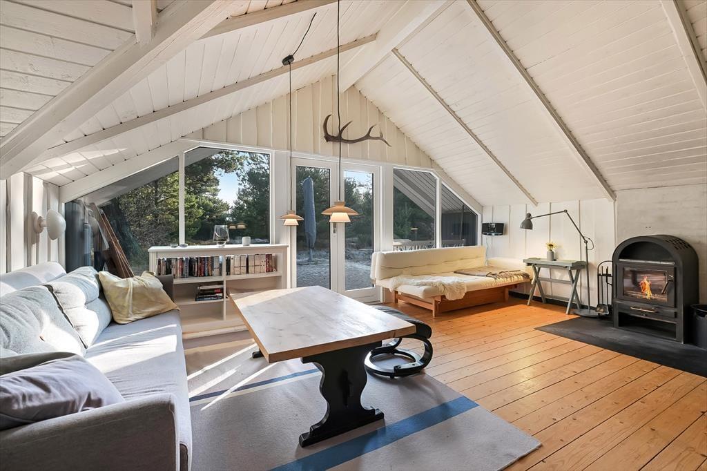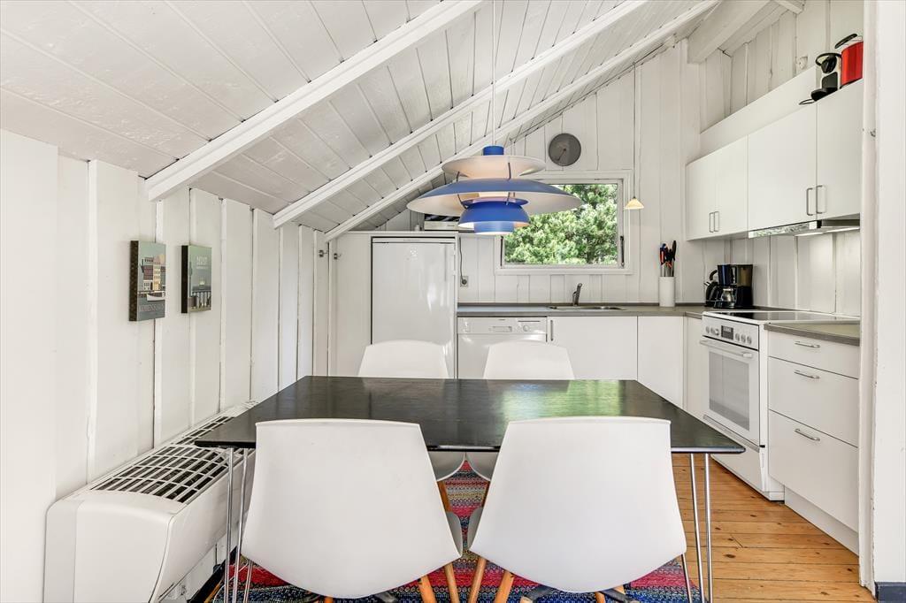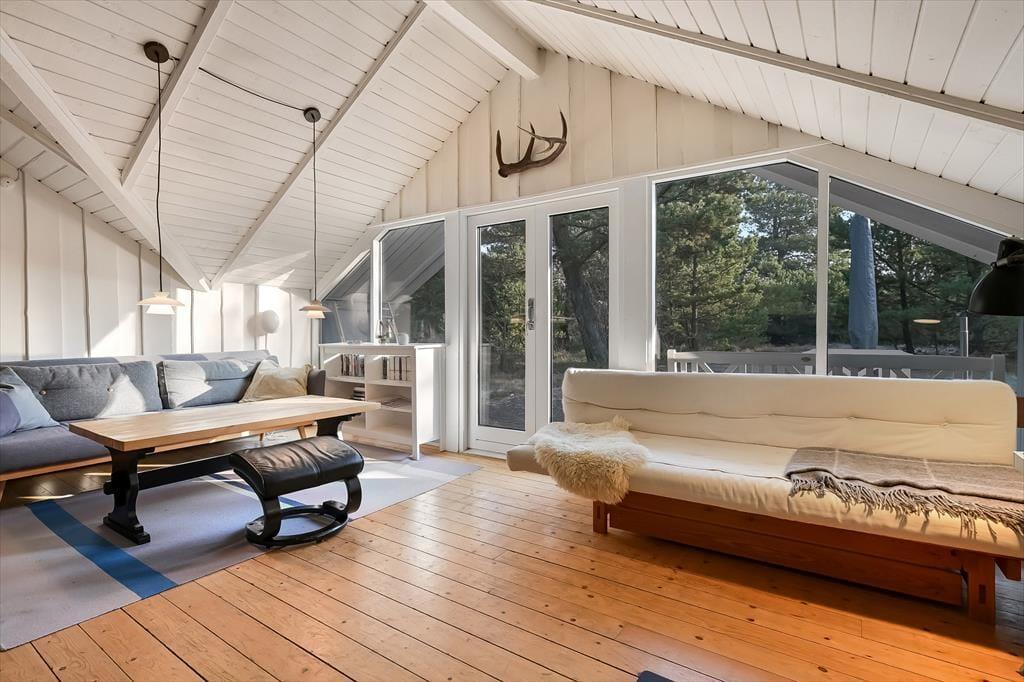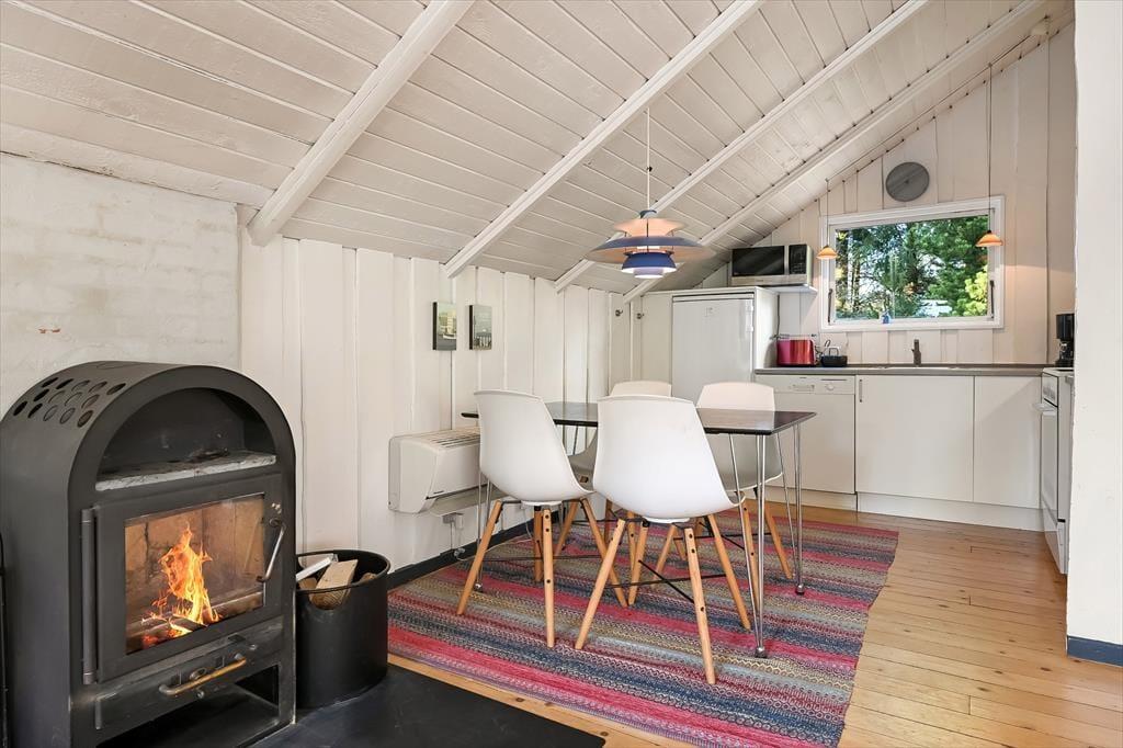 Allerede når du træder ind i huset, bliver du mødt af en lys og indbydende atmosfære. Den åbne stue med store vinduer lader det naturlige lys strømme ind og skaber en varm og venlig stemning – her får du straks lyst til at smide benene op og nyde ferien. Indretningen emmer af klassisk sommerhushygge med god plads til fællesstunder og afslapning. Her kan du bruge timevis med en god bog i lænestolen, spille kort ved spisebordet eller tænde op for hyggelyset og finde roen i stilheden, som omgiver huset. Uanset om du er her for et par dage eller flere uger, inviterer huset til at trække vejret helt ned i maven og give slip på hverdagens tempo.