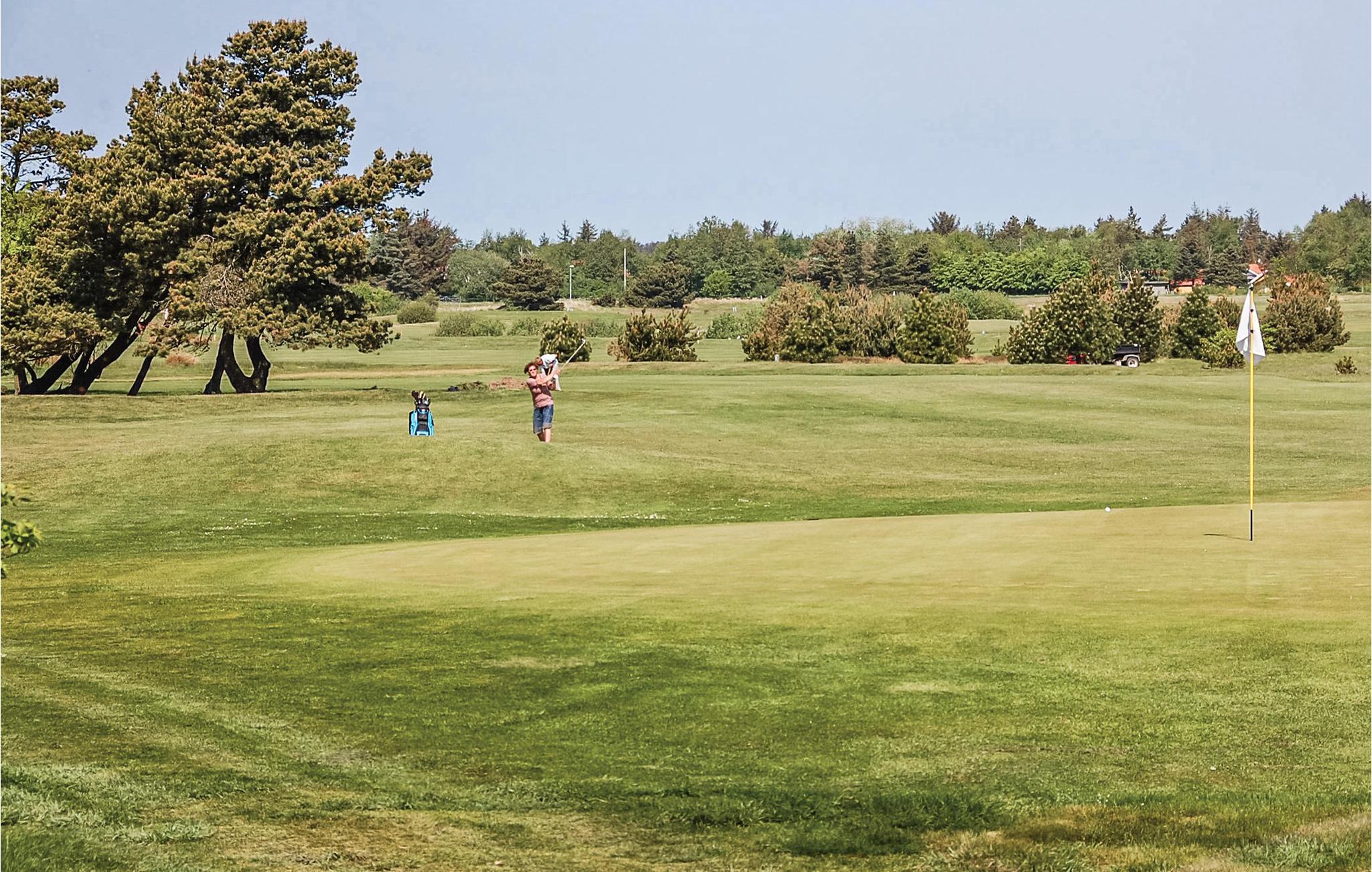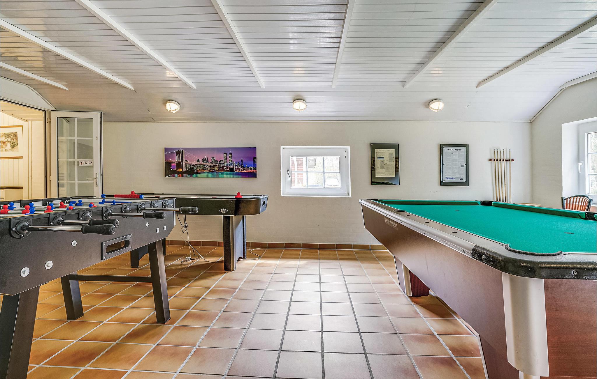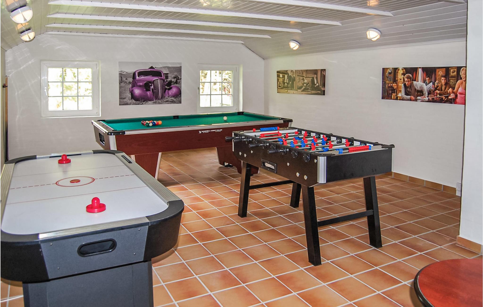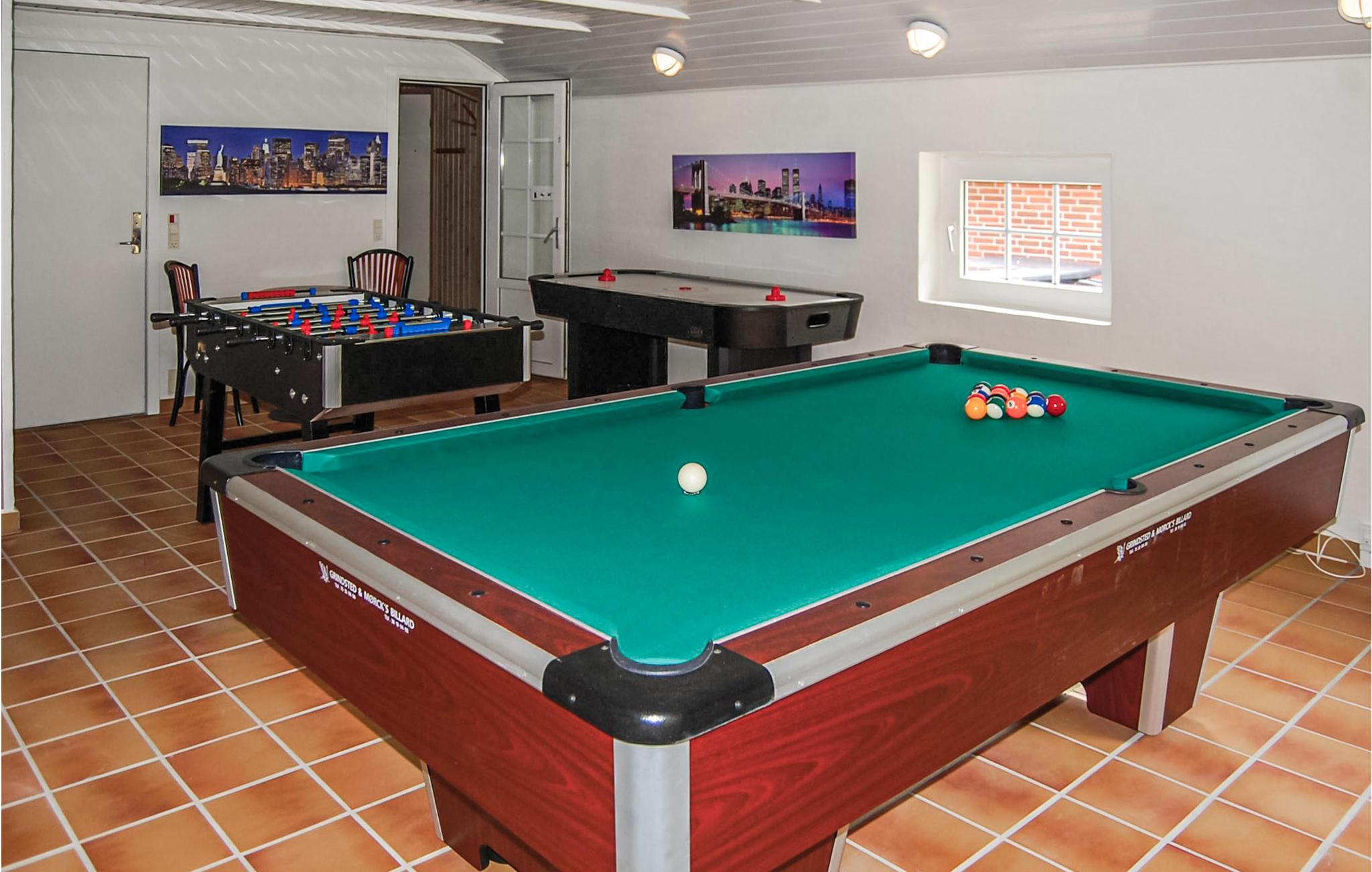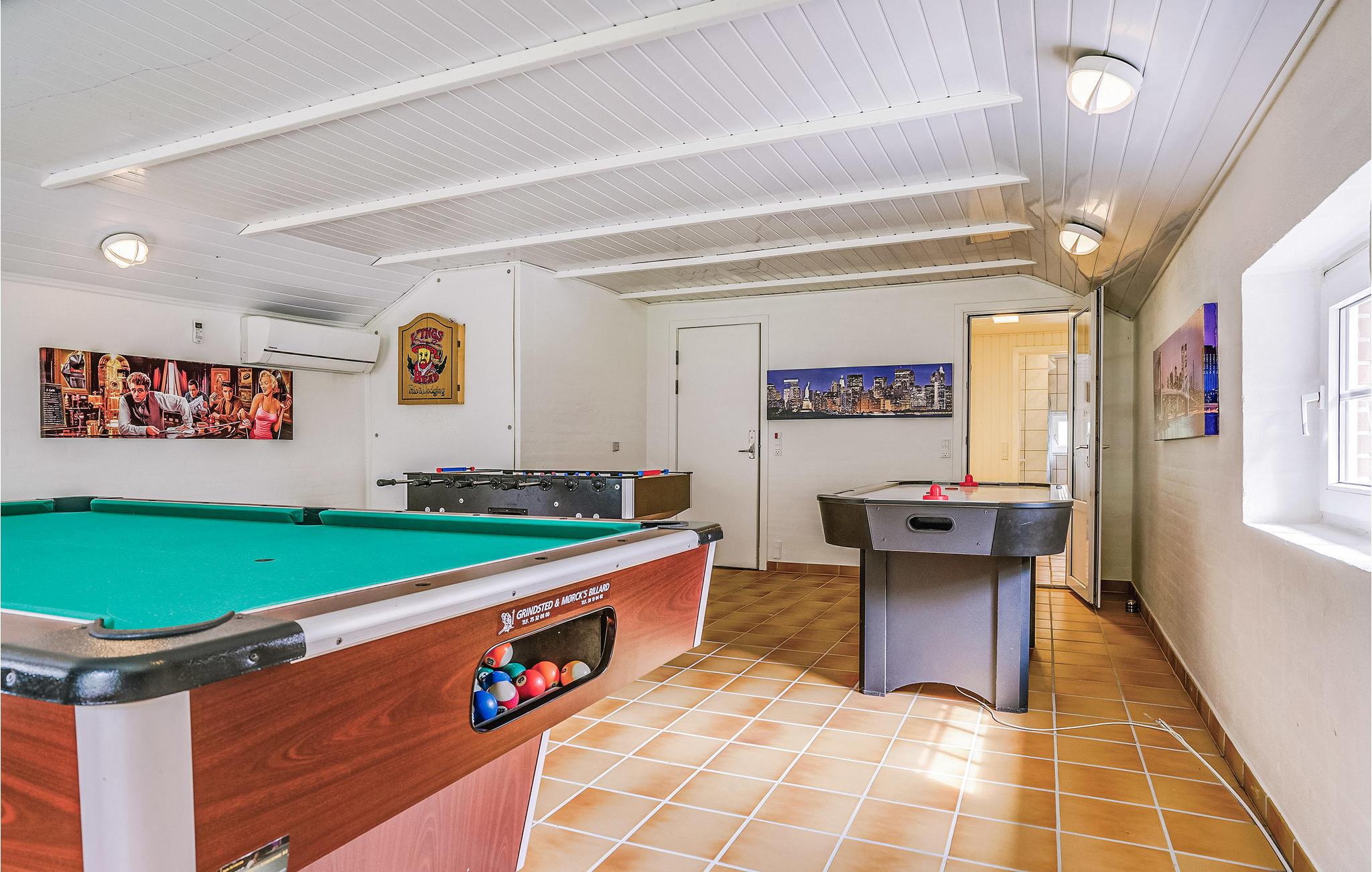 Dette flotte murstenshus ligger på en stor naturgrund, der er omgivet af høje træer. Et feriehus for den aktive og legesyge familie, som rigtig kan boltre sig i det store aktivitetsrum, hvor der både er poolbord, bordfodbold, airhockey og dart. Huset er lyst og venligt indrettet, og fra det store vinduesparti i stuen kan I følge naturen lige udenfor døren, samtidig med at hyggen breder sig i stuen fra den knitrende brændeovn. Praktisk køkkenafdeling med adgang til spiseafdelingen. Alle vægge og lofter er beklædt med træ. De to badeværelser, aktivitetsafdelingen og den kombinerede køkken-/spiseafdeling har klinkegulve. I opholdsstuen og alle soveværelser er der gulvtæpper. Udover disse attraktive faciliteter er der naturligvis også sauna i huset. Udendørs er der fire gode terrasser, så I vil næsten altid kunne finde en lækrog. Ho byder samtidig på gode tilbud som put and take fiskesø, hesteudlejning og golfbaner for såvel øvede som nybegyndere. Her får I et ideelt feriehus med plads til flere familier - velkommen.
