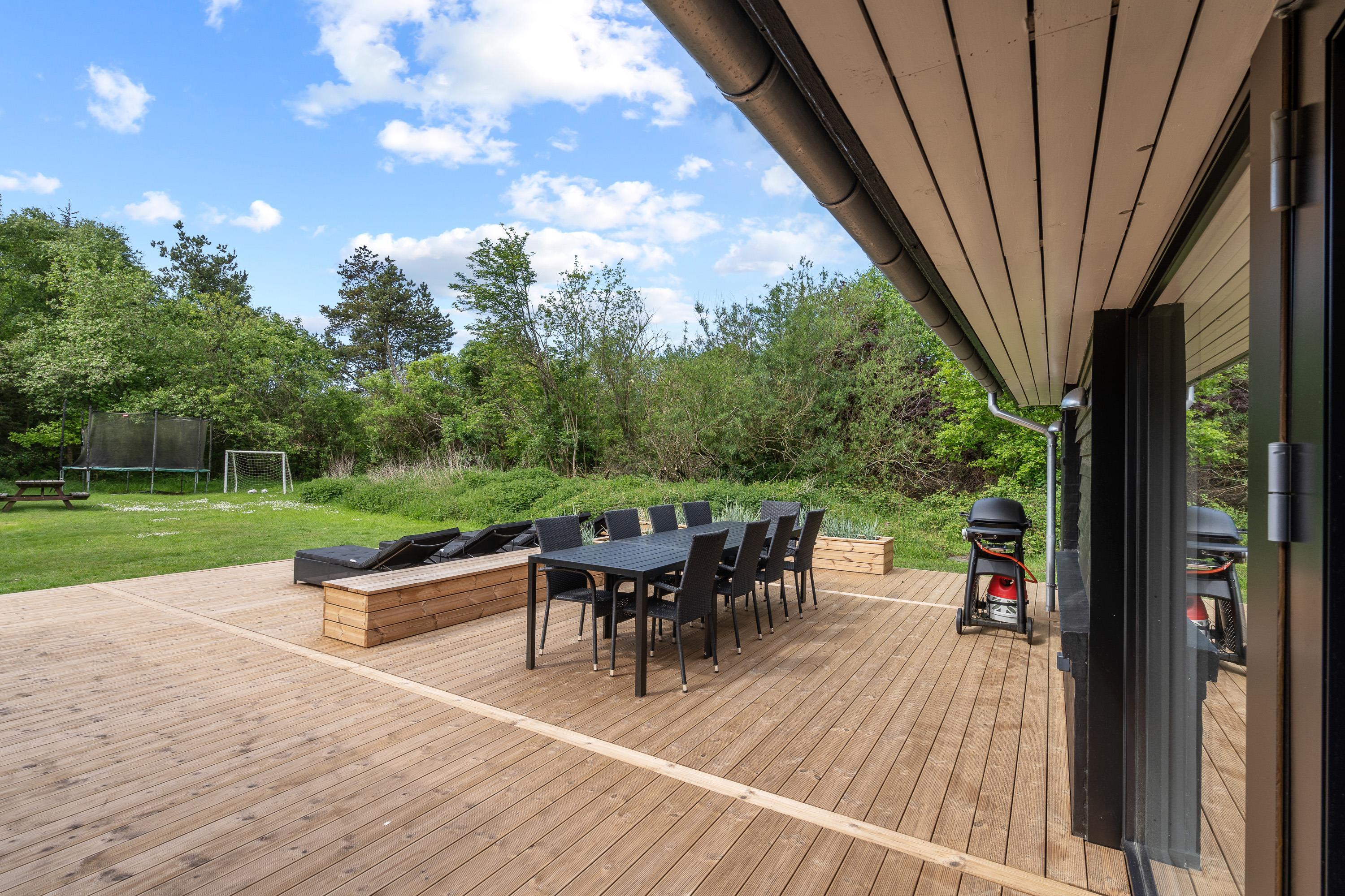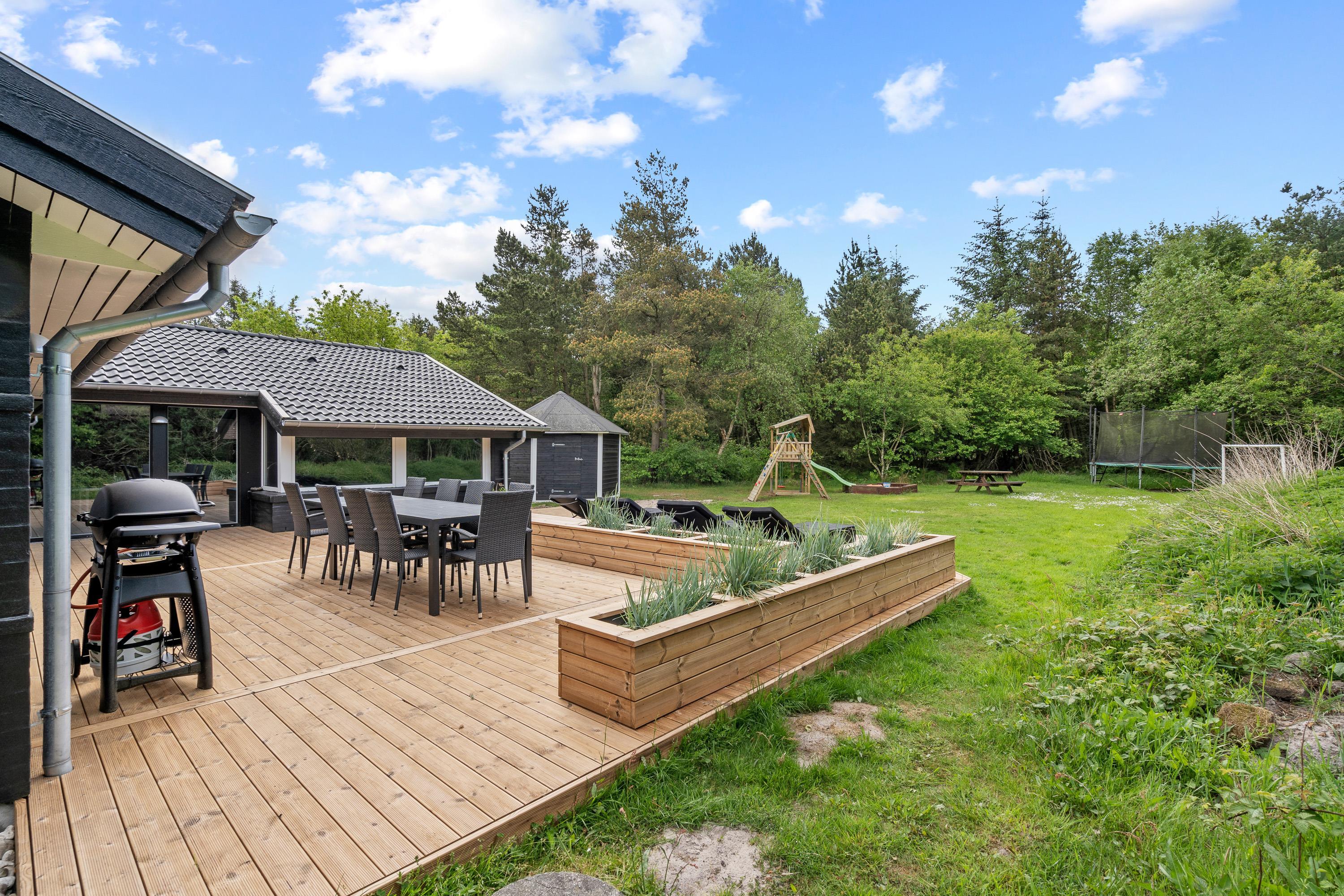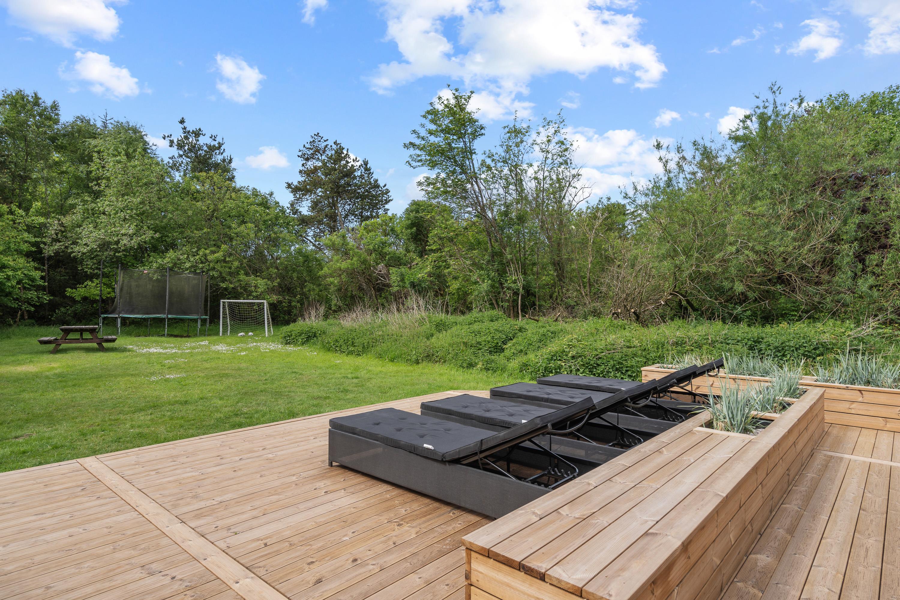 Fra sommerhusets alrum kan I træde ud på den store, åbne terrasse, hvor der venter jer havemøbler og liggestole, som I kan sætte jer godt til rette i på de solrige feriedage. Mens afslapning er i højsædet på terrassen, kan børnene lege i haven, hvor der står en sandkasse og et gyngestativ klar til dem.