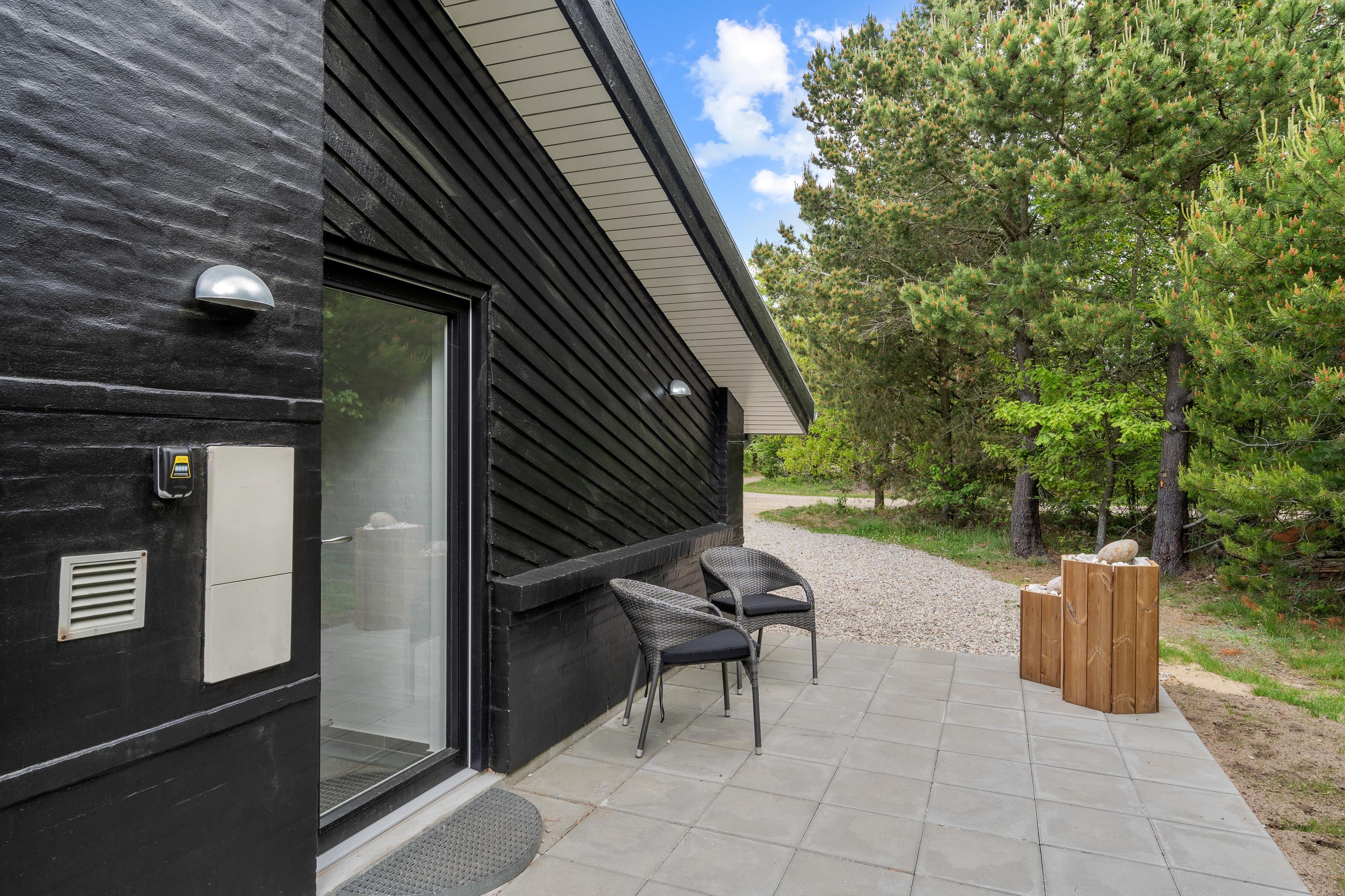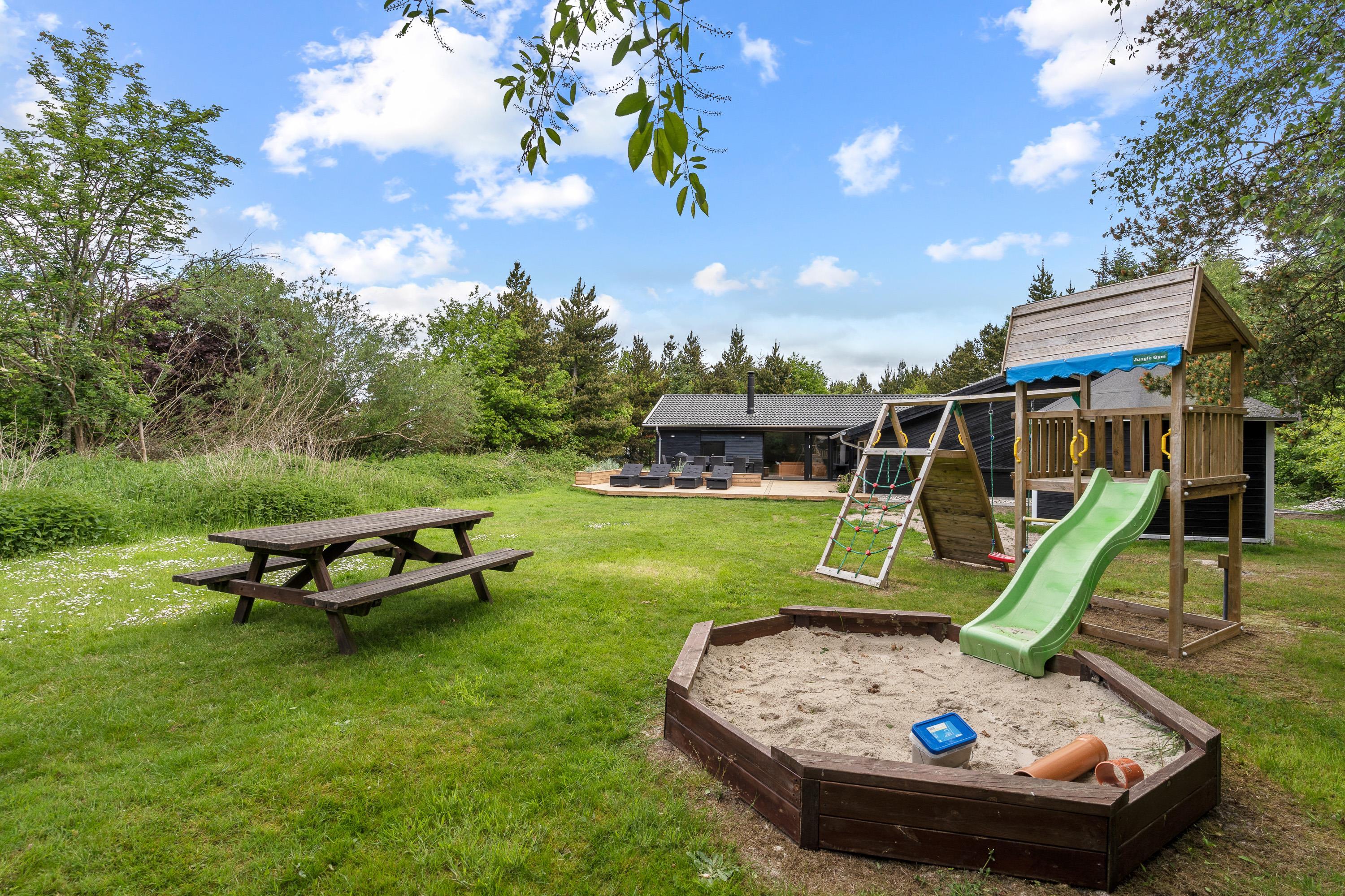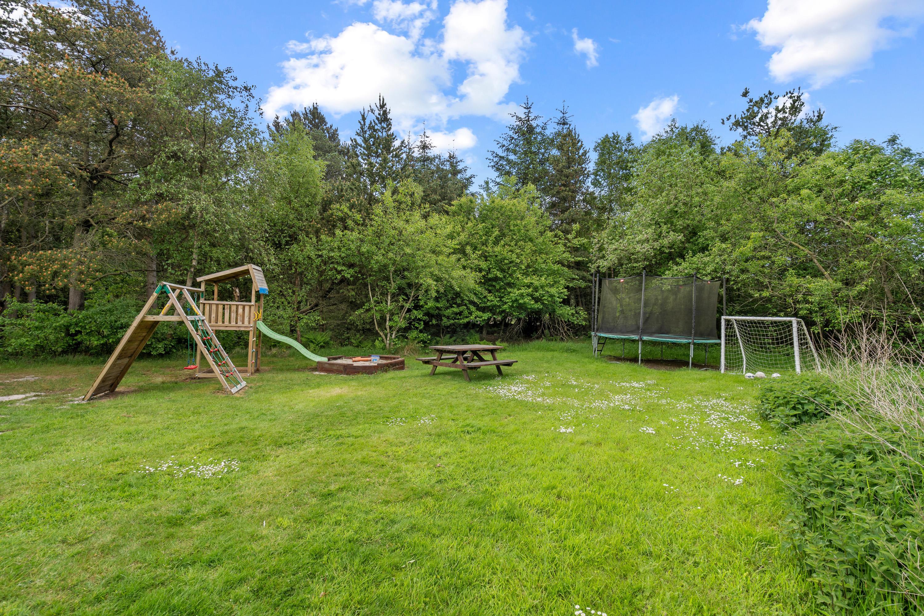 Fra sommerhusets alrum kan I træde ud på den store, åbne terrasse, hvor der venter jer havemøbler og liggestole, som I kan sætte jer godt til rette i på de solrige feriedage. Mens afslapning er i højsædet på terrassen, kan børnene lege i haven, hvor der står en sandkasse og et gyngestativ klar til dem.