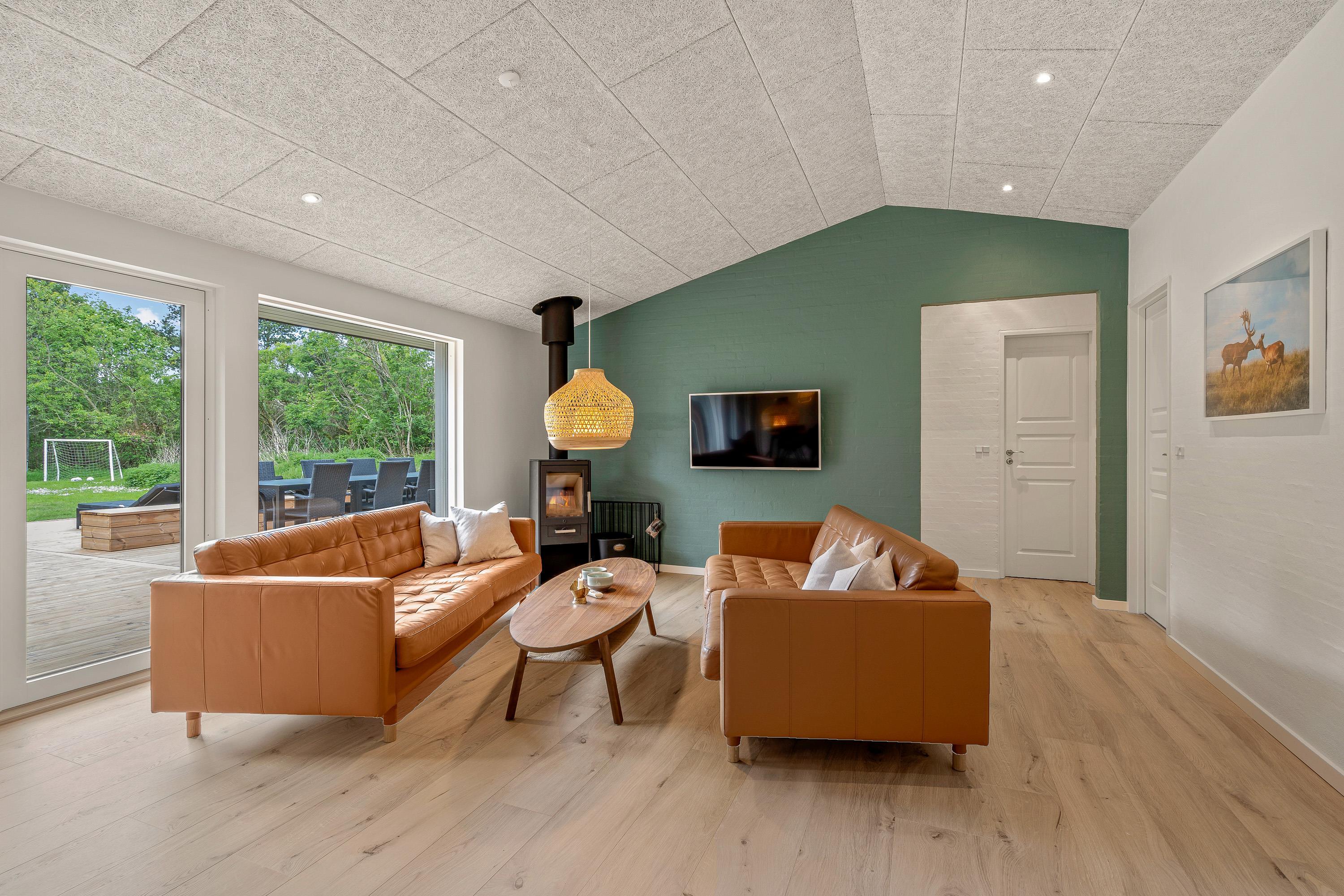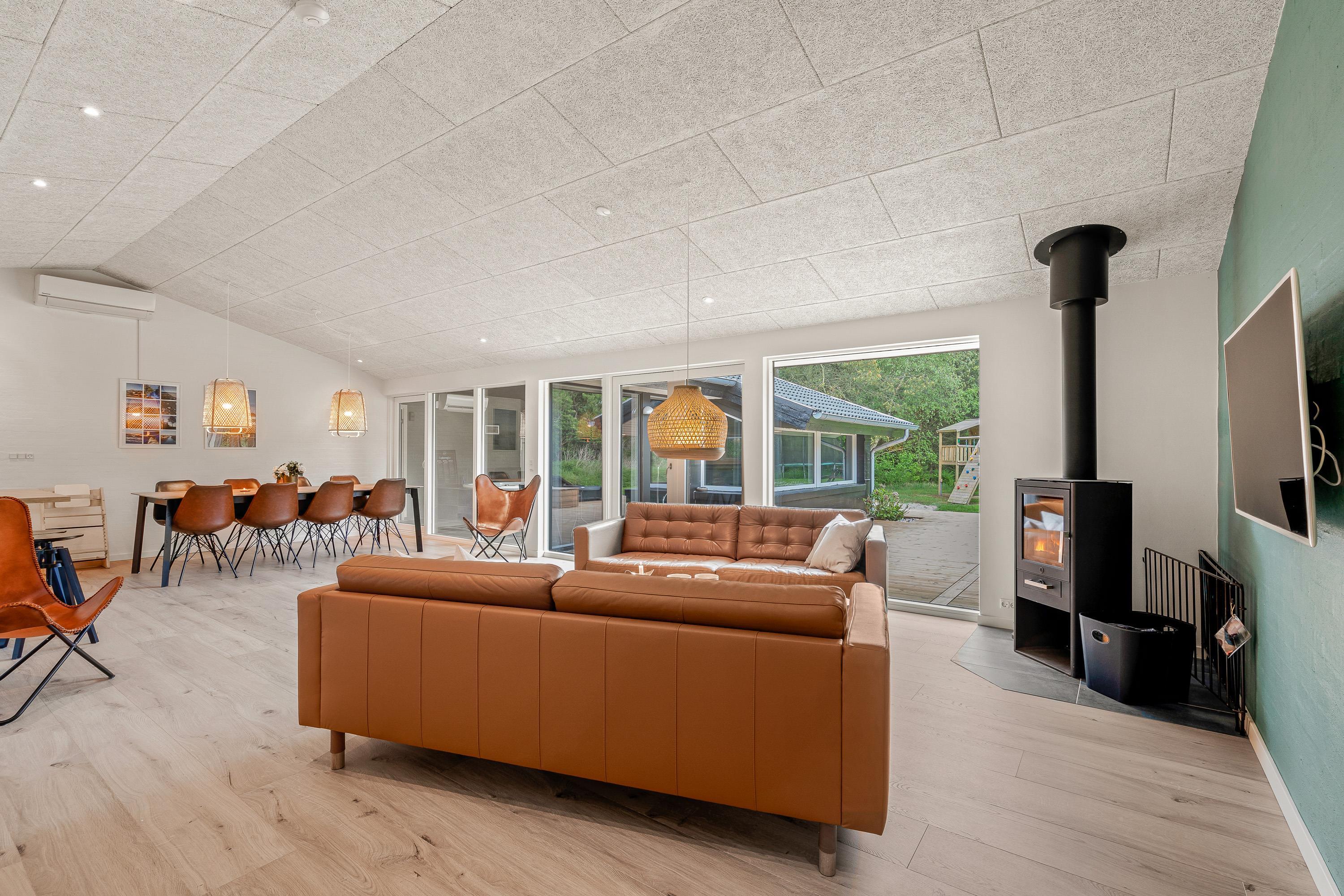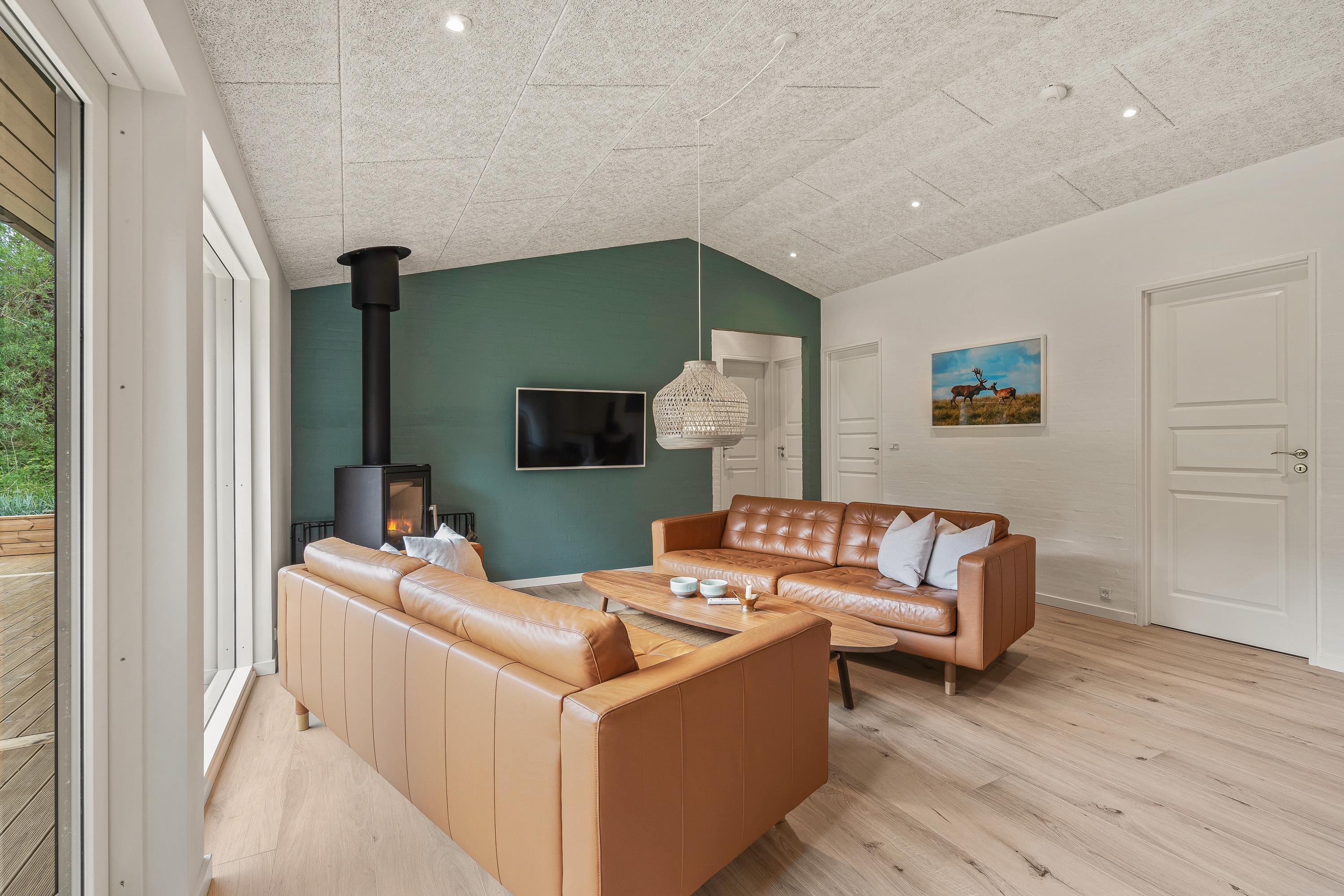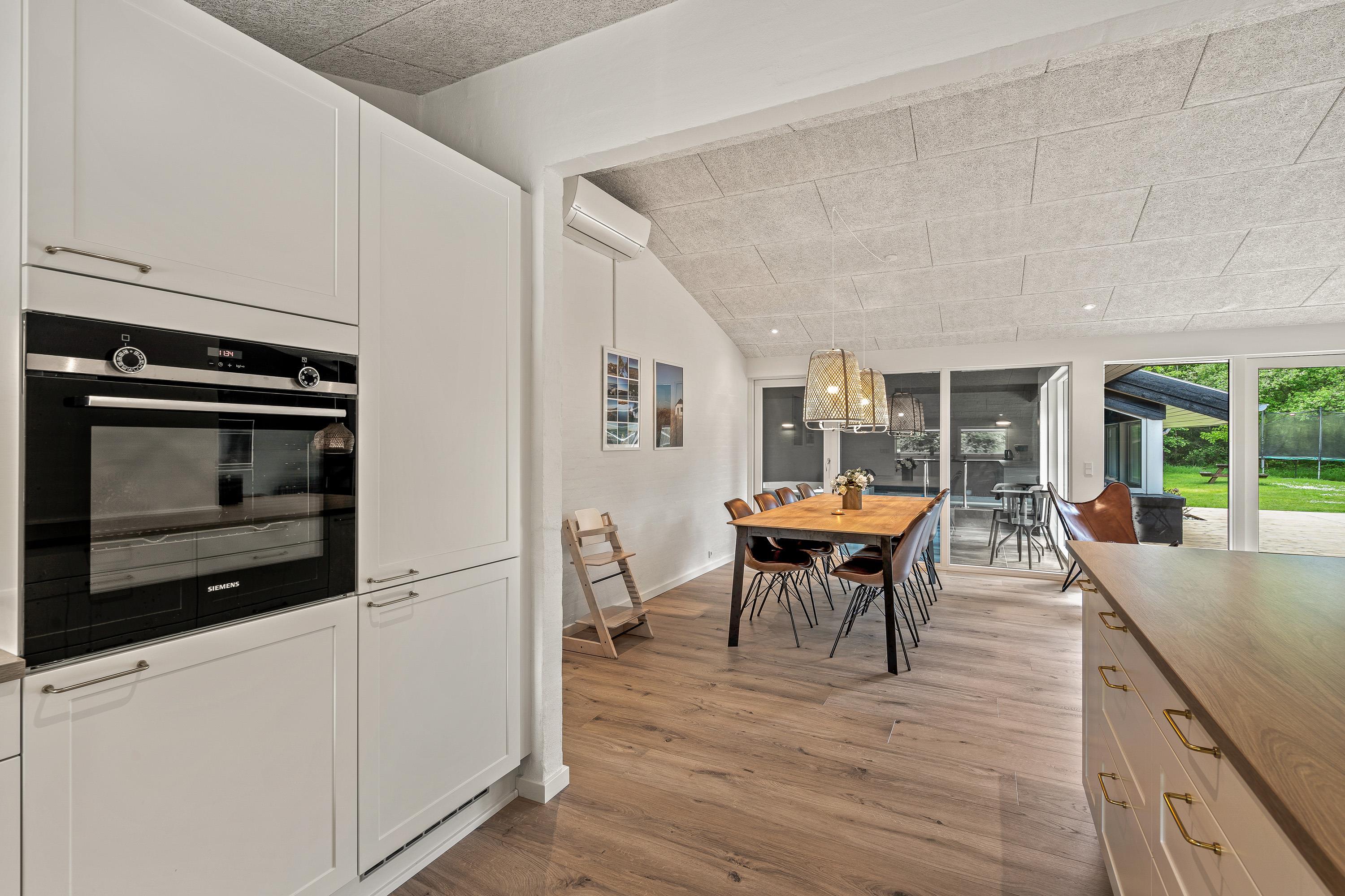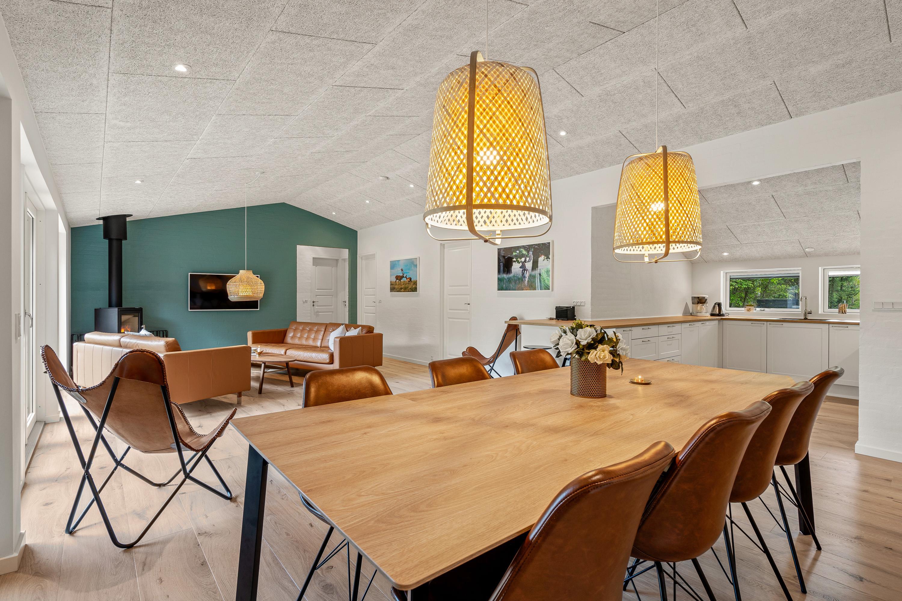 Sommerhusets køkken ligger i åben forbindelse med stuen og spisepladsen, som tilsammen udgør alrummet. Alrummet er hjertet i feriehuset, og her kan I tilbringe hyggelige feriestunder med mad, spil og film, mens brændeovnen knitrer i baggrunden og fuldender feriestemningen.