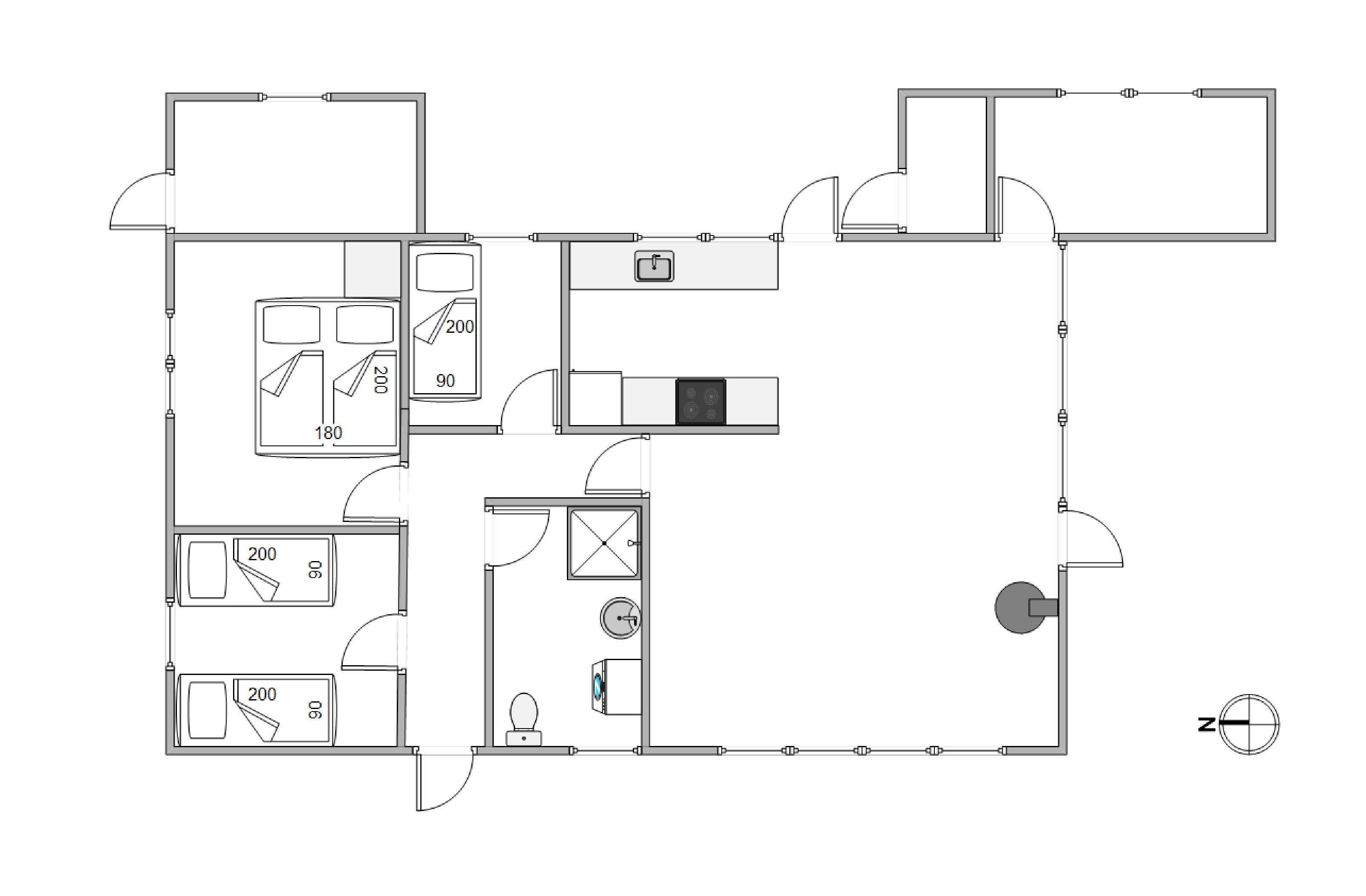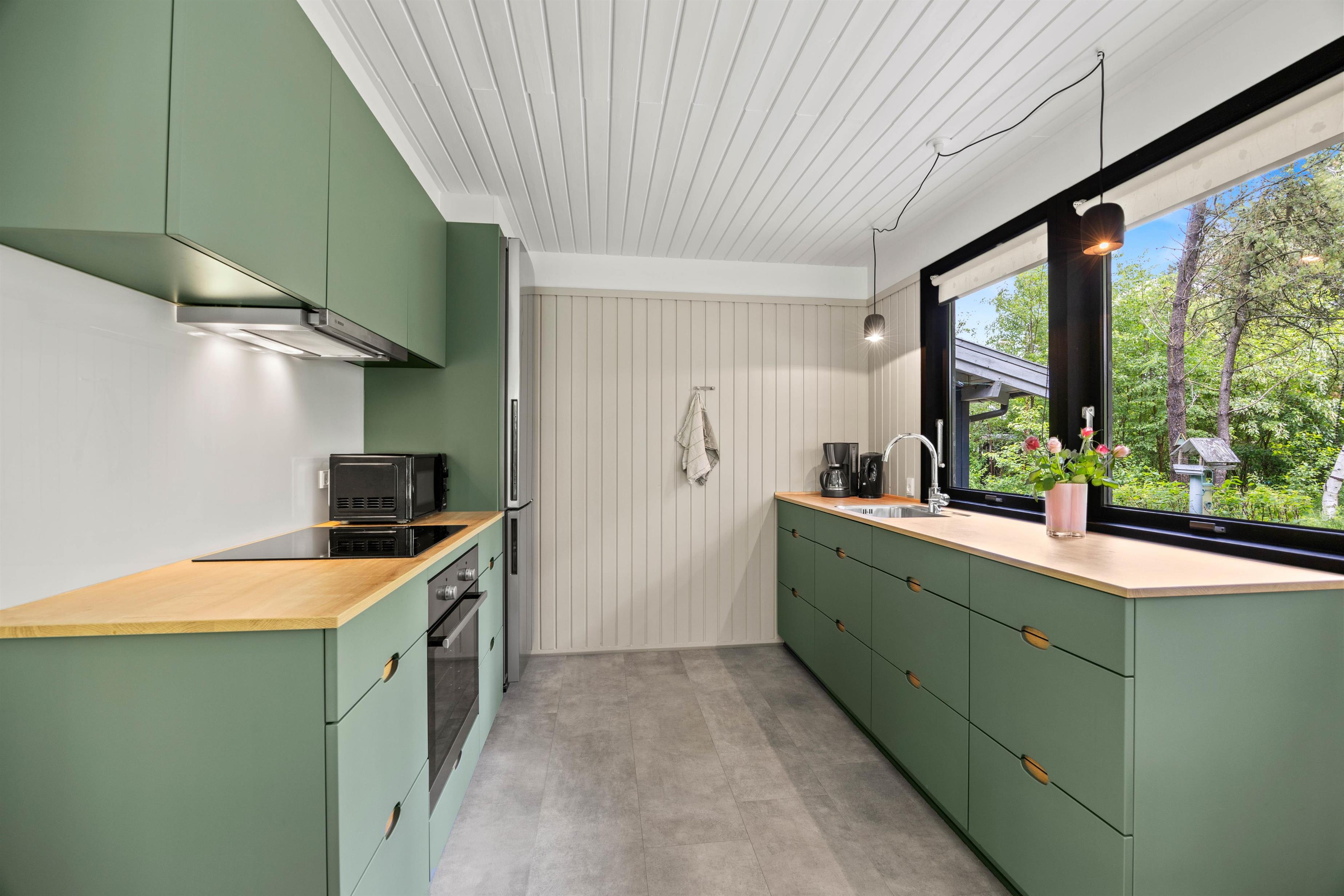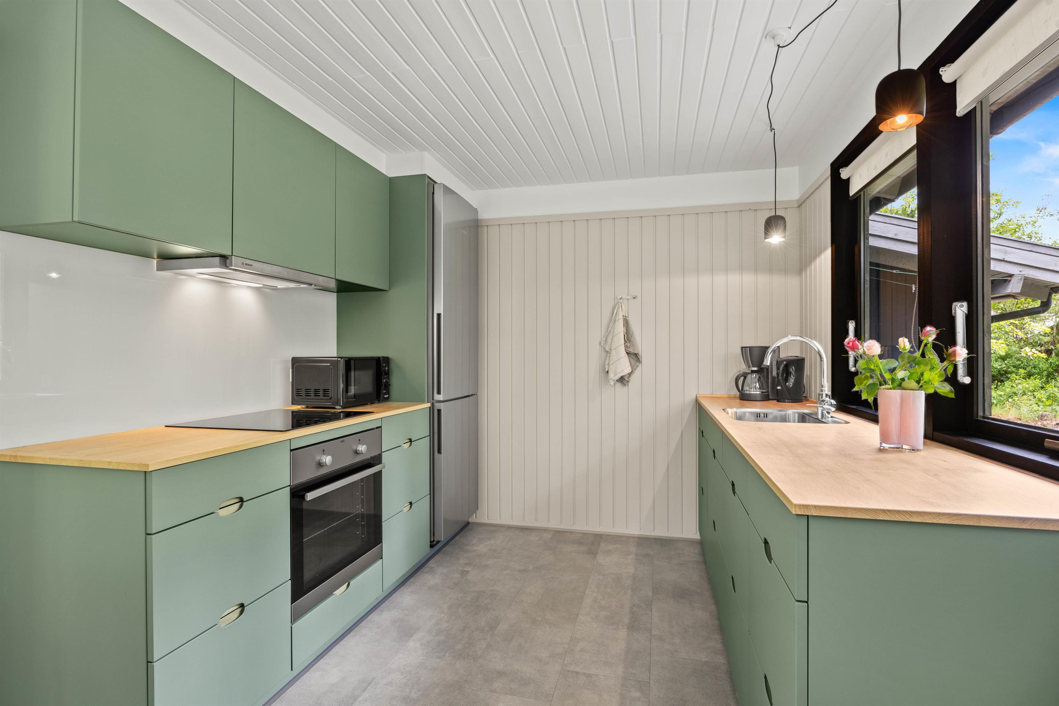 Jeres samlingspunkt i sommerhuset bliver utvivlsomt alrummet, hvor køkken, stue og spiseplads er samlet i ét rum. Her kan I tilbringe mange dejlige feriestunder sammen med madlavning, spil og film. Centralt i alrummet står brændeovnen, der spreder hyggelig stemning og varme i rummet.