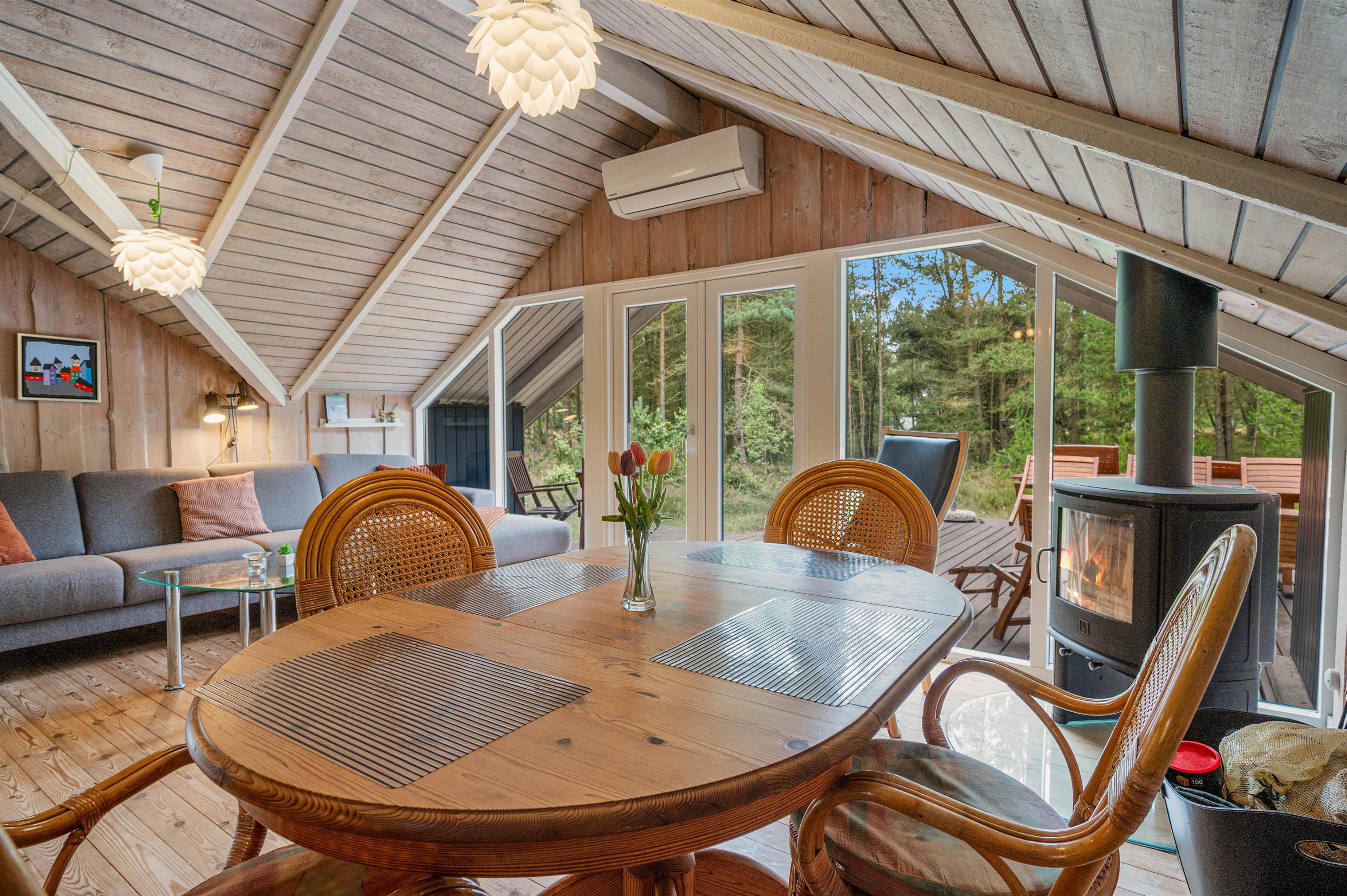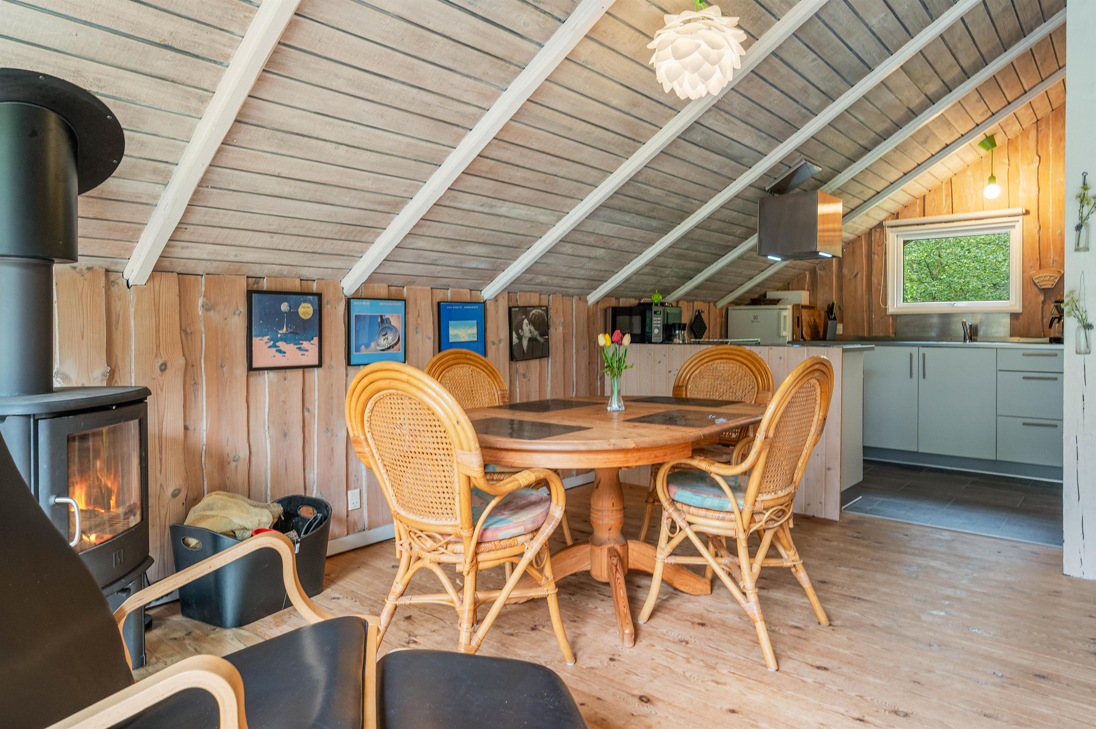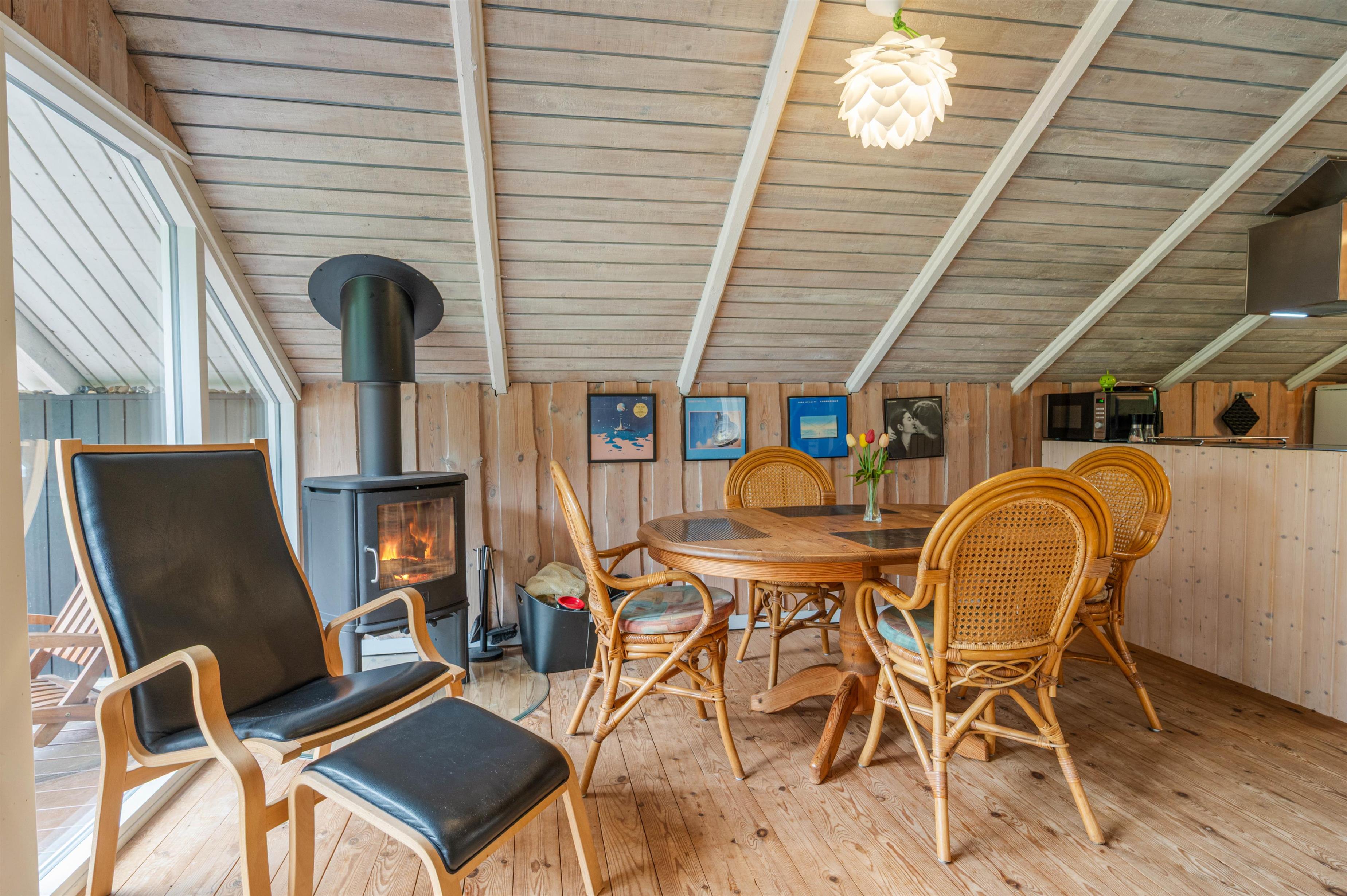 Den klassiske sommerhuscharme med mange skråvægge bliver fuldendt af brændeovnen, som med sine knitrende flammer vil sprede varme og god feriestemning hele året rundt - på regnfulde dage med varm kakao, og på sene forårsaftener, mens mørket falder på, og I nyder et sidste glas rødvin inden sengetid.