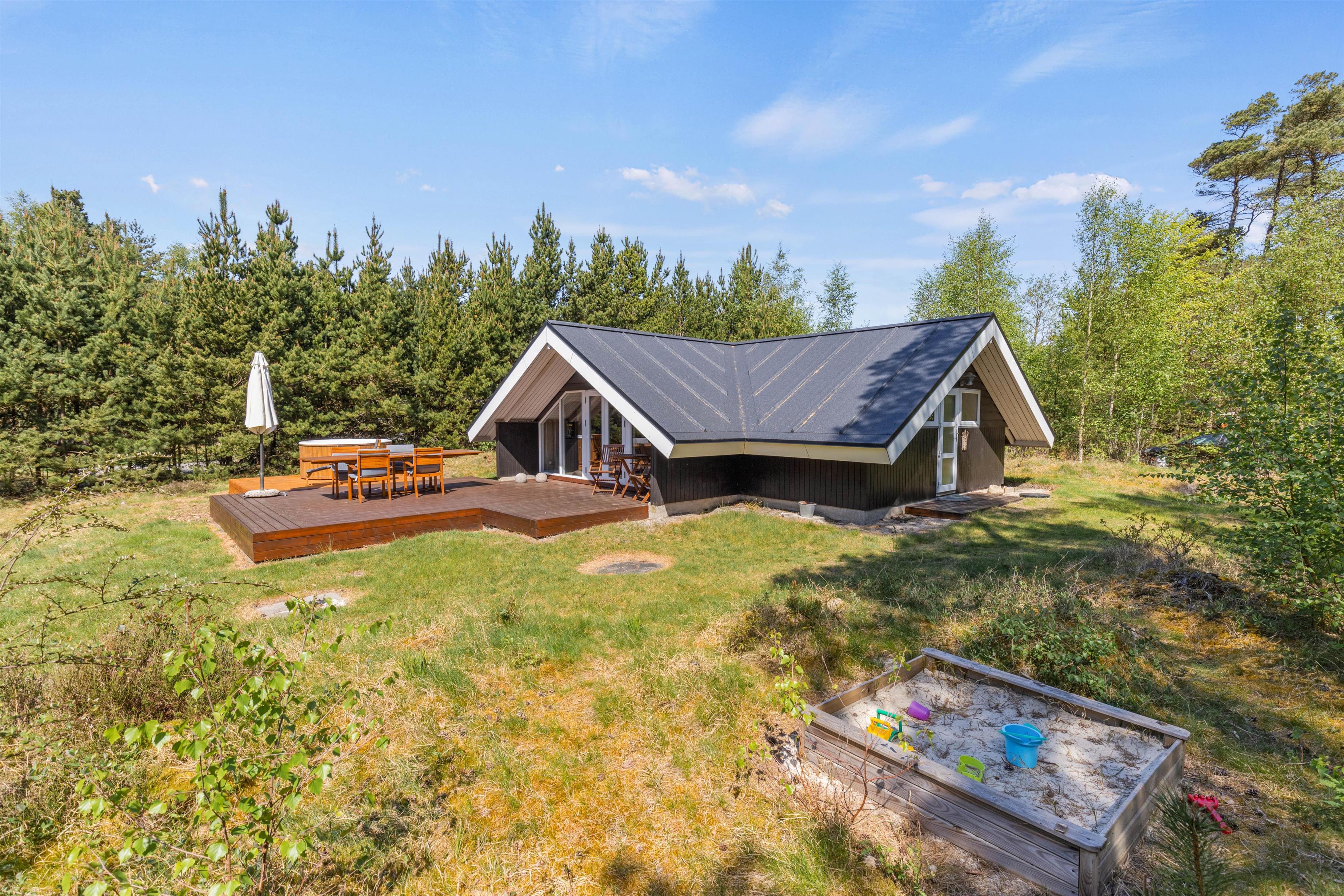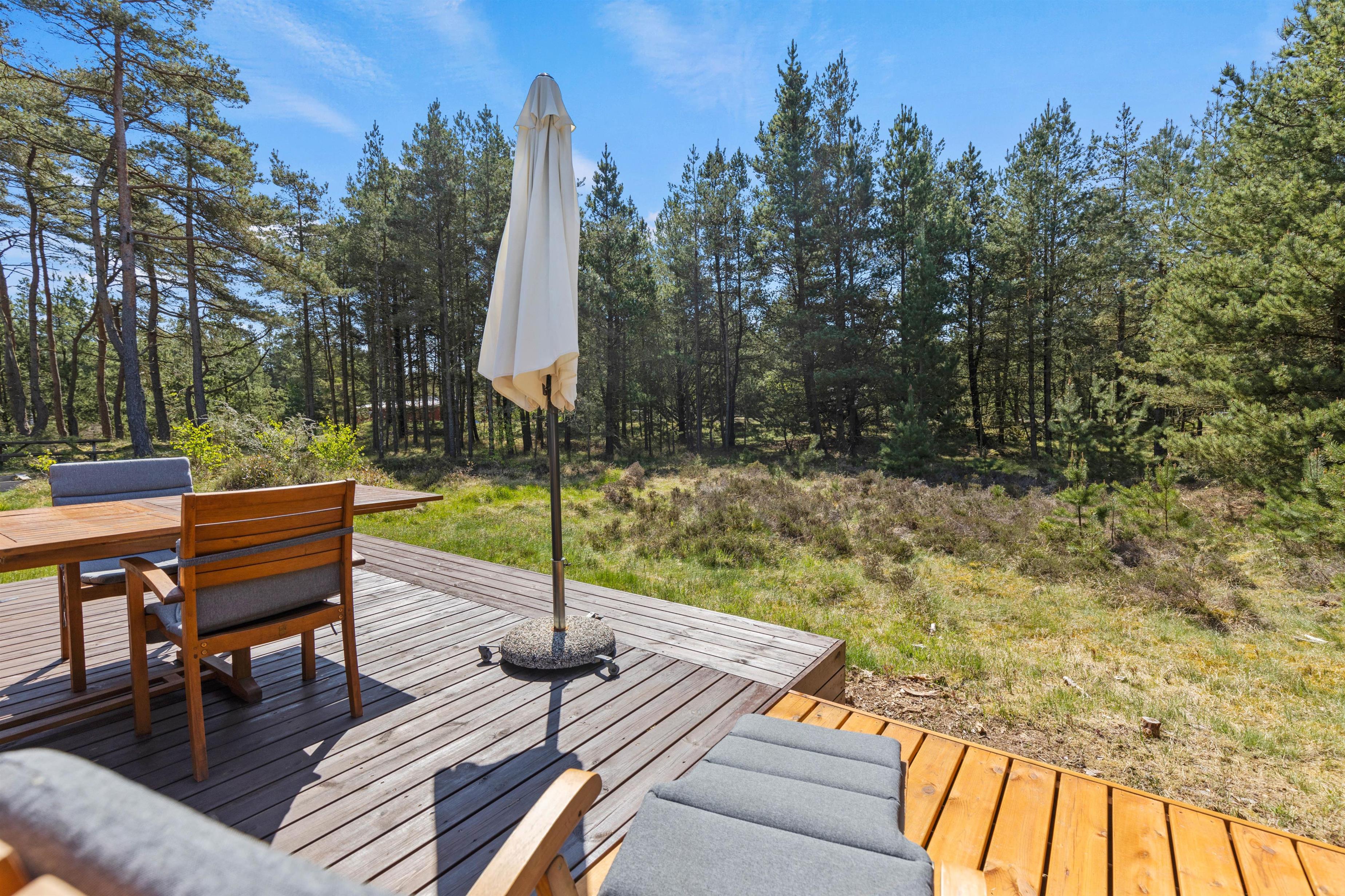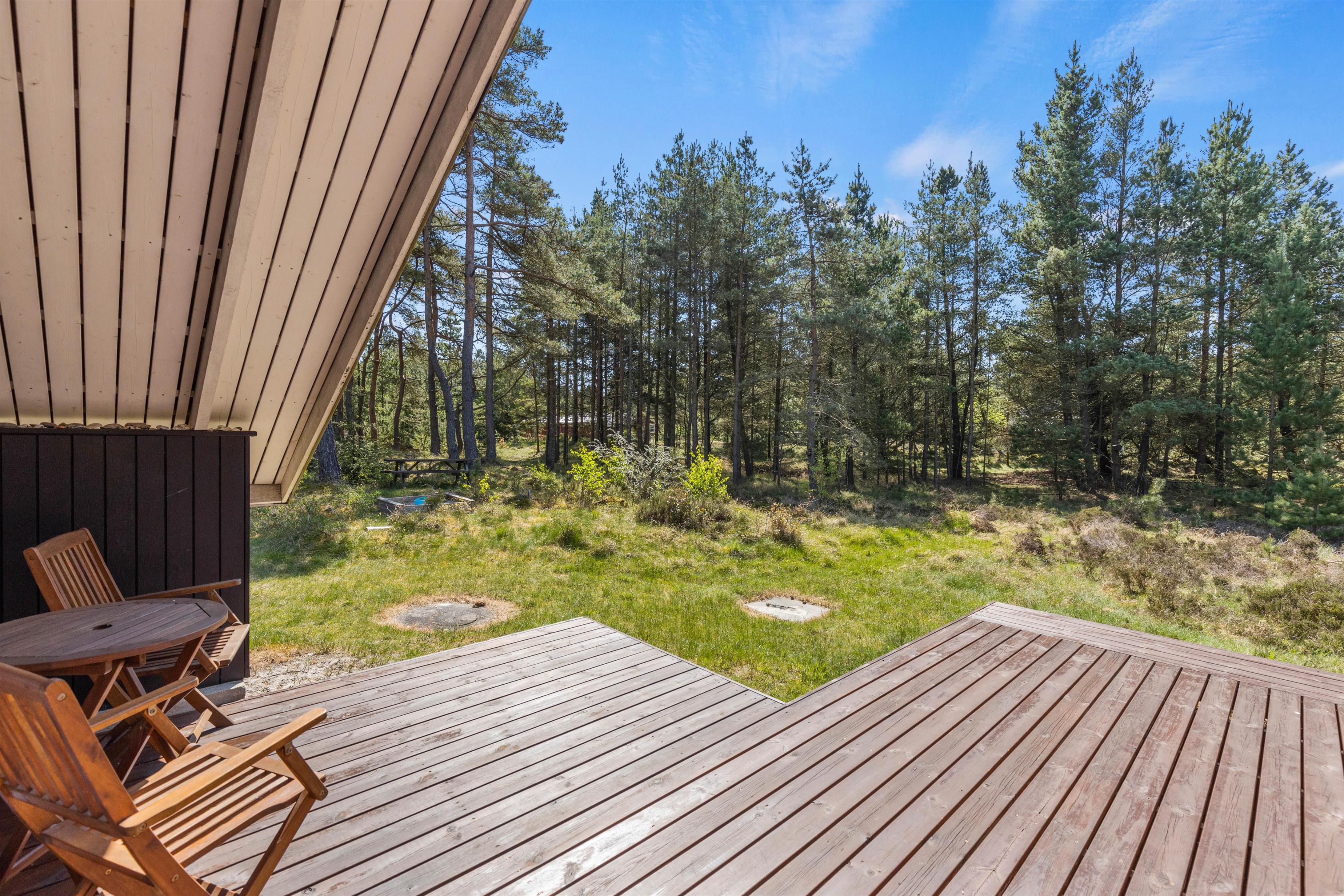 Fra opholdsrummet kommer I ud på den delvist overdækkede terrasse, hvor I året rundt kan nyde den friske luft og skovduft i ly og læ. Høje grantræer indrammer den store grund og giver en helt ugeneret beliggenhed blandt hede og lyng.