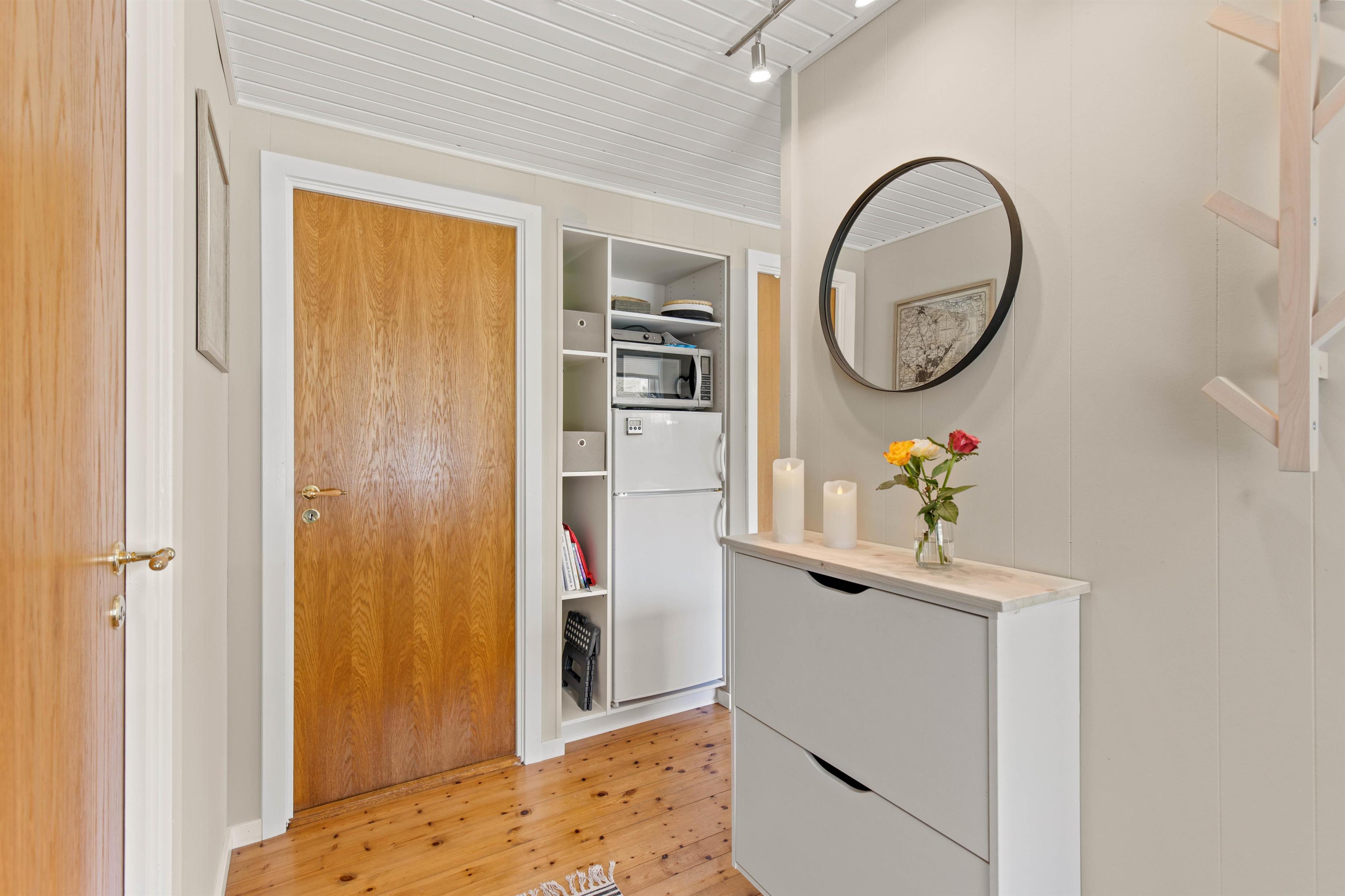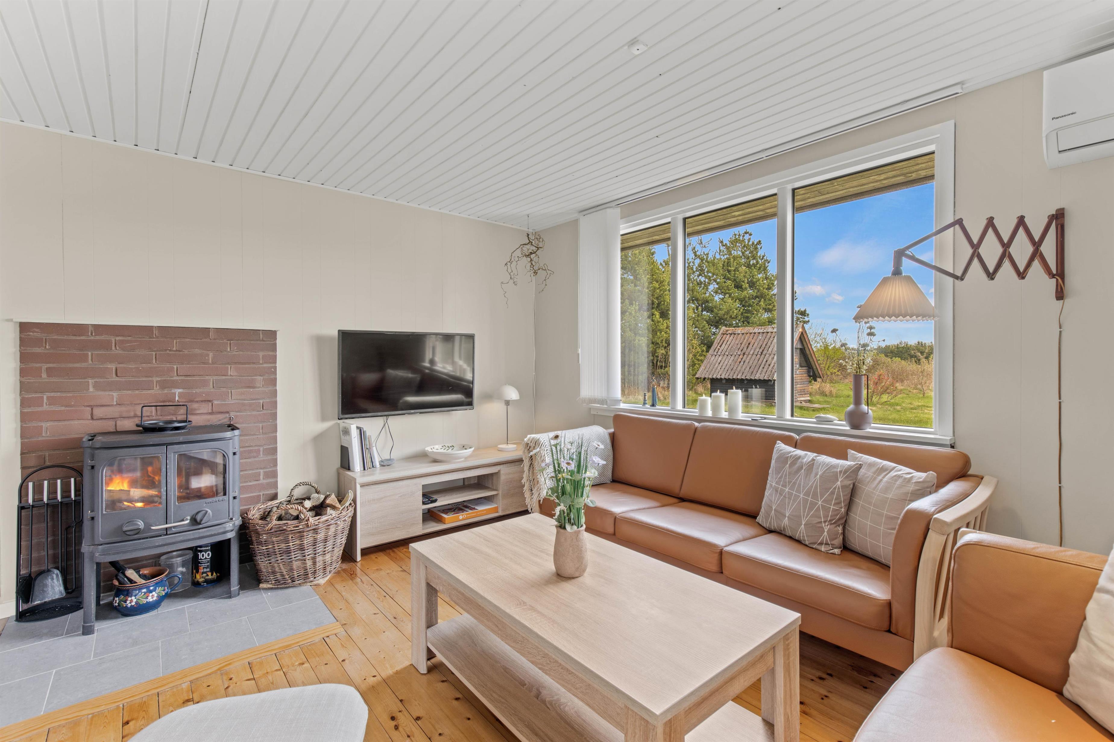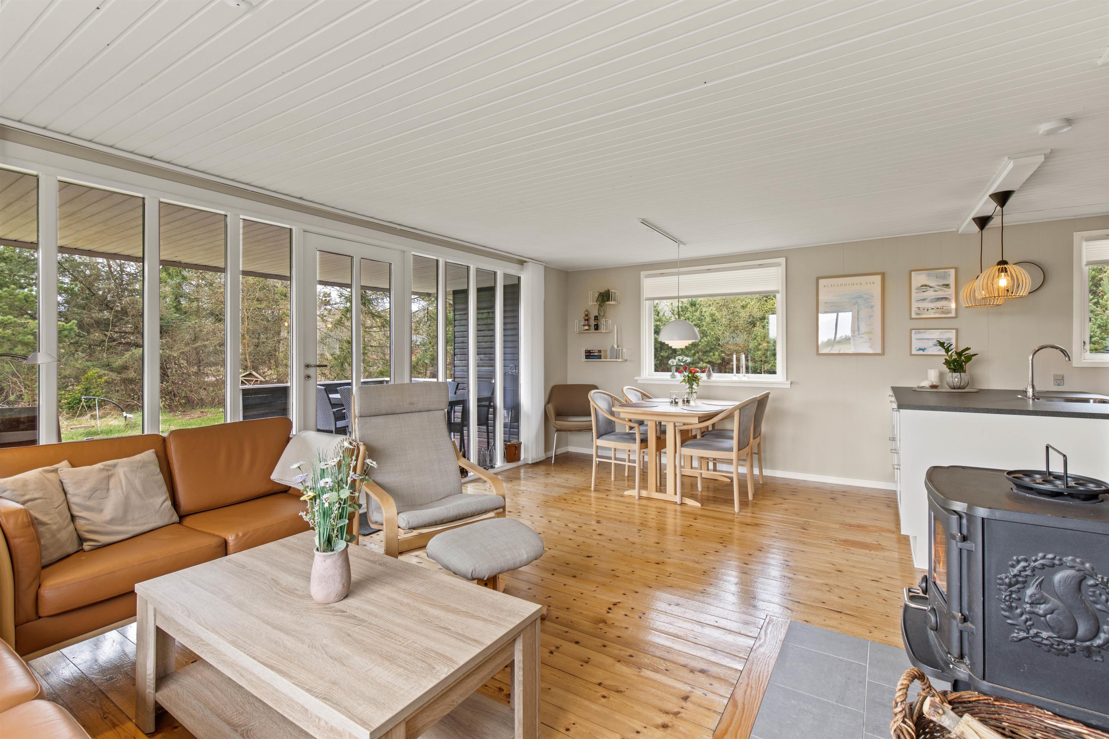 Fra entréen træder du ind i sommerhusets hjerte og samlingspunkt, som er det dejlige køkkenalrum. I det praktiske køkken, med både opvaskemaskine, mikroovn og fryser, kan I lave mad sammen og nyde det rundt om spisebordet, hvor I har udsigt til den dejlige grønne natur. Om aftenen kan I tænde op i brændeovnen og slå jer ned i de behagelige møbler, mens brændeovnen knitrer i baggrunden og skaber en hyggelig stemning.