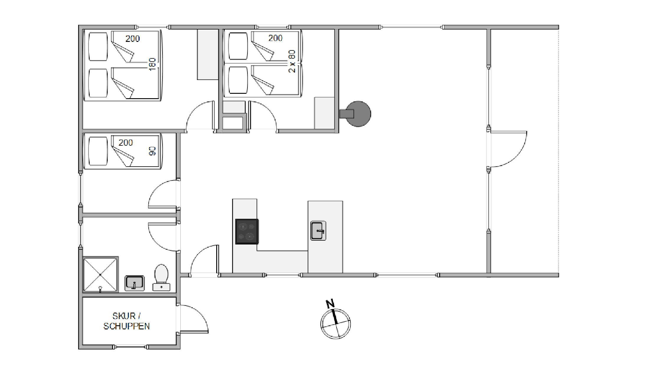 Feriehuset har 3 soverum samt et fint badeværelse med gulvvarme, så I ikke skal fryse om fødderne. Derudover kan I opvarme sommerhuset med den energibesparende luft til luft varmepumpe.