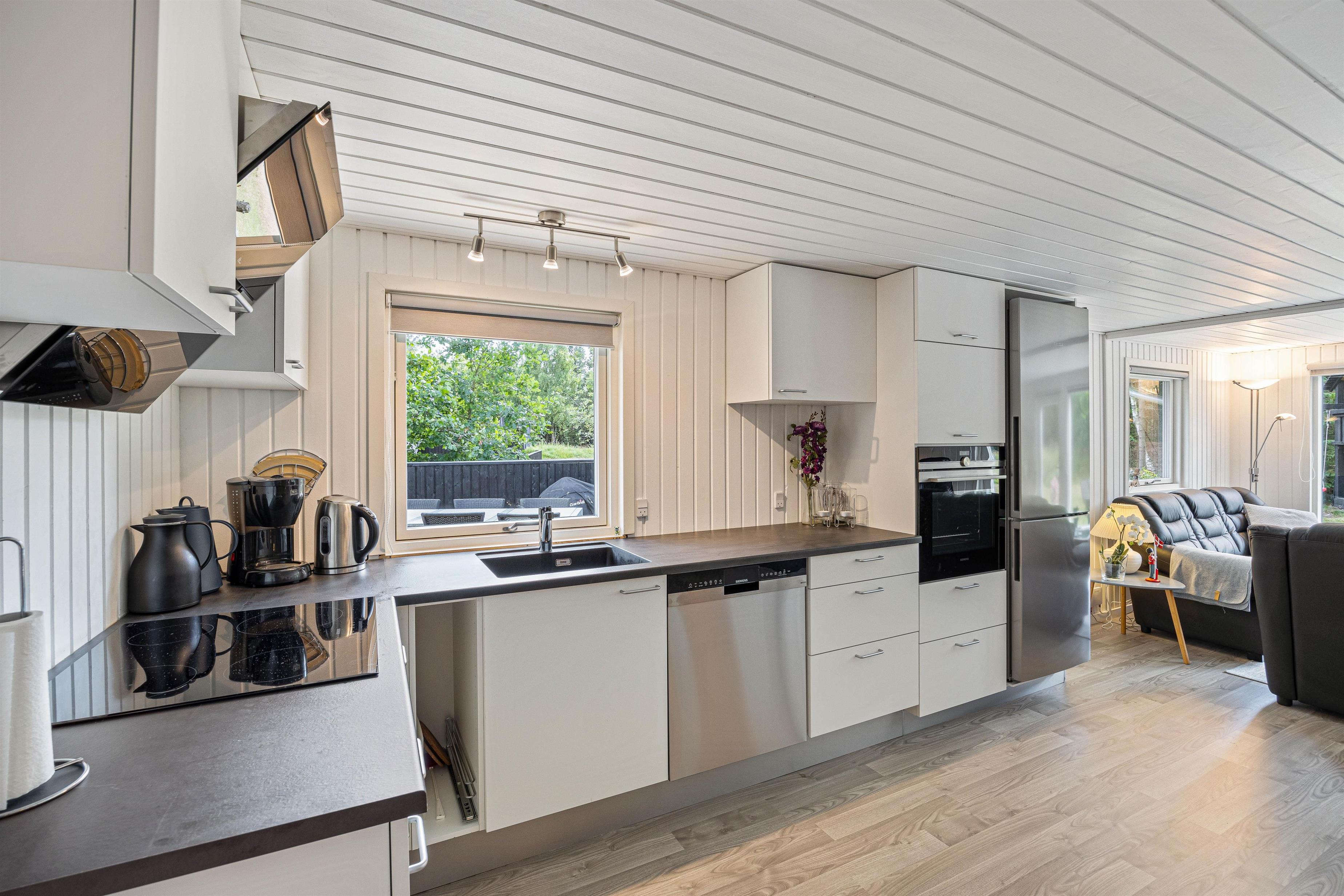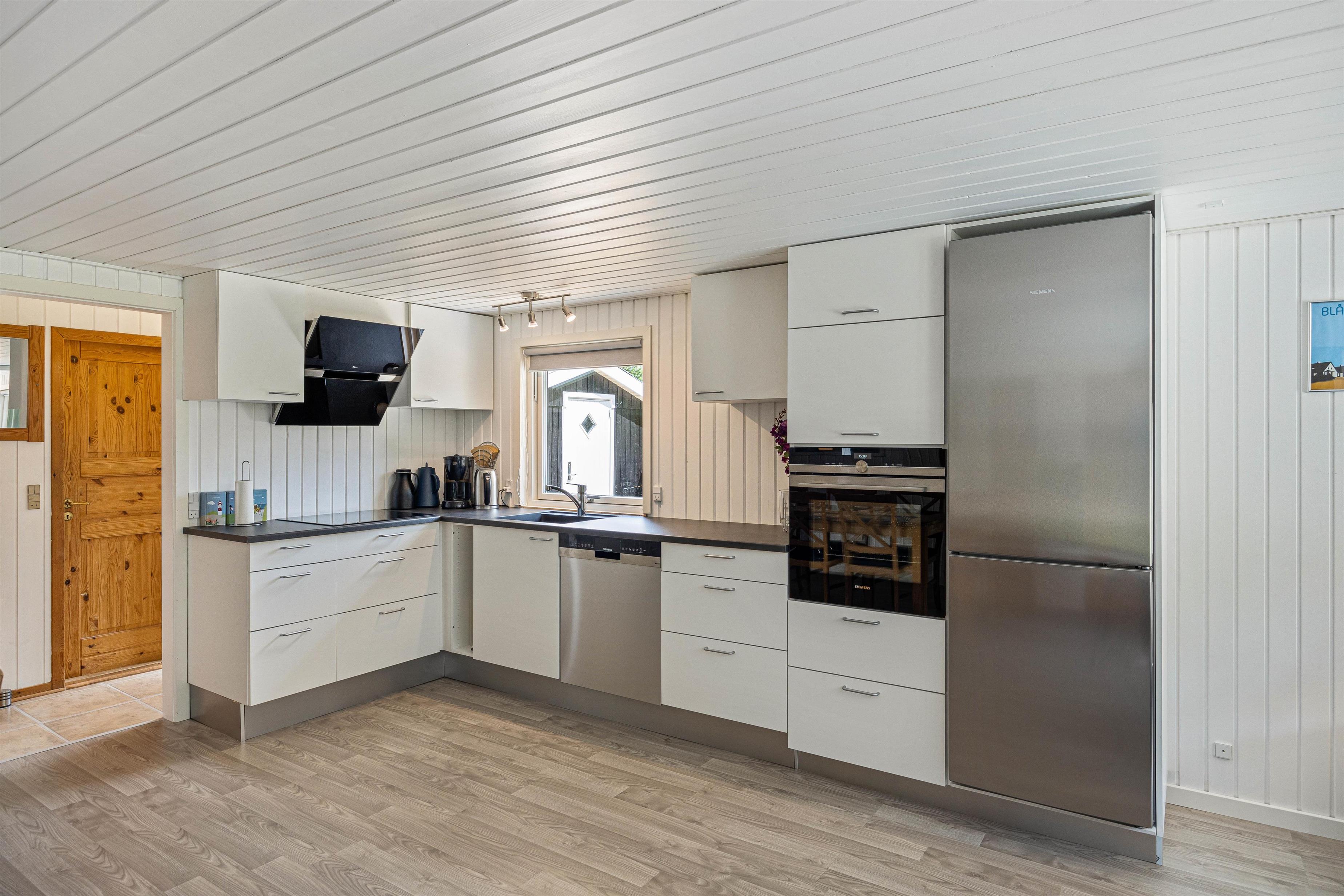 Alrummet i feriehuset forener køkken, stue og spisestue, og det vil uden tvivl blive jeres store samlingspunkt på ferien. Vær sammen om madlavningen i køkkenet, sjove spil ved spisebordet eller spændende film i tv’et. Alt sammen akkompagneret af brændeovnen, der med sin knitren og varme skruer op for feriestemningen.