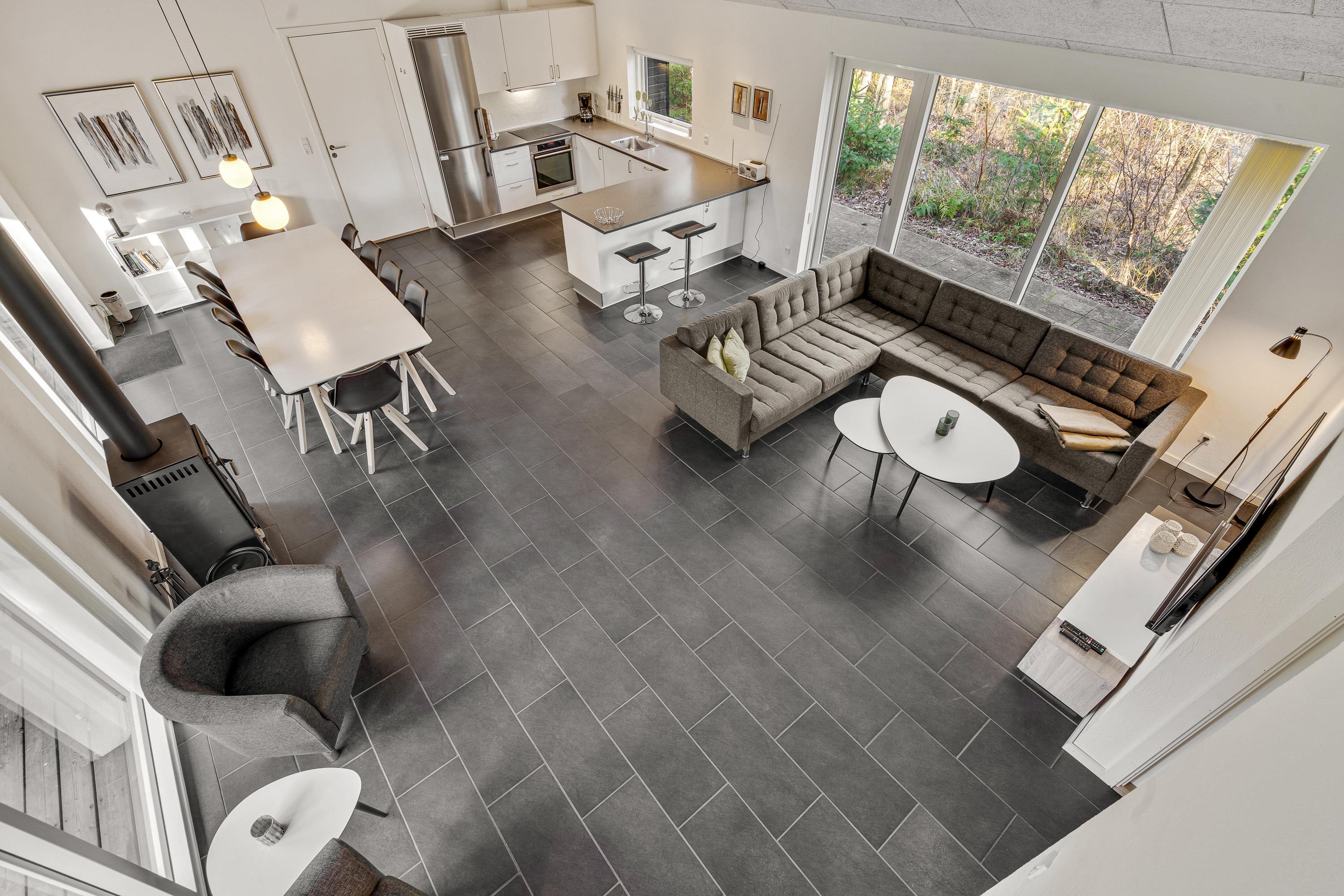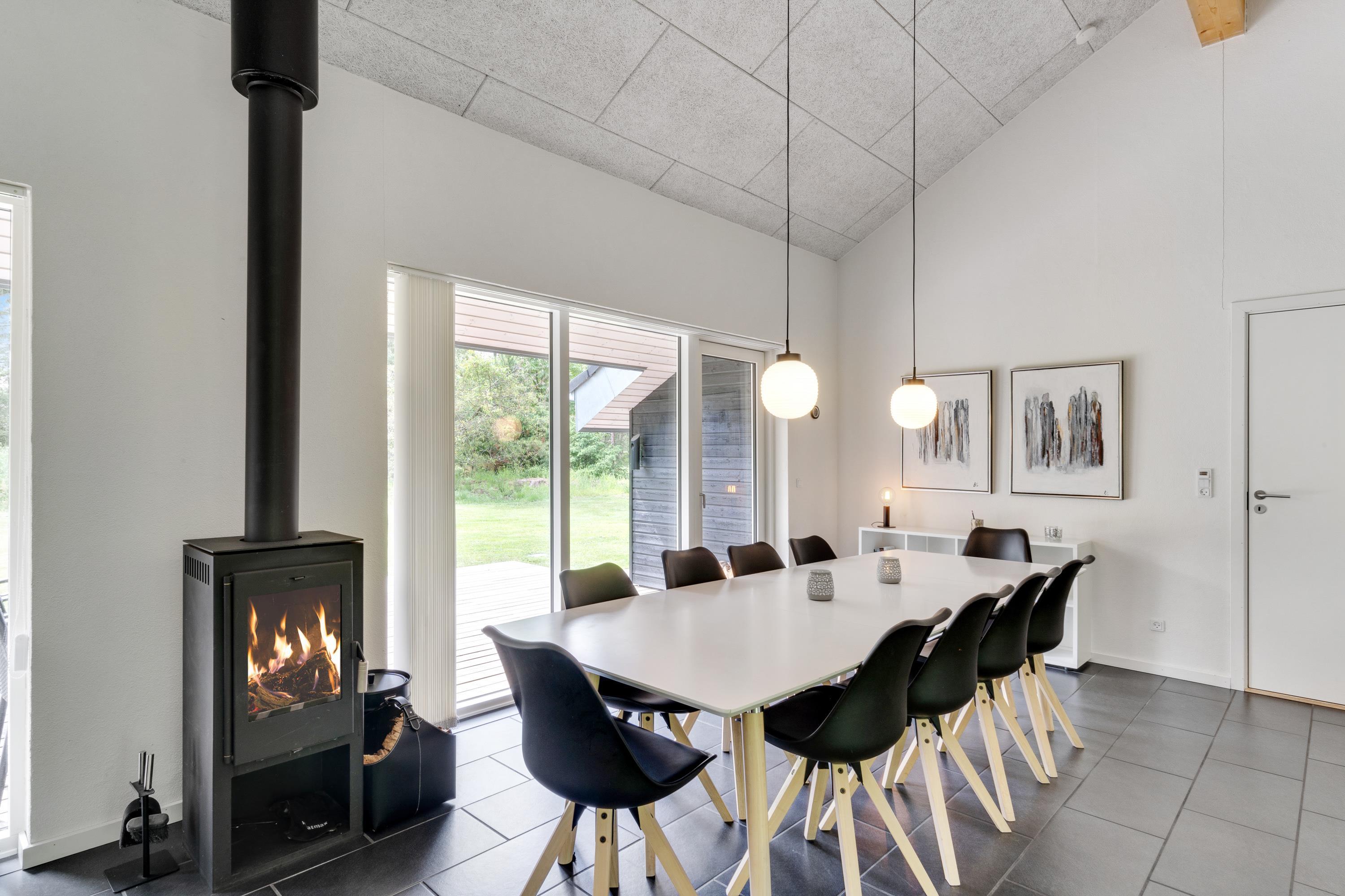 Den stilrene indretning og de lyse omgivelser byder jer straks velkommen. Der er højt til loftet, hvilket bidrager til en rolig og åben stemning. Køkken og stue er ligeledes i et stort rum, hvor I kan nyde hinandens samvær foran den knitrende brændeovn.