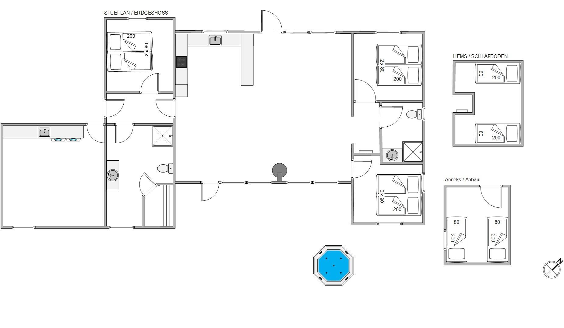 De 10 sovepladser er fordelt på 4 soveværelser, hvor 2 af sovepladserne er i annekset. Yderligere finder I 2 sovepladser på hemsen, som helt sikkert vil blive et hit for børnene. Desuden har sommerhuset to gode badeværelser, som også begge er med gulvvarme.