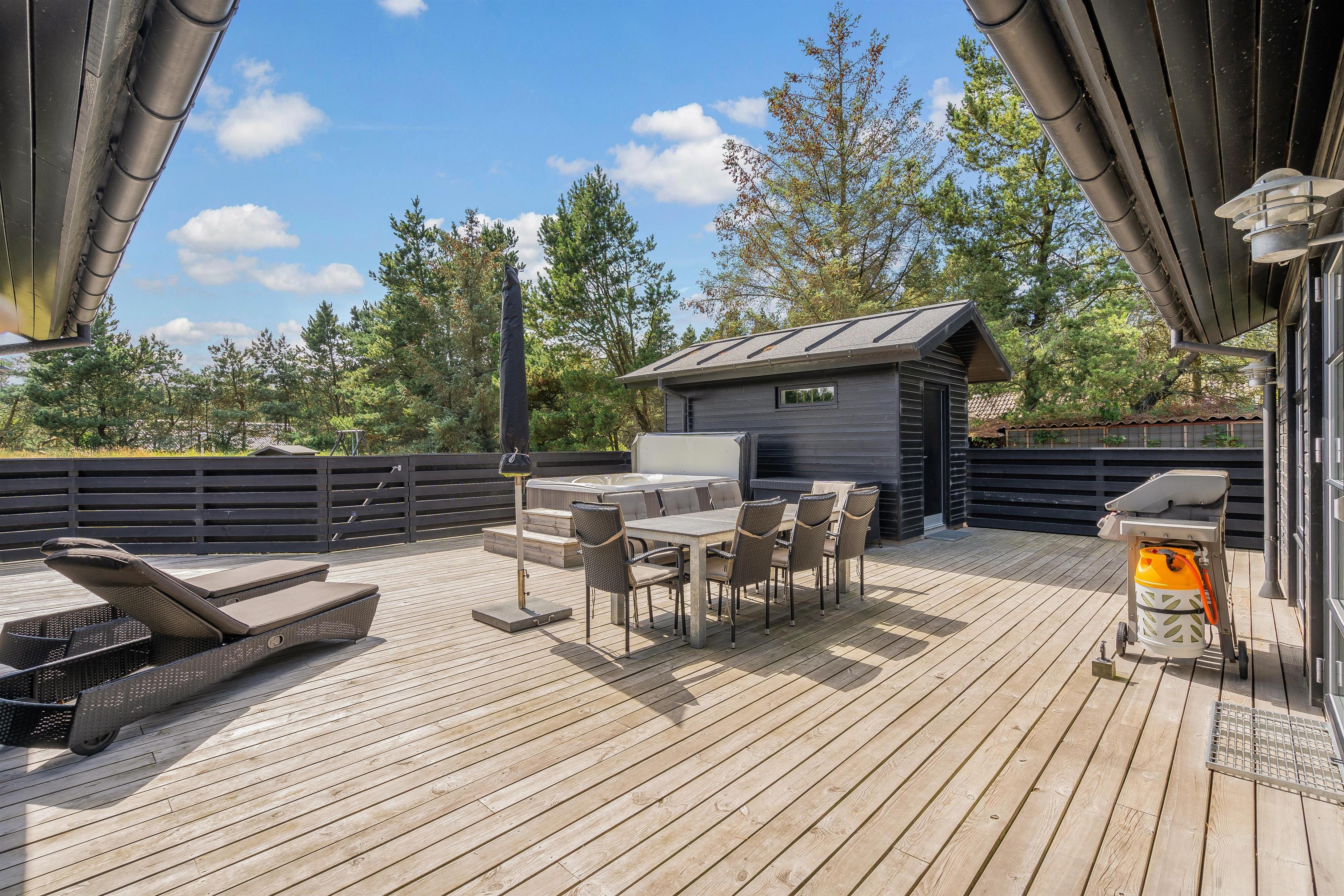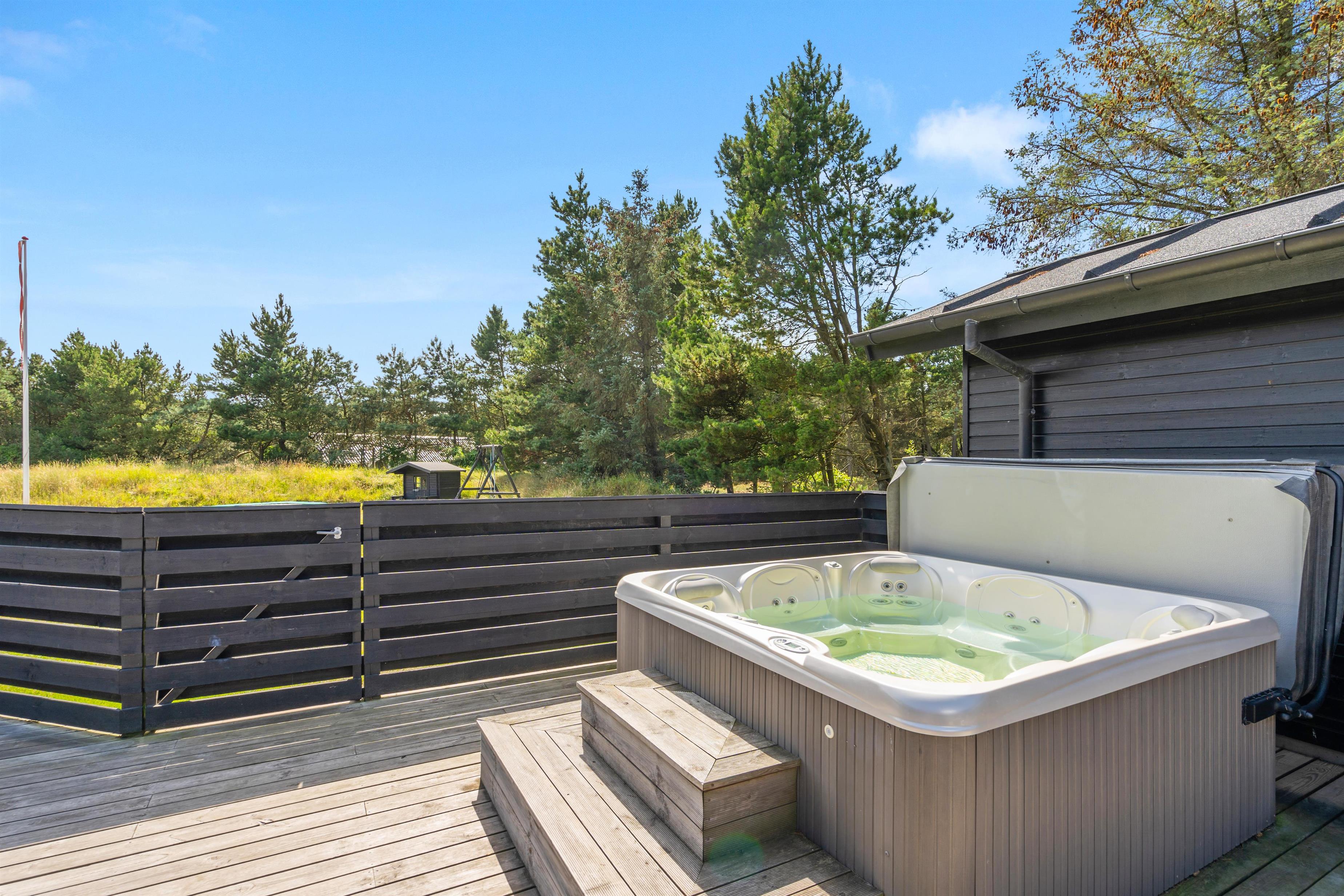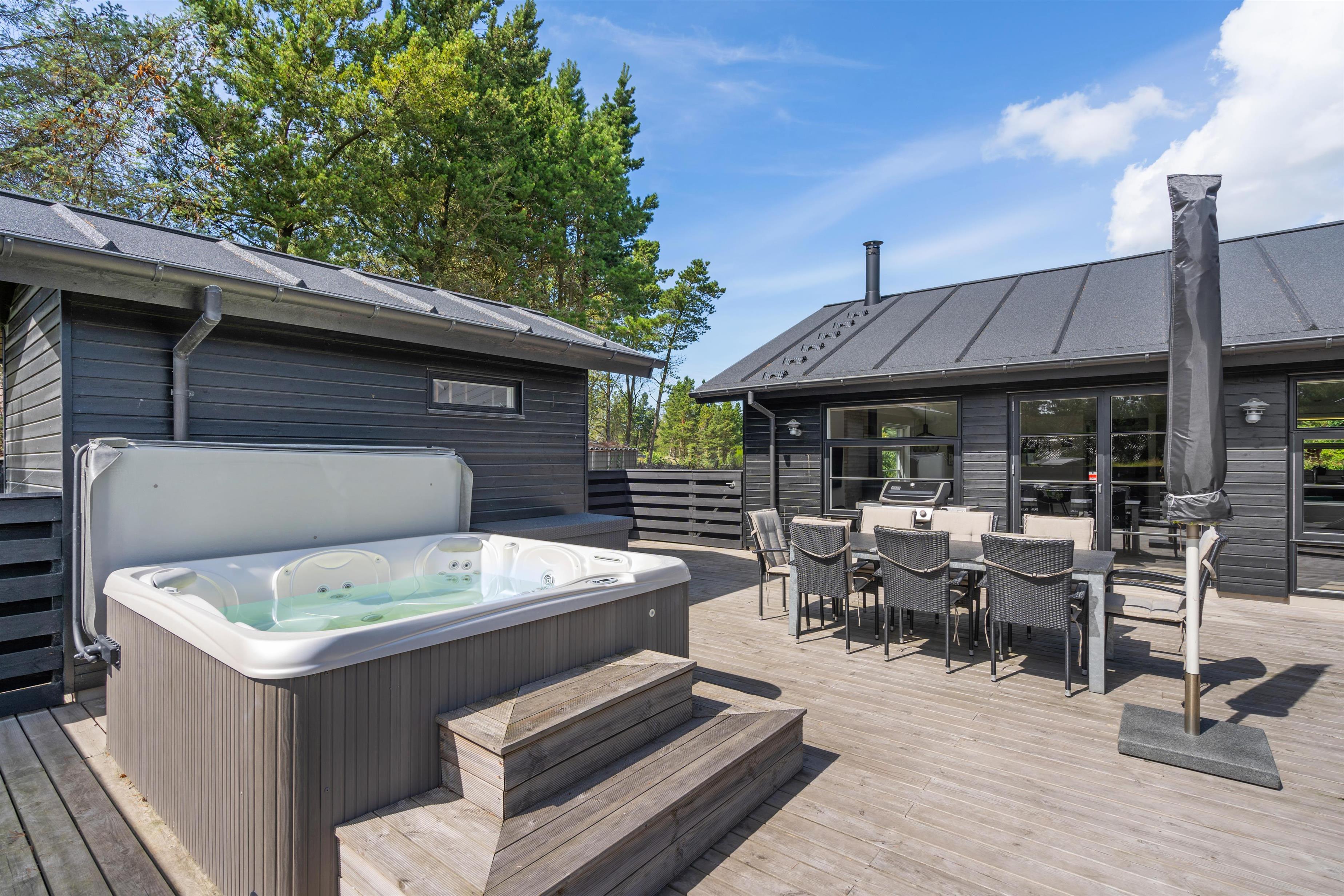 Udvendigt finder I en fantastisk lækker terrasse med udendørs spabad, hvor alle feriegæster uden problemer finder en plads i solen.