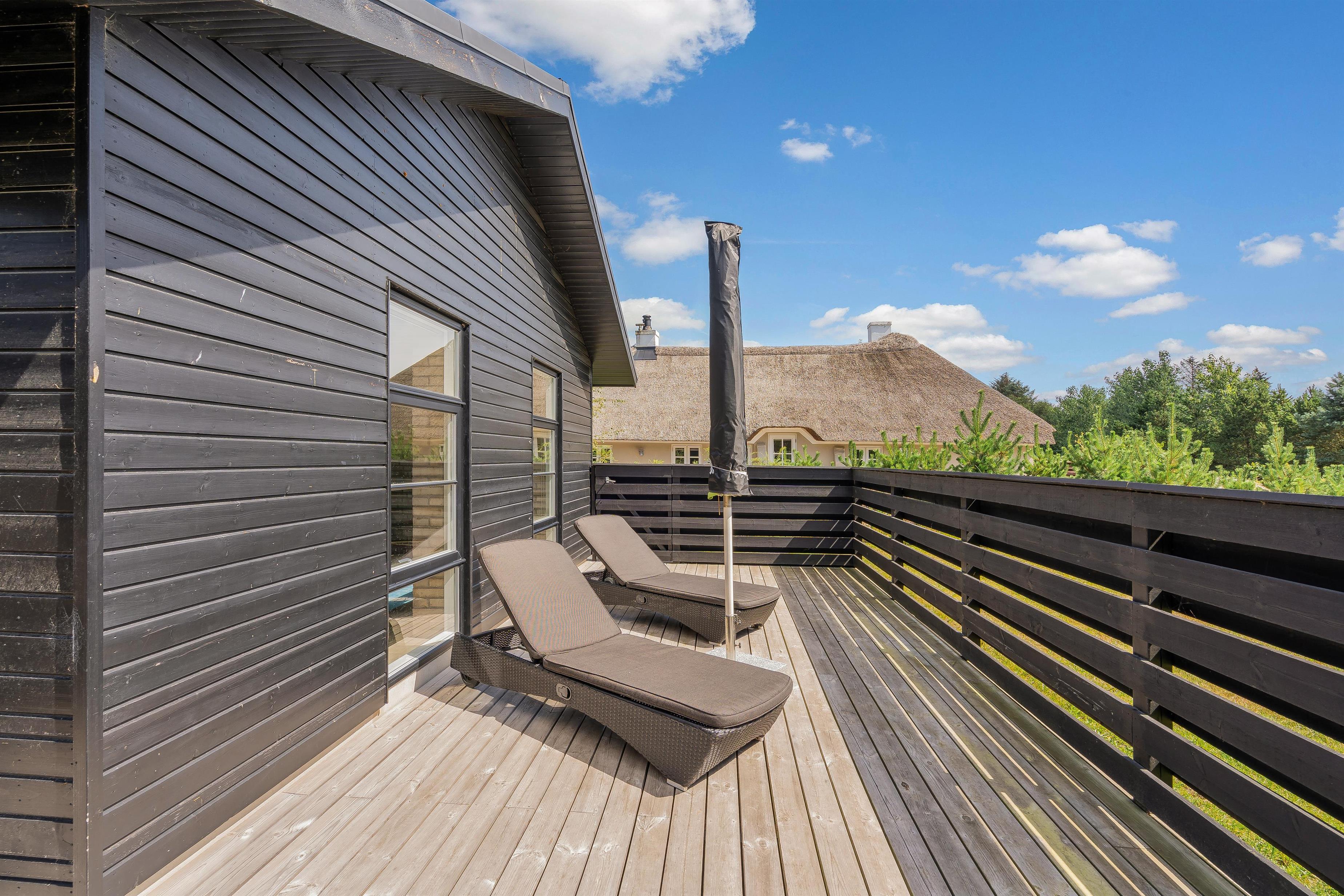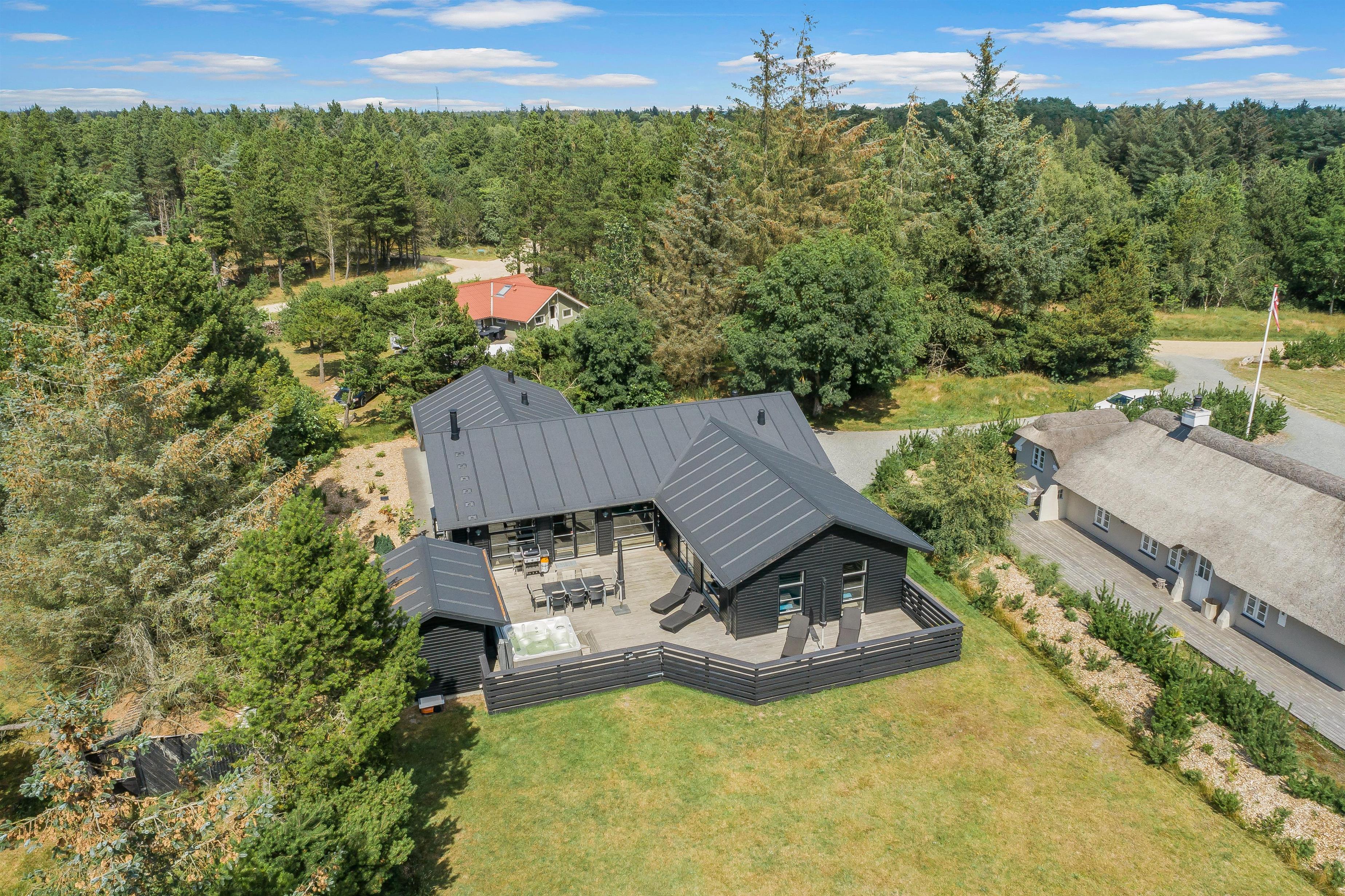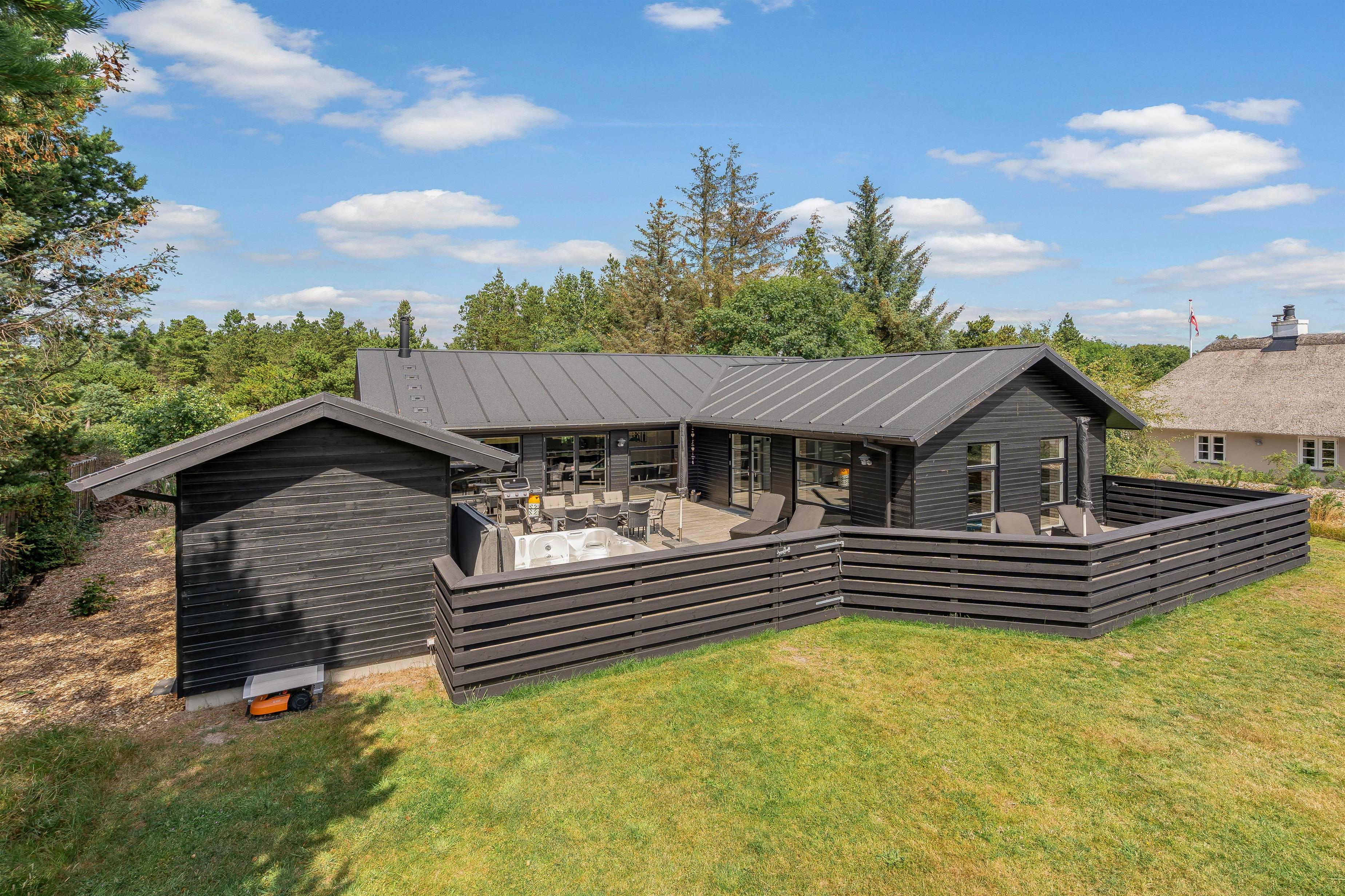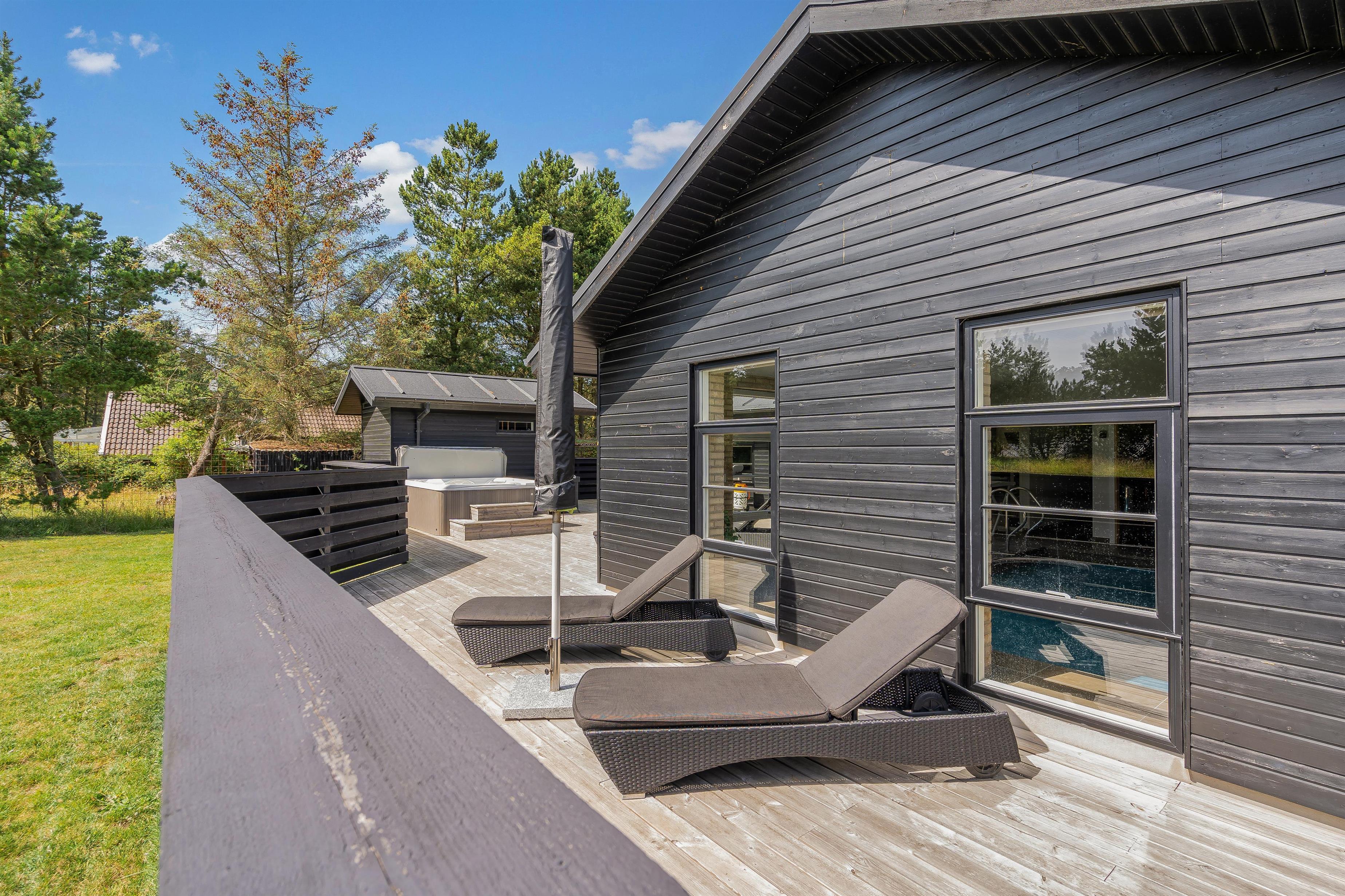 Udvendigt finder I en fantastisk lækker terrasse med udendørs spabad, hvor alle feriegæster uden problemer finder en plads i solen.