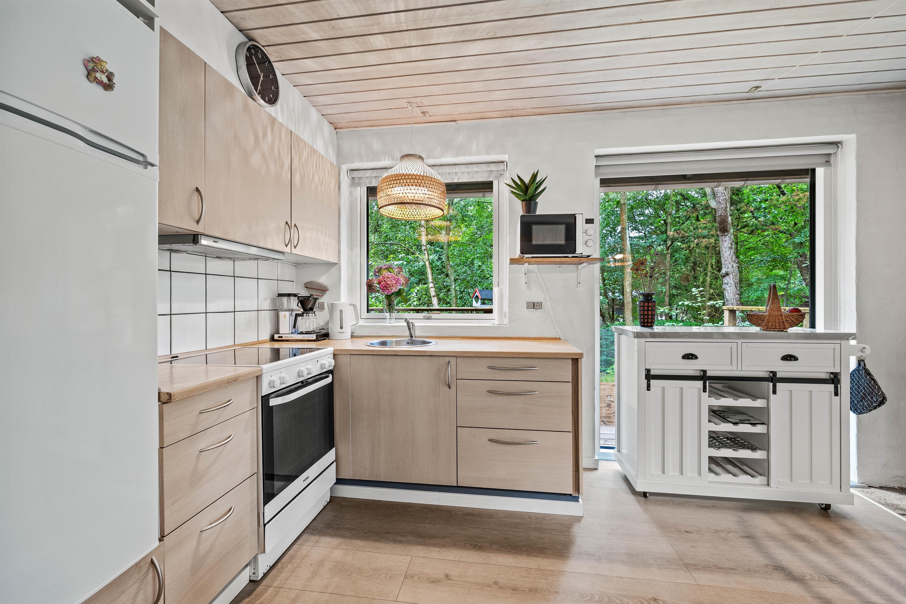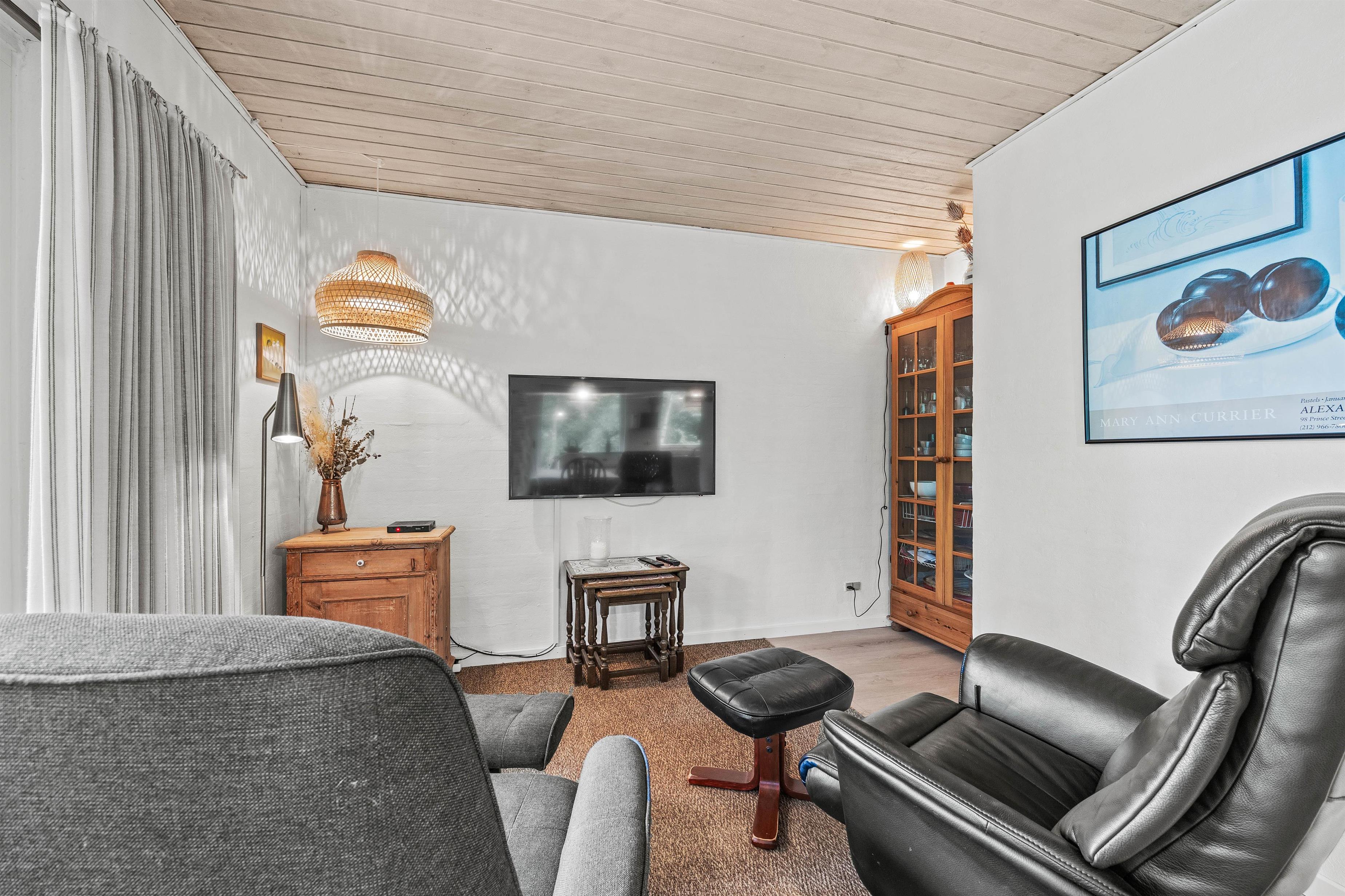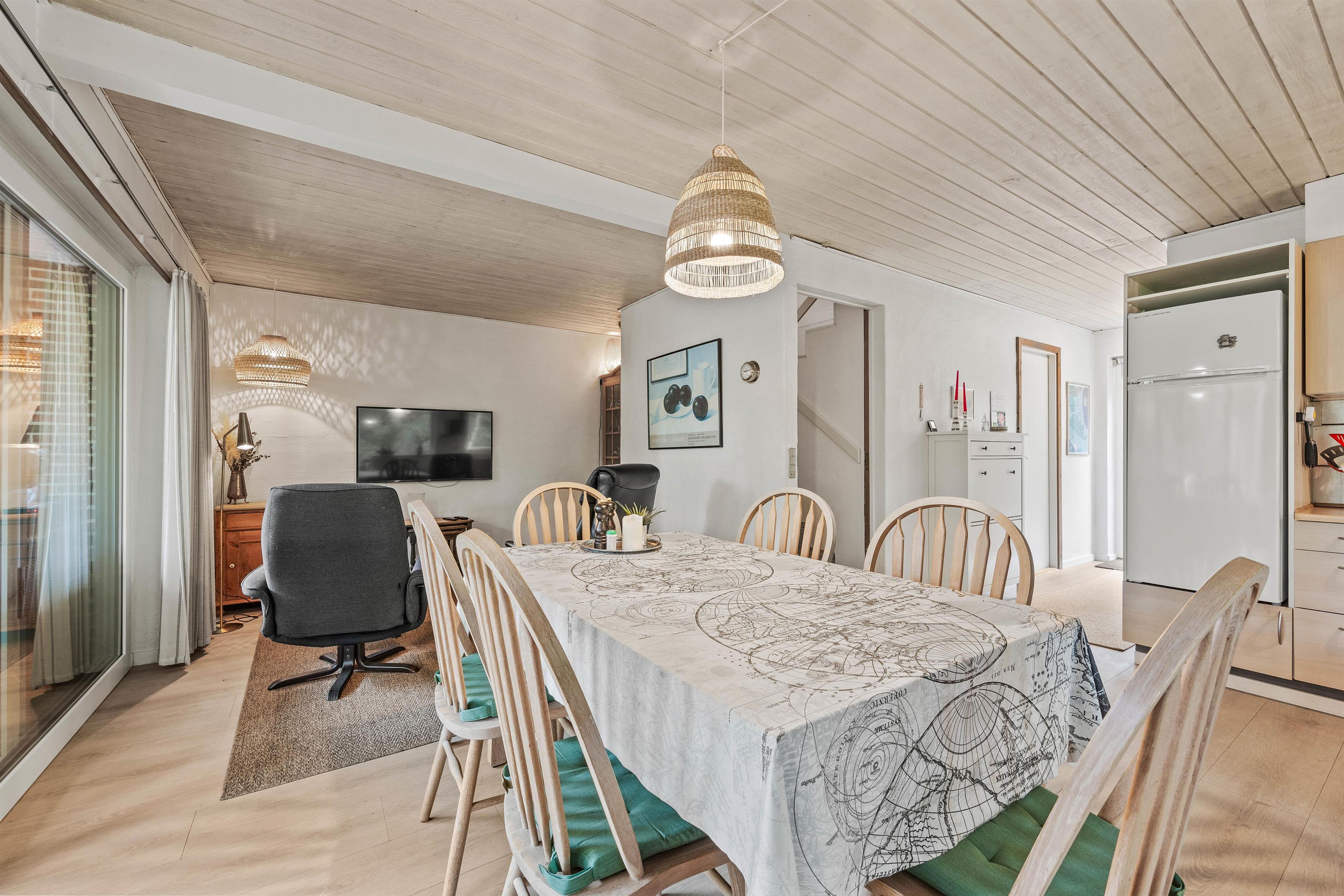 I stueplan er et åbent og lyst rum med køkken, spisestue og opholdsstue i ét. Her er plads til fælles madlavning, spilleaftner og meget mere! Saml familien omkring et hyggeligt brætspil og mærk brændeovnens varme brede sig i rummet - helt perfekt på en kølig aften. Det er også i stueplan I finder husets toilet og badeværelse samt det ene af de 3 soverum. Praktisk er her en energibesparende luft-til-luft varmepumpe, som holder strømomkostningerne nede, og en vaskemaskine, så I undervejs kan opfriske badehåndklæderne.