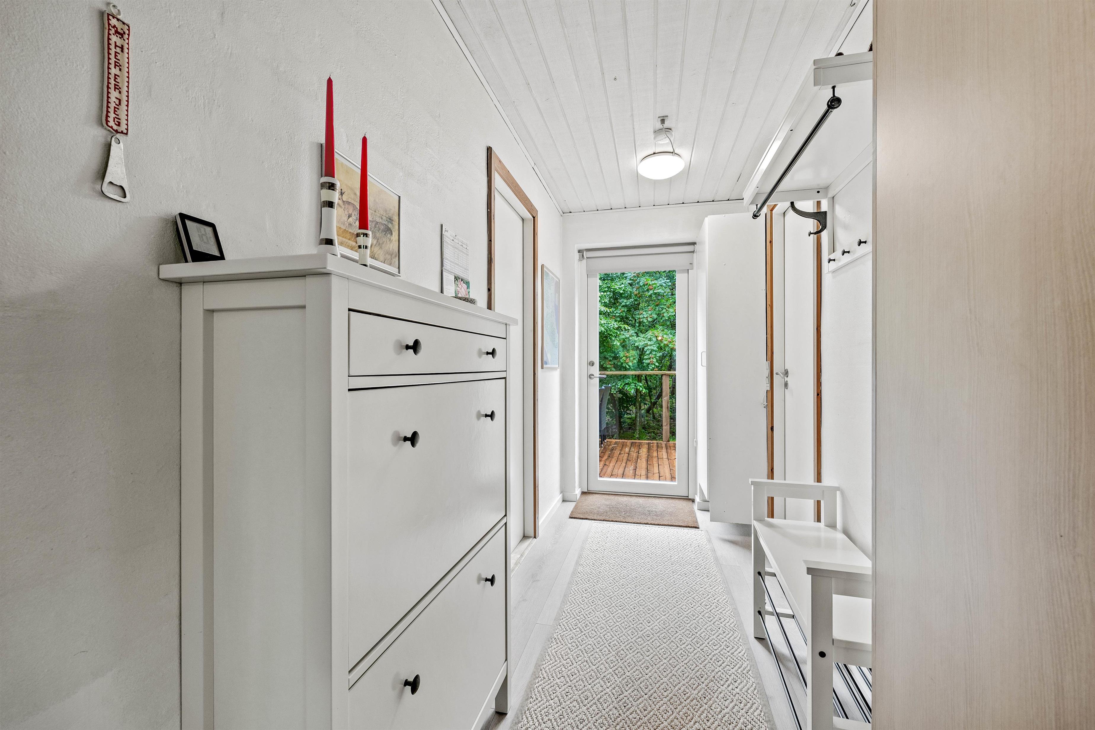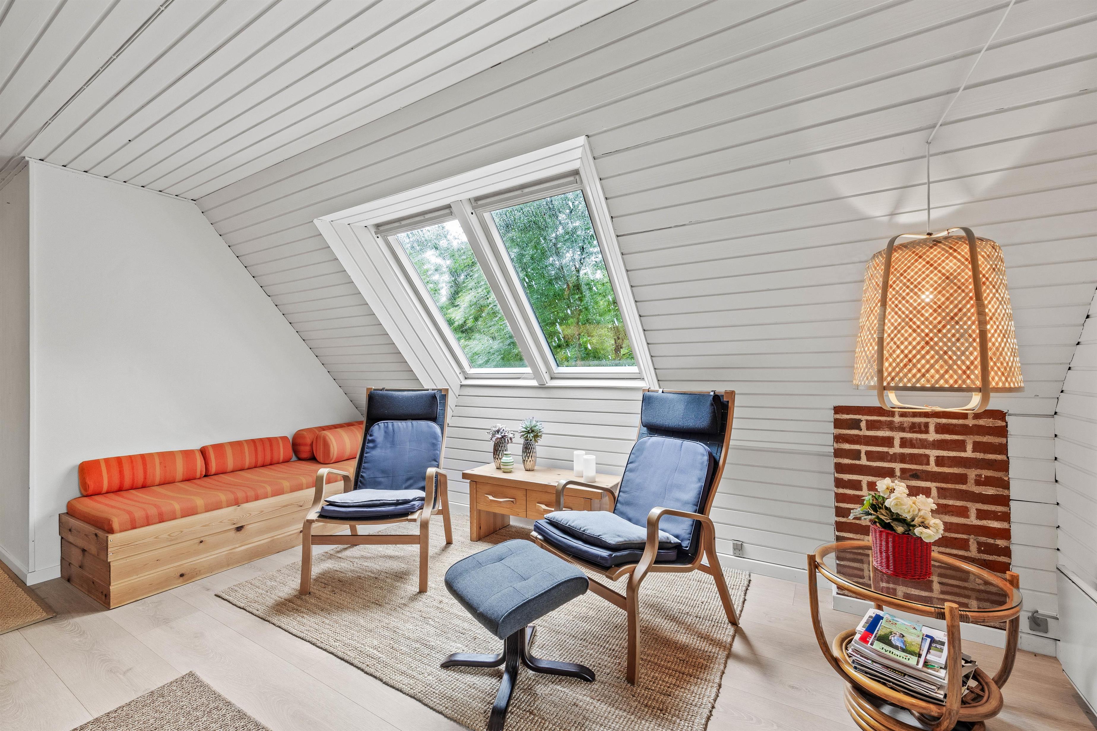 På førstesalen finder I de resterende 2 værelser samt endnu en opholdsstue. Fra opholdsstuen på førstesalen er der udgang til en overdækket balkon. Her kan I nyde morgenkaffen og høre fuglenes sang og kvidder.