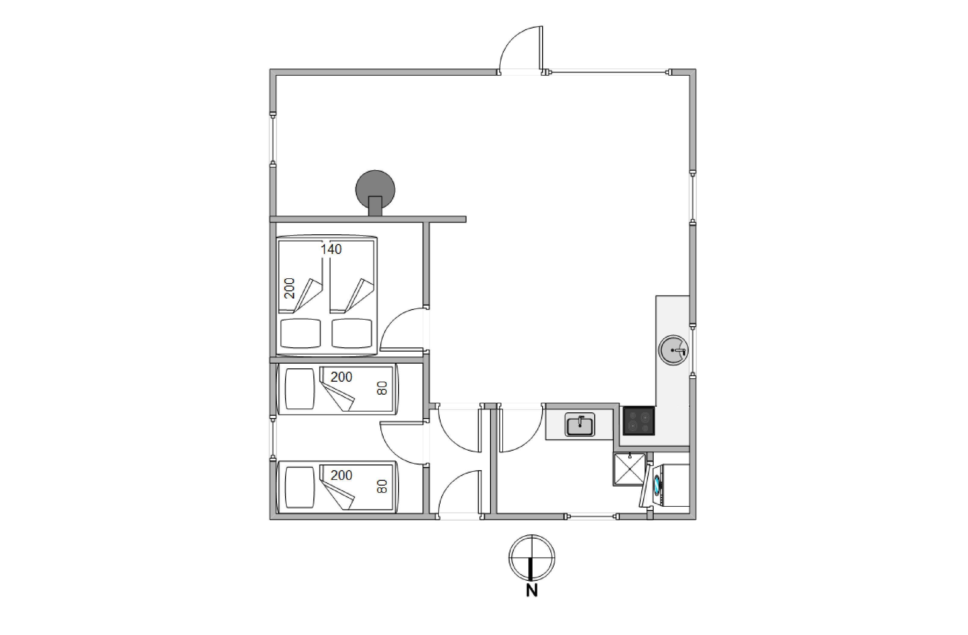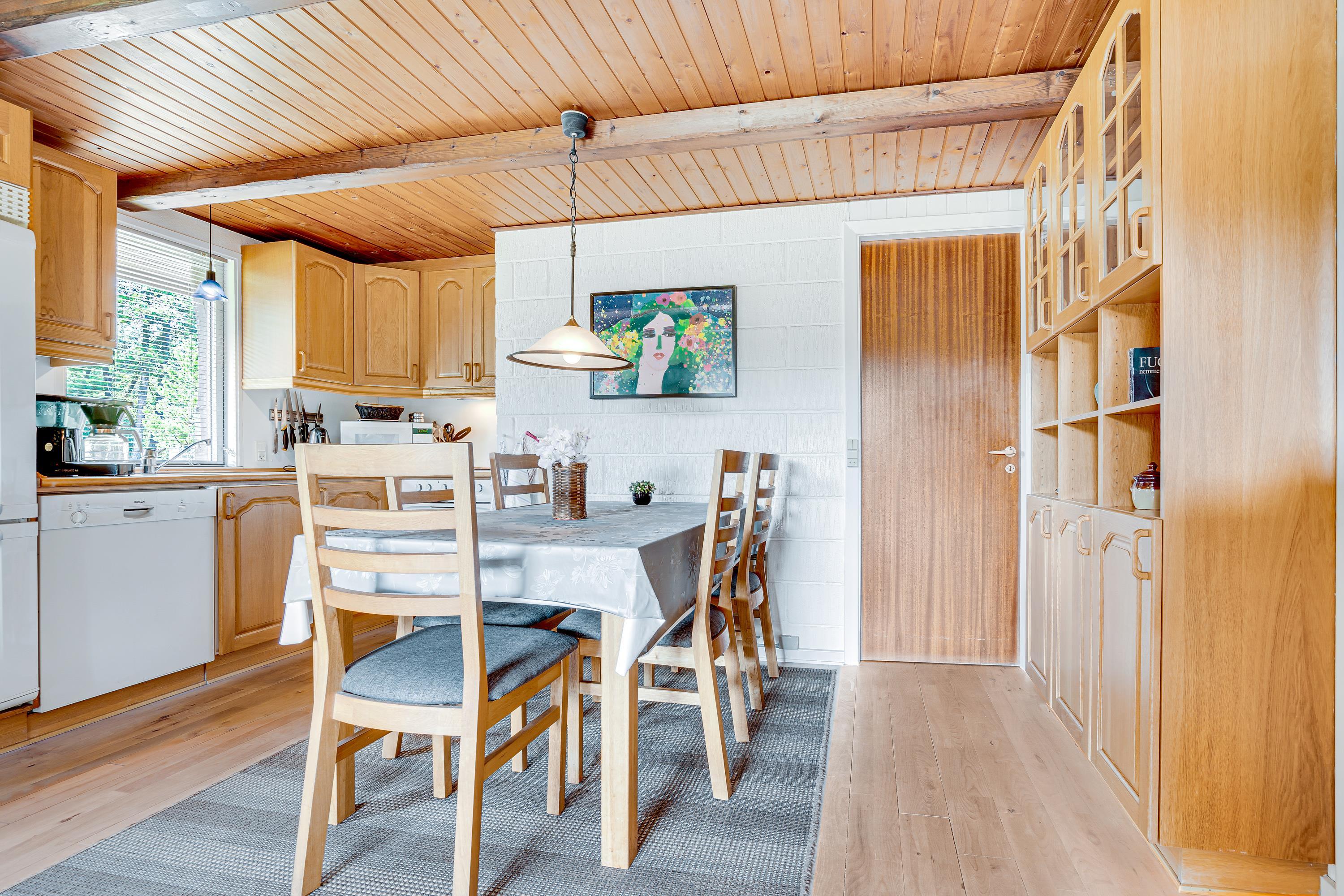 Sommerhusets hjerte er opholdsrummet, der forener køkken, stue og spiseafdeling. Her bliver de sene aftener med lyden af den knitrende ild i baggrunden og med kortspil og gode grin rundt om spisebordet kun endnu hyggeligere.