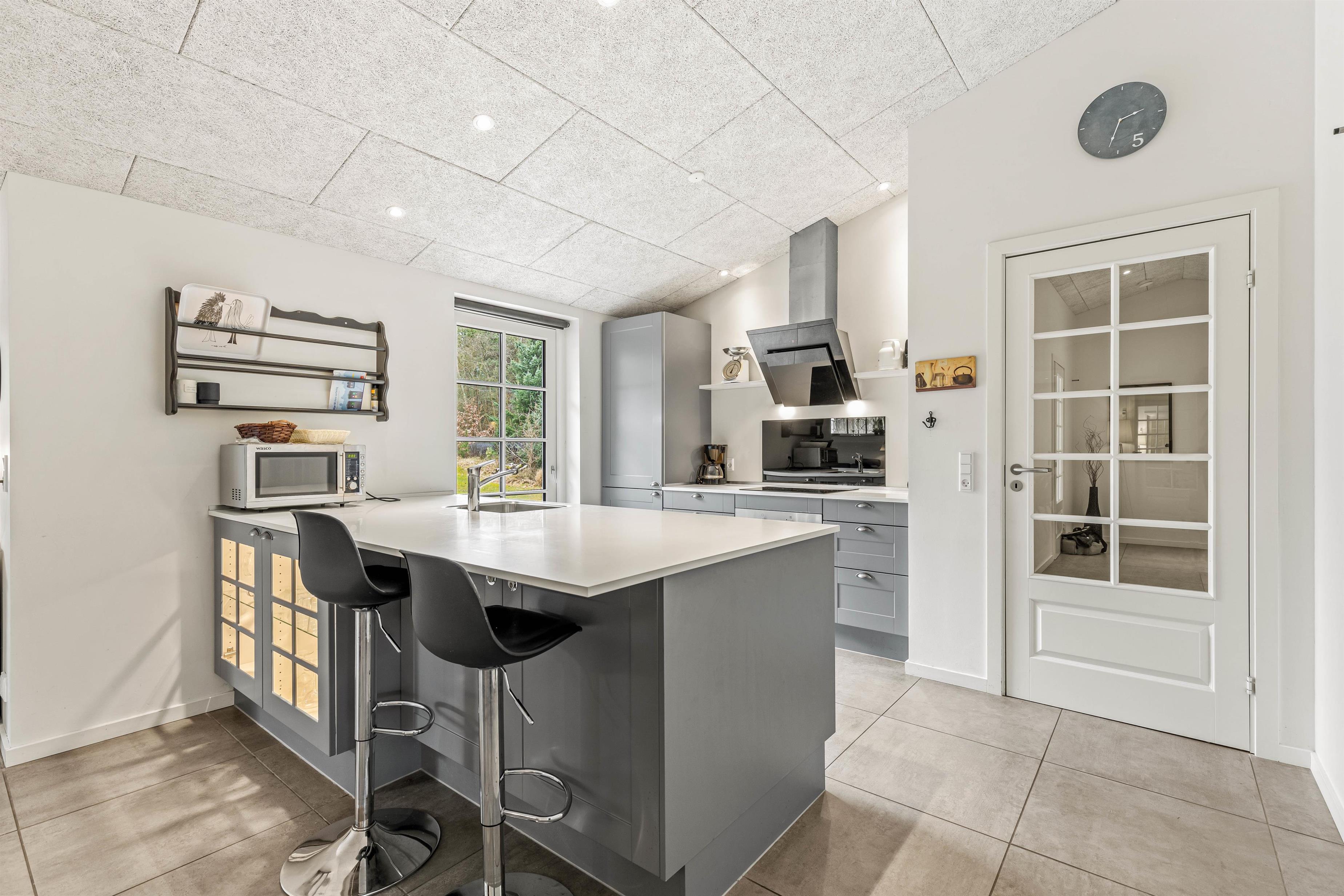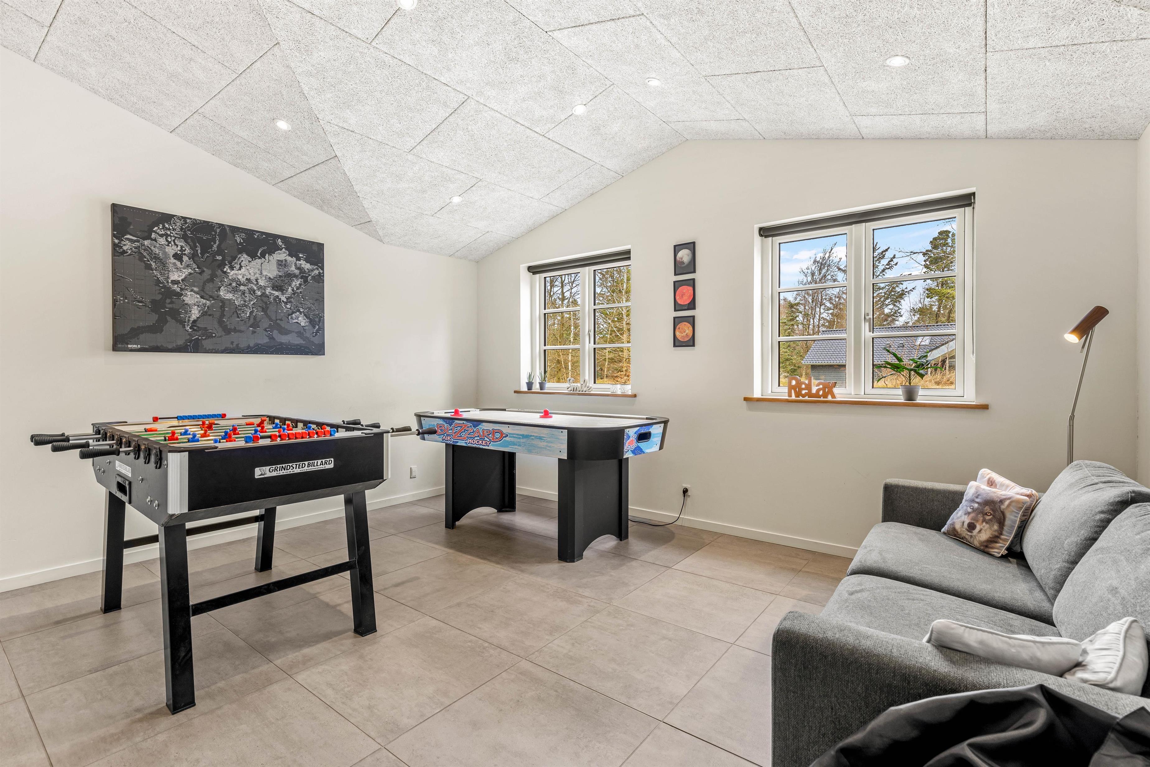 Der er gjort meget ud af, at alle skal befinde sig vel i feriehuset; fra det åbne stue- og køkkenområde kommer man ind i de konkurrenceglade gæsters base, aktivitetsrummet, hvor der både står et airhockeybord og et spil bordfodbold til rådighed. Her kan I rigtig slå jer løs og udfordre hinanden på kryds og tværs.