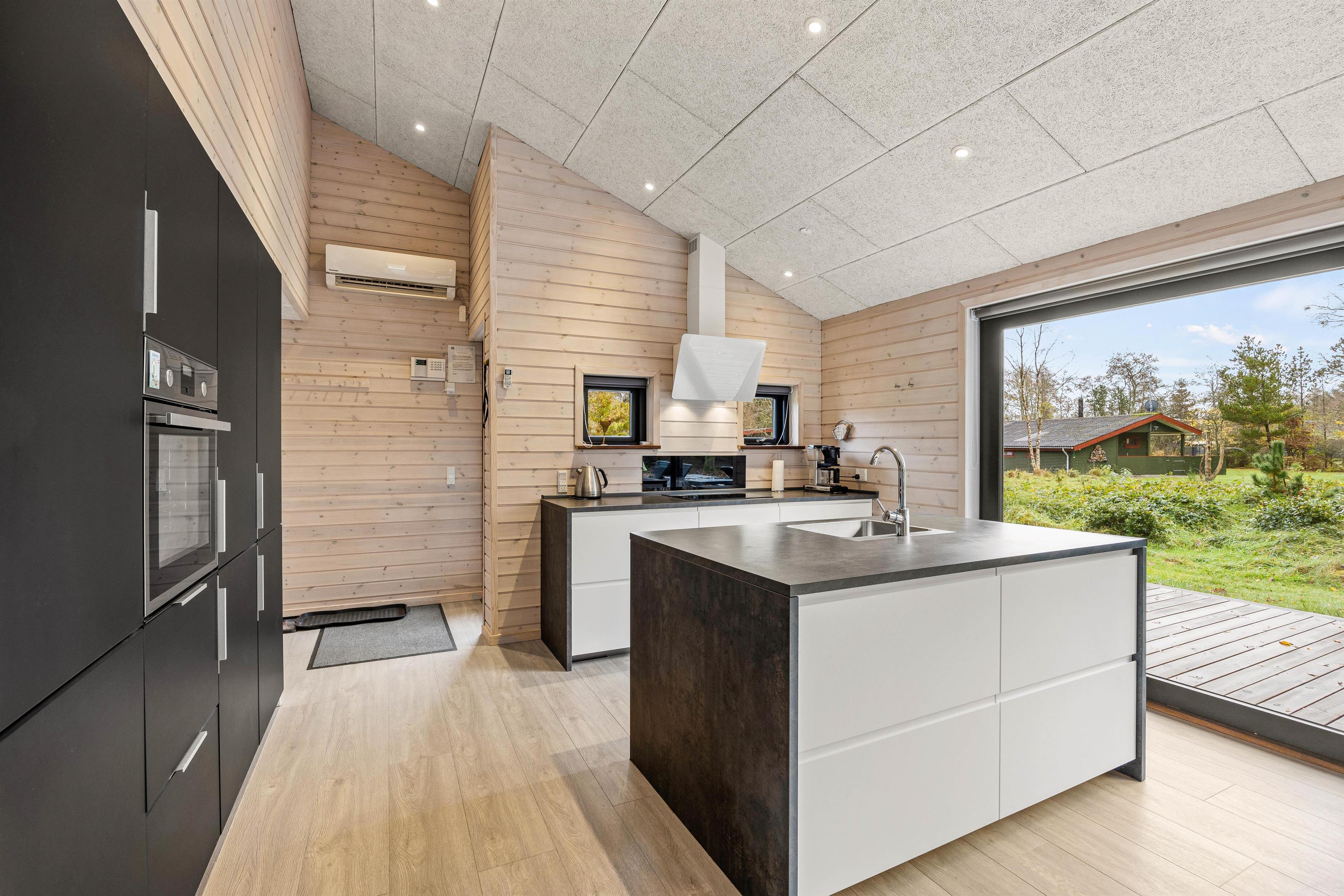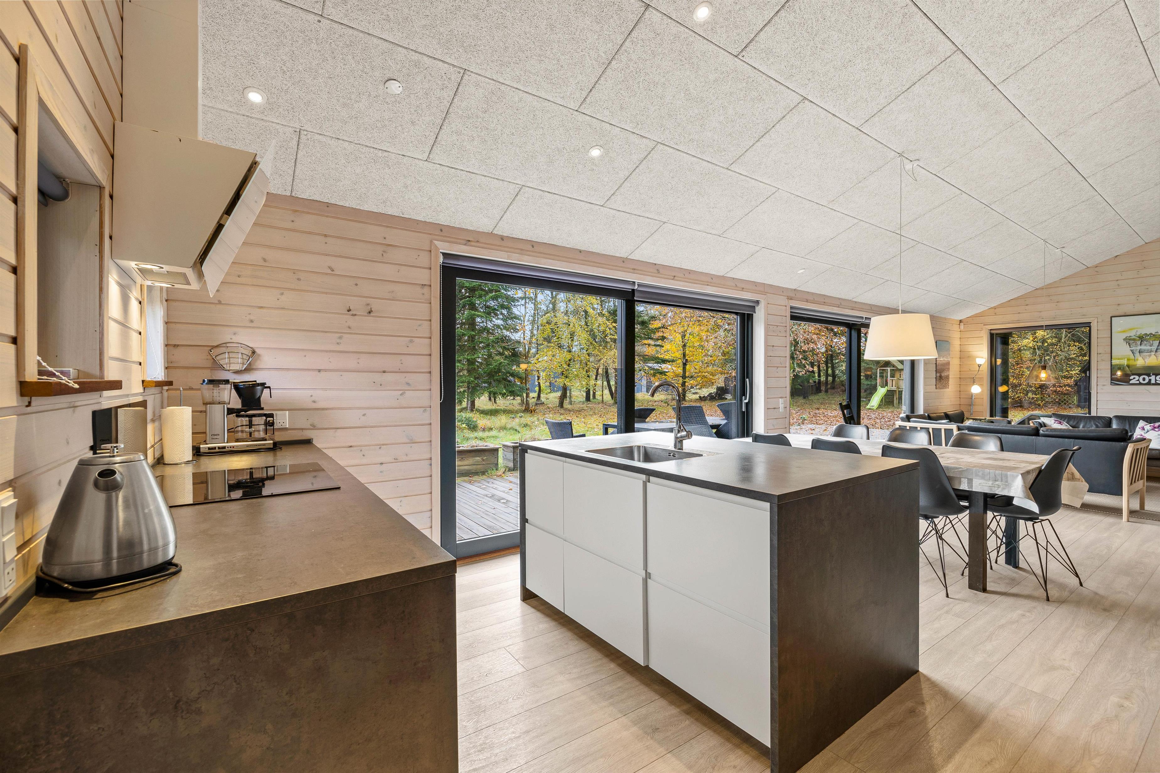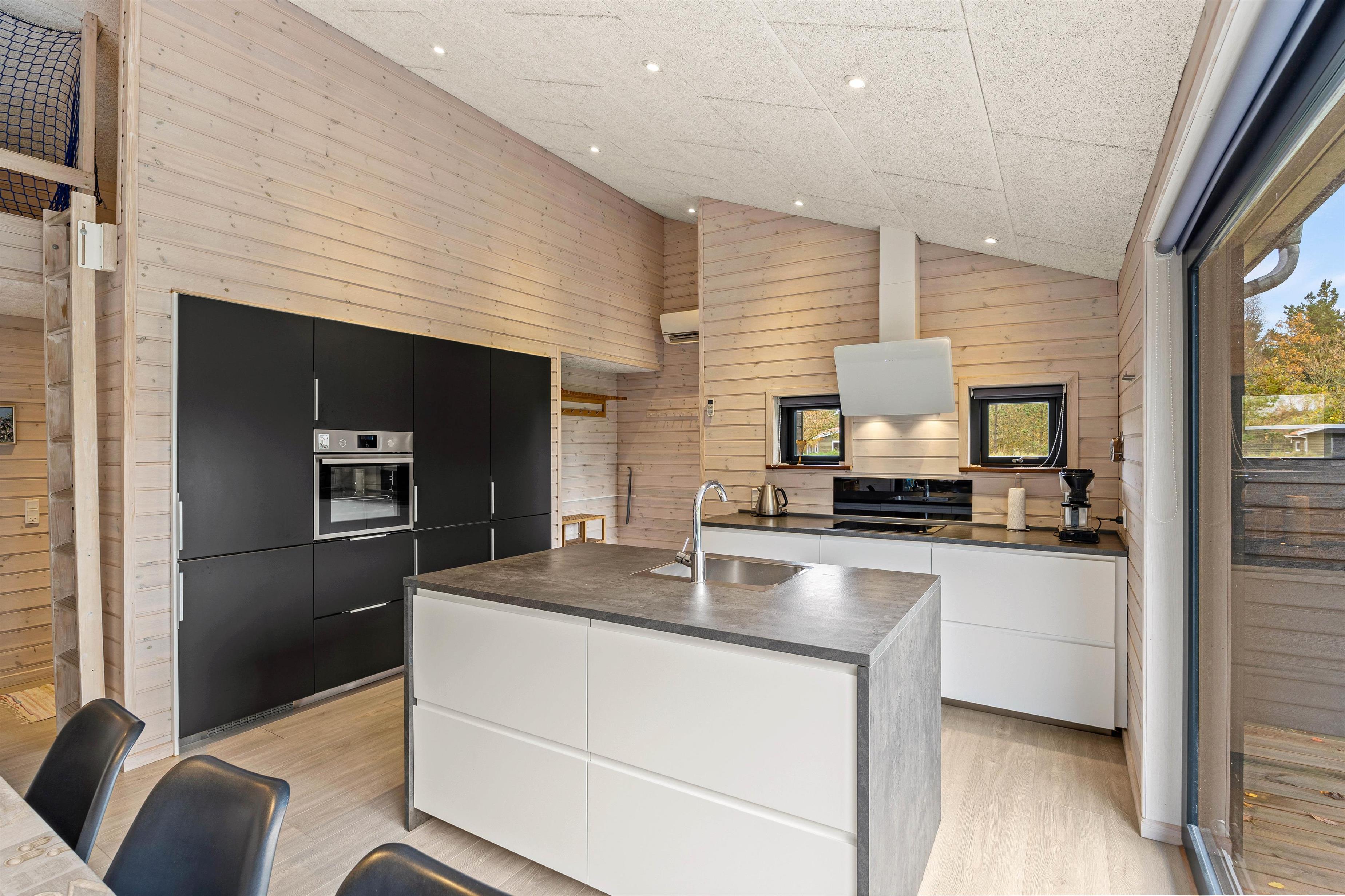 Straks I træder ind i den lille gang med plads til sko og overtøj, møder I den varme atmosfære og ro i feriehuset. Det moderne køkken er udstyret med opvaskemaskine, mikroovn og induktionskogeplade og god skabsplads. Det direkte udsyn til spisebordet lader kokken være en del af samtalen og dem, der slapper af i sofaerne ved brændeovnen, kan også deltage, for det store åbne rum giver mulighed for at være sammen – også hver for sig.