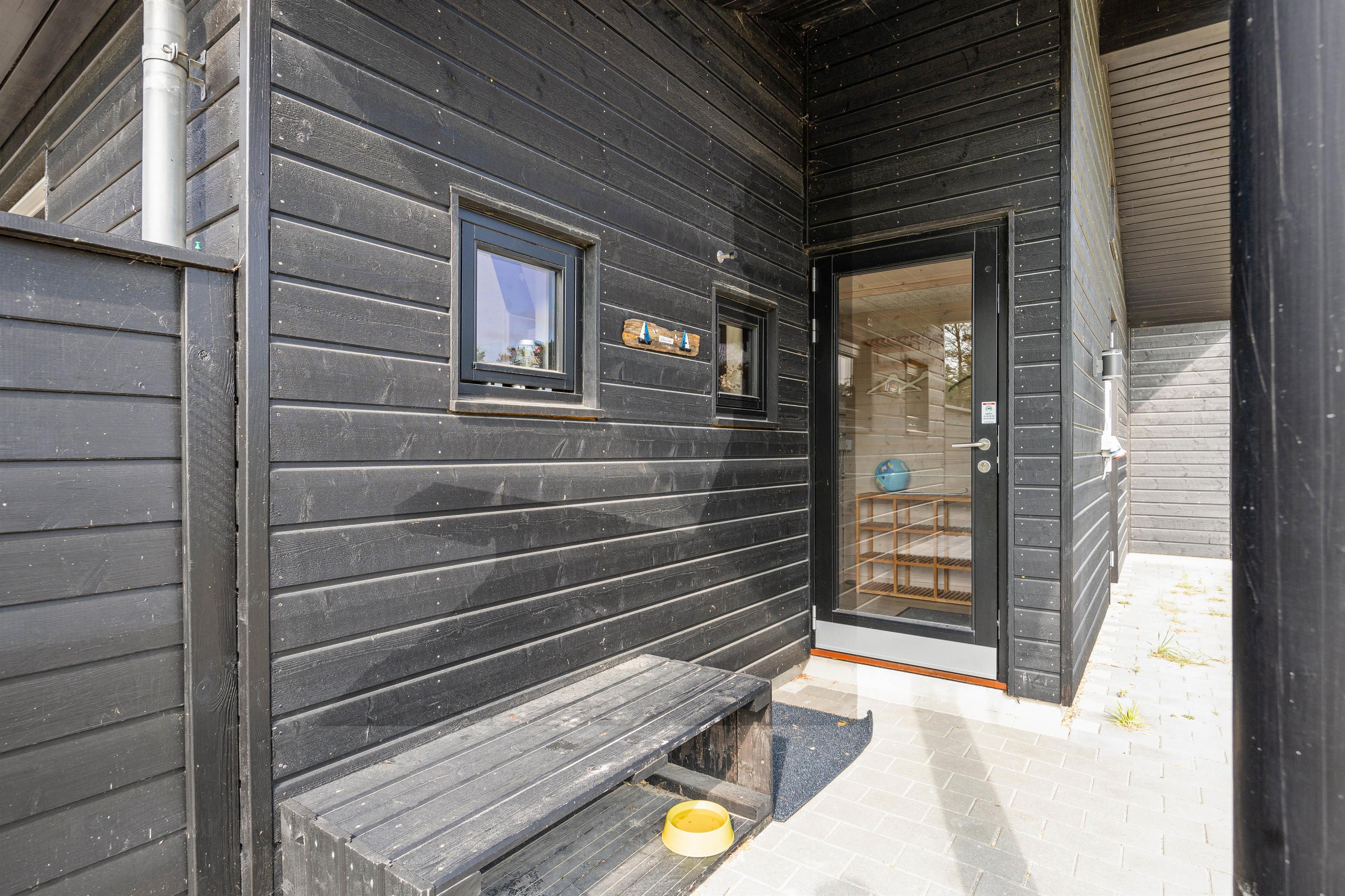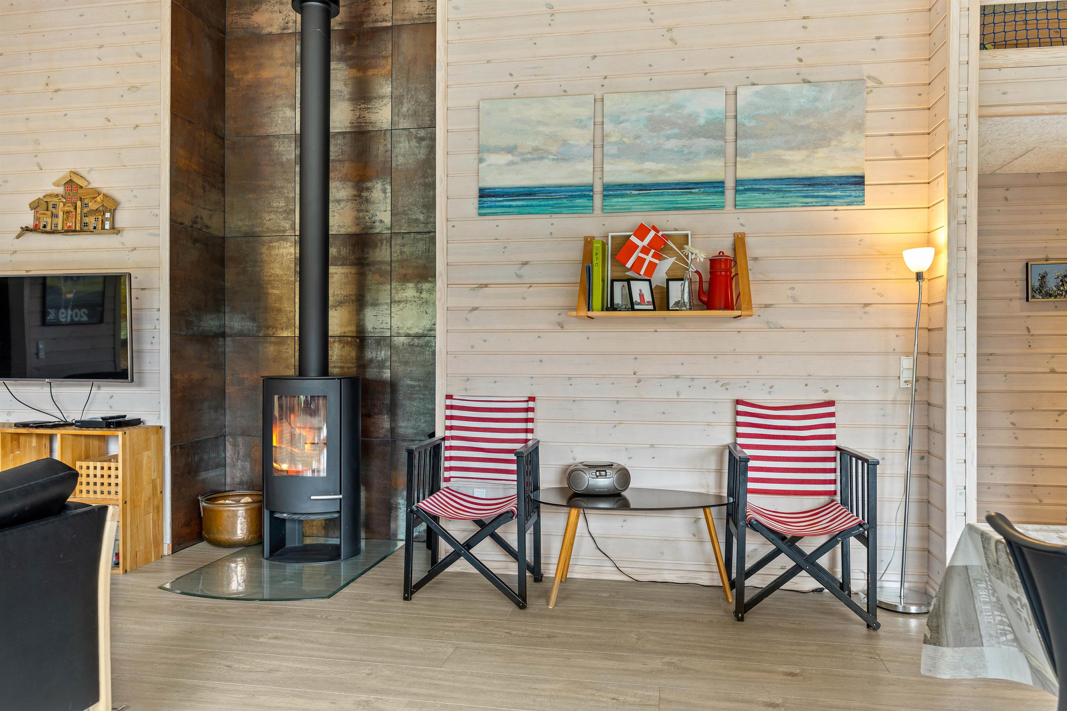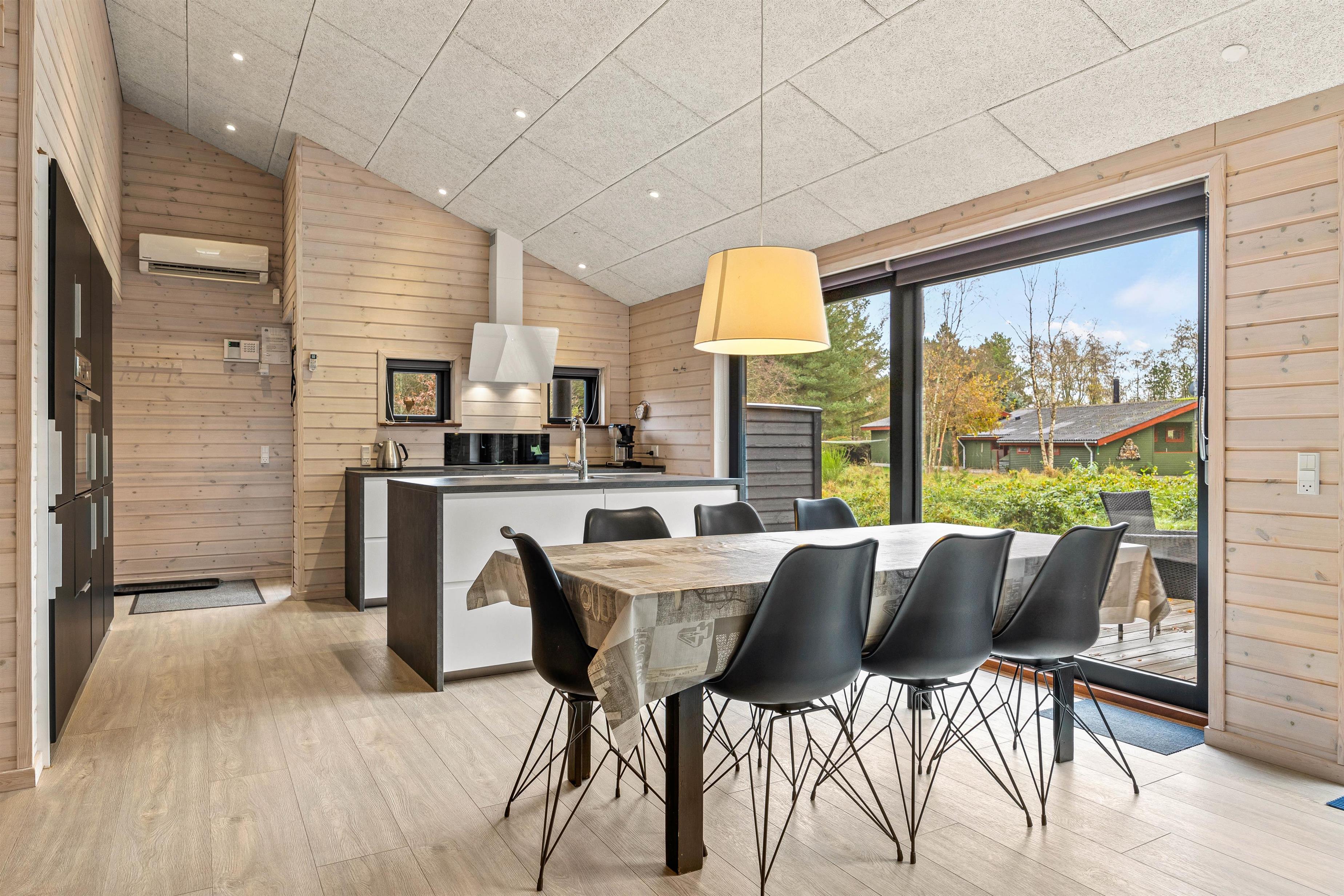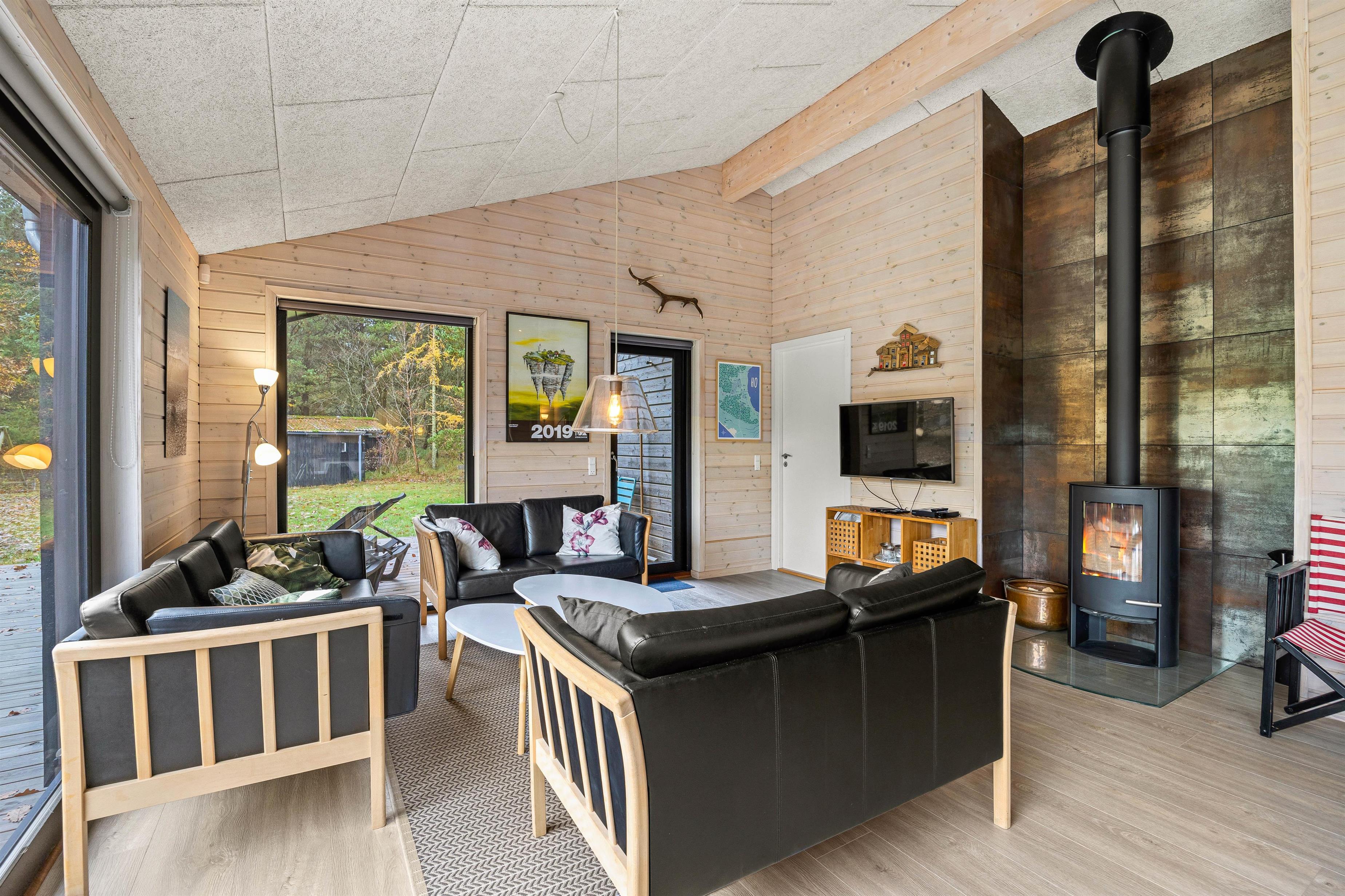 Straks I træder ind i den lille gang med plads til sko og overtøj, møder I den varme atmosfære og ro i feriehuset. Det moderne køkken er udstyret med opvaskemaskine, mikroovn og induktionskogeplade og god skabsplads. Det direkte udsyn til spisebordet lader kokken være en del af samtalen og dem, der slapper af i sofaerne ved brændeovnen, kan også deltage, for det store åbne rum giver mulighed for at være sammen – også hver for sig.