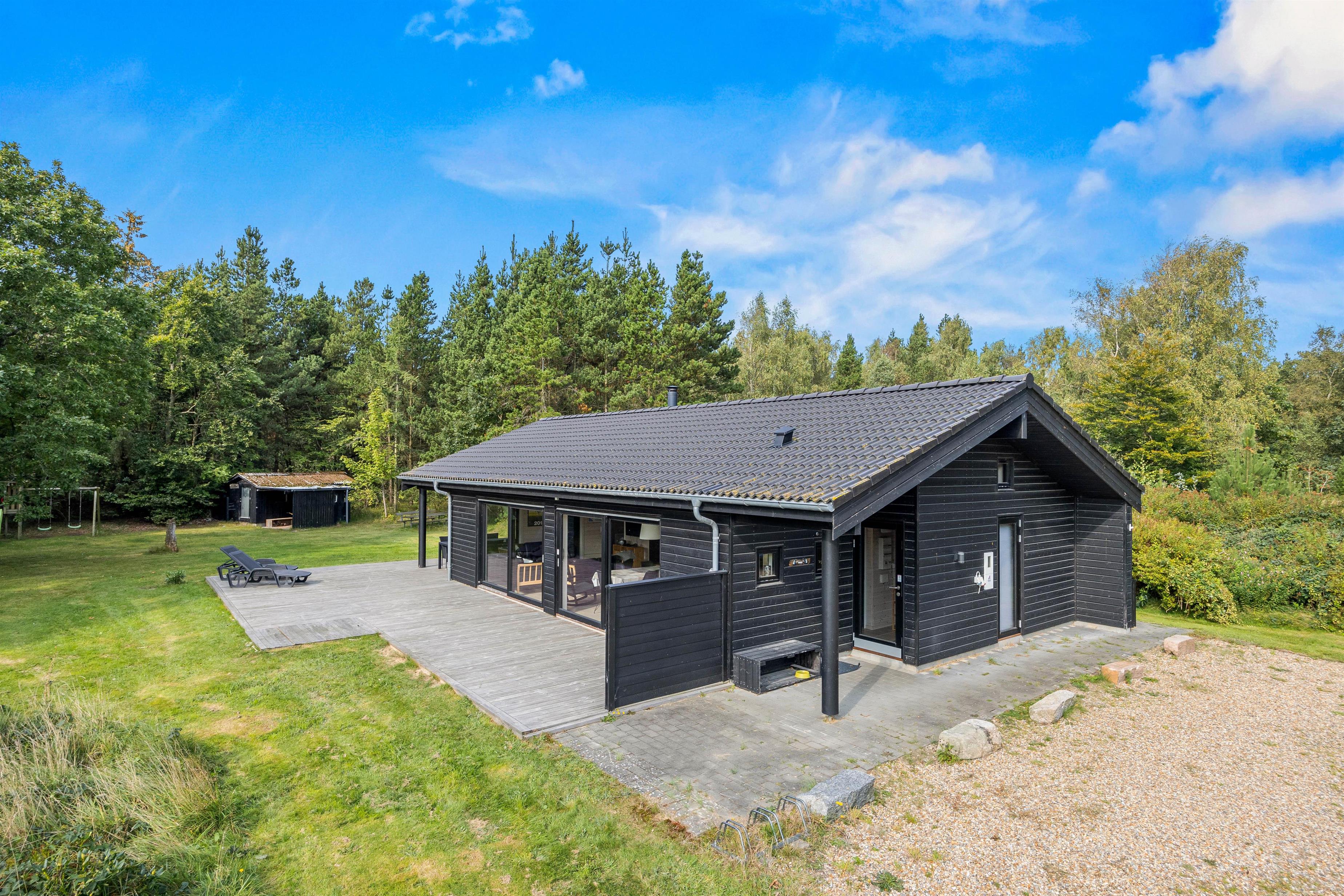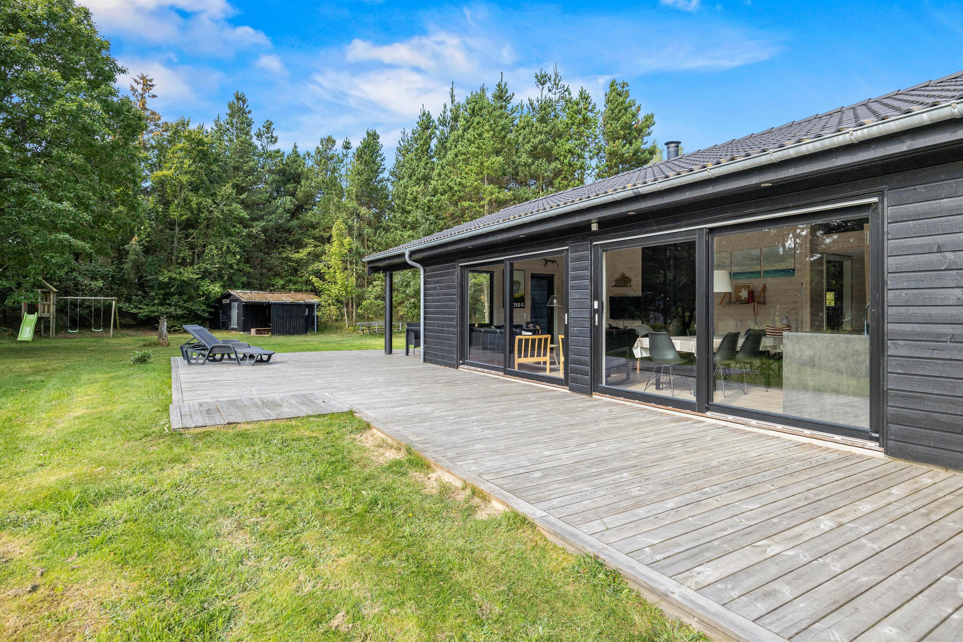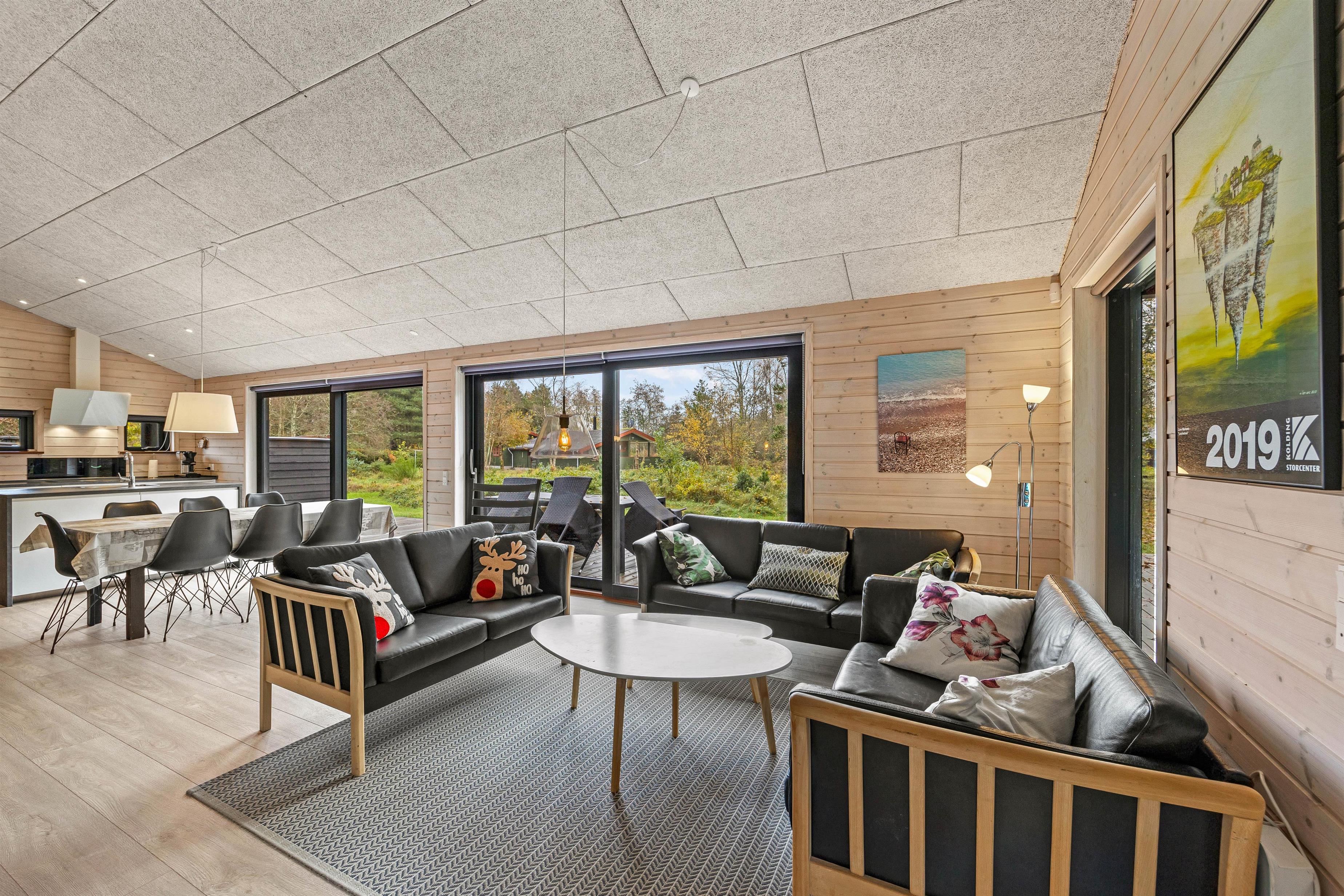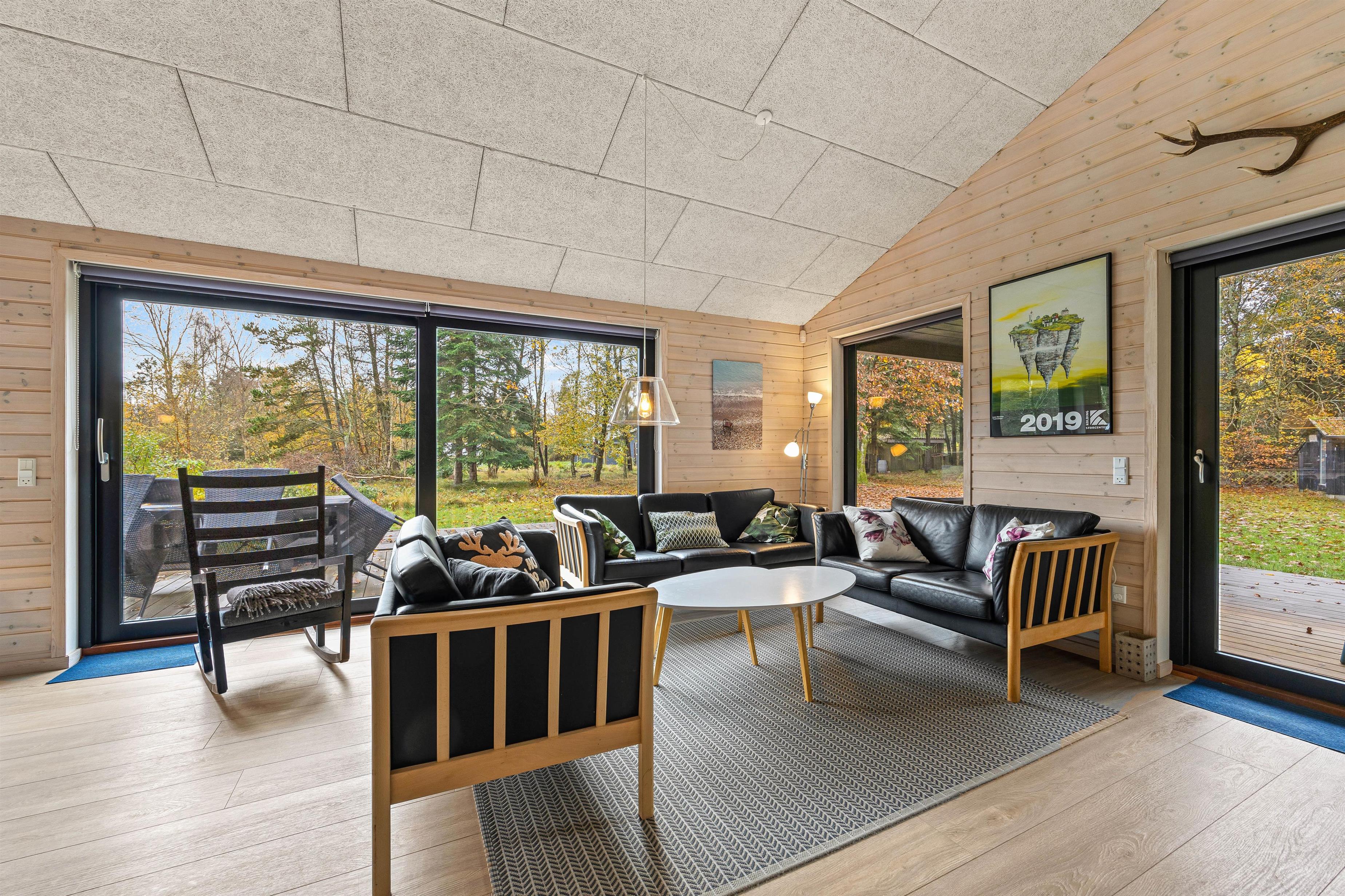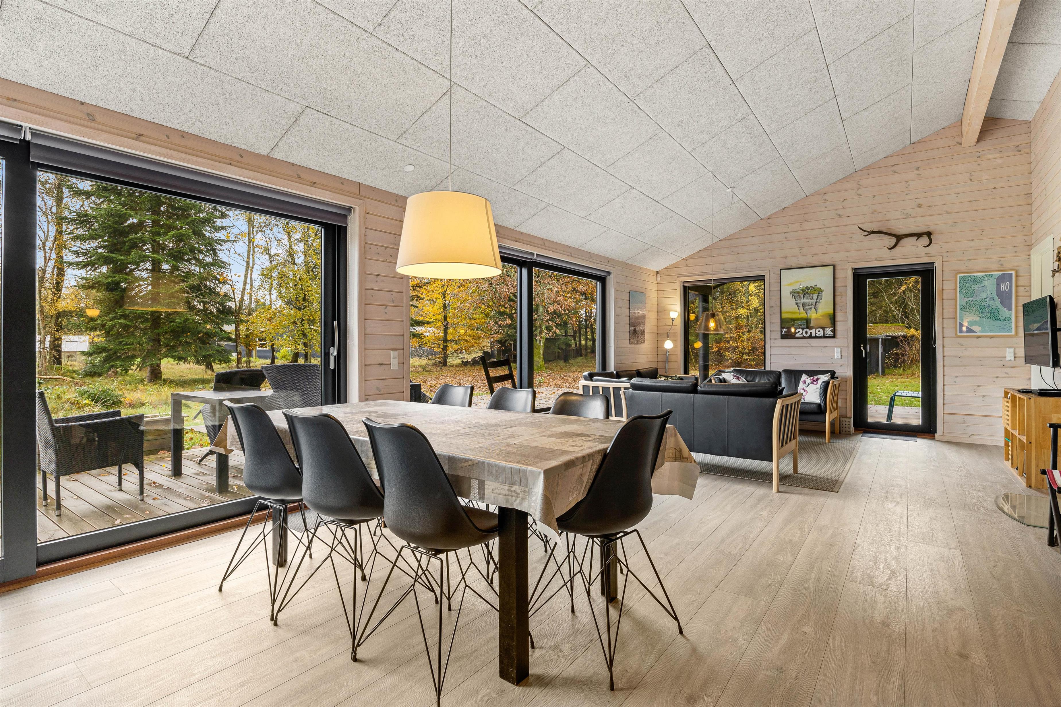 De store vinduespartier og skydedøre gør rummet let og lyst og inviterer naturen ind, og måske er I heldige at se nogle af skoven dyr kigge forbi. Hemsen er som regel et populært hyggested for børnene og teenagerne. Et godt tip: Brug feriehusets energibesparende varmepumpe.