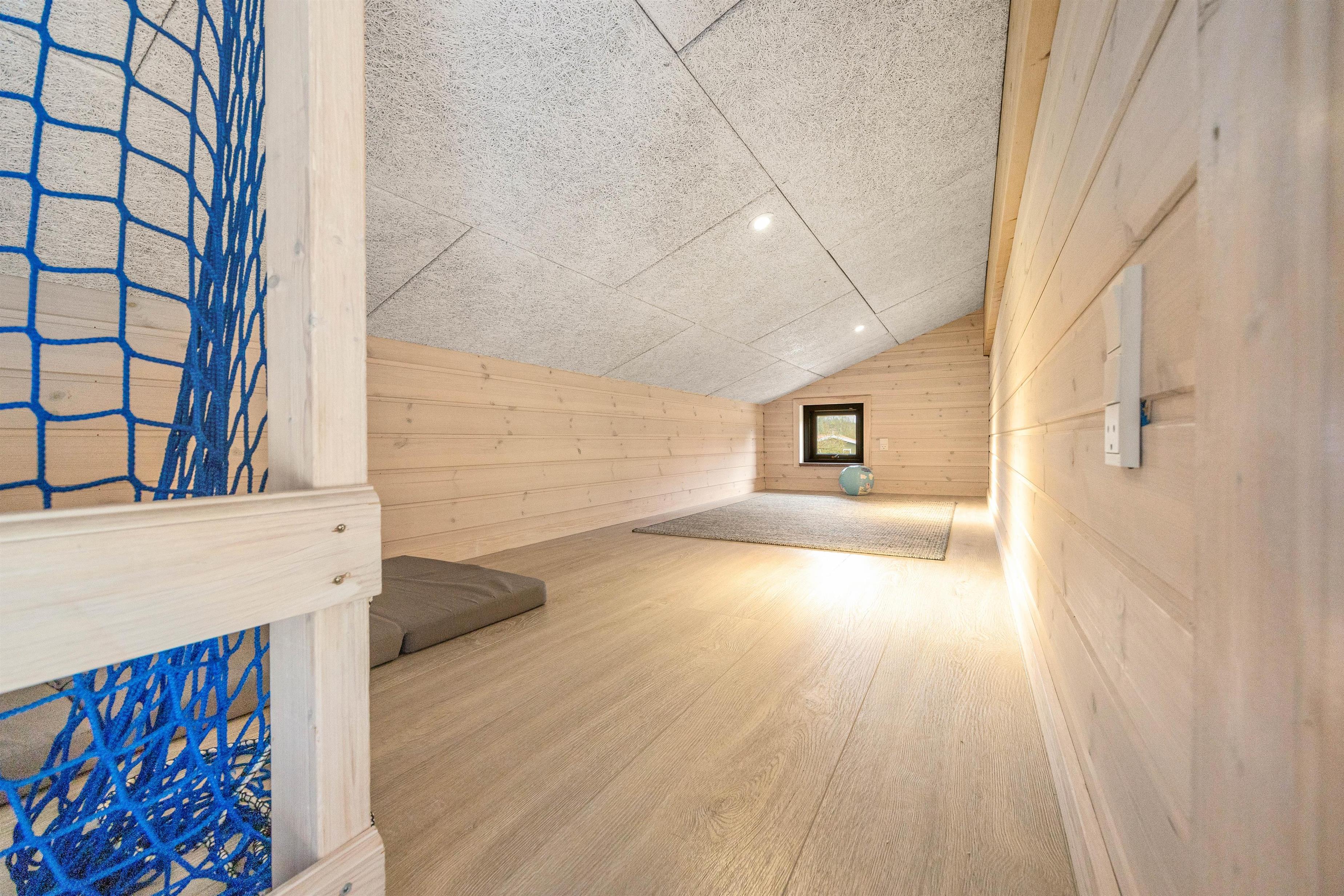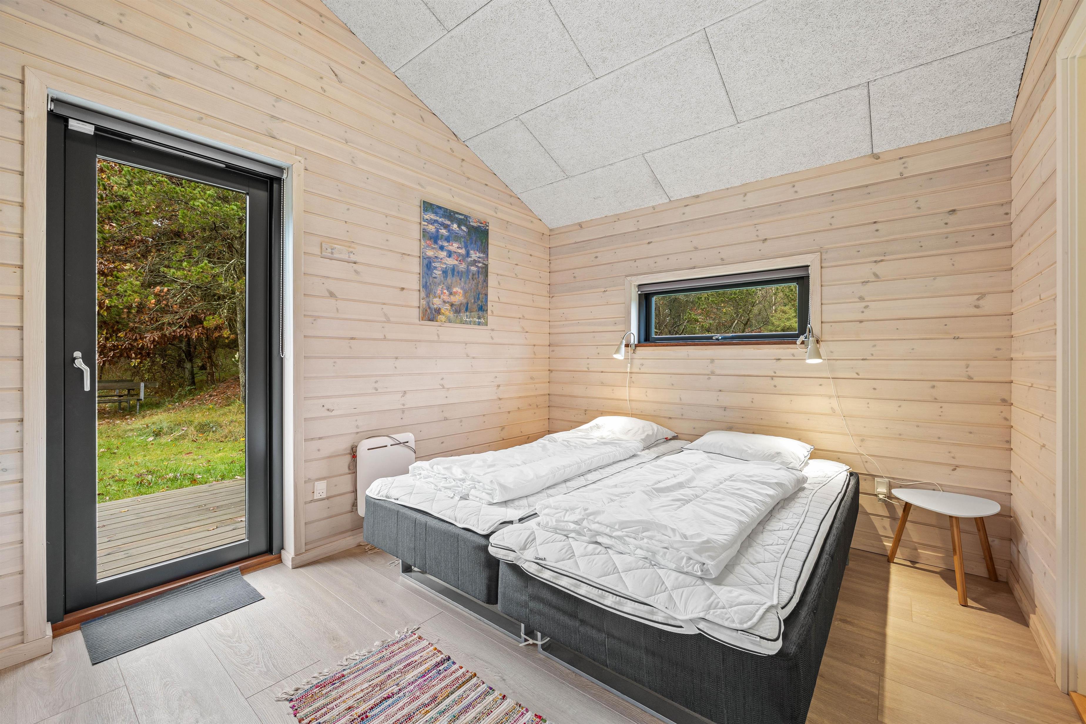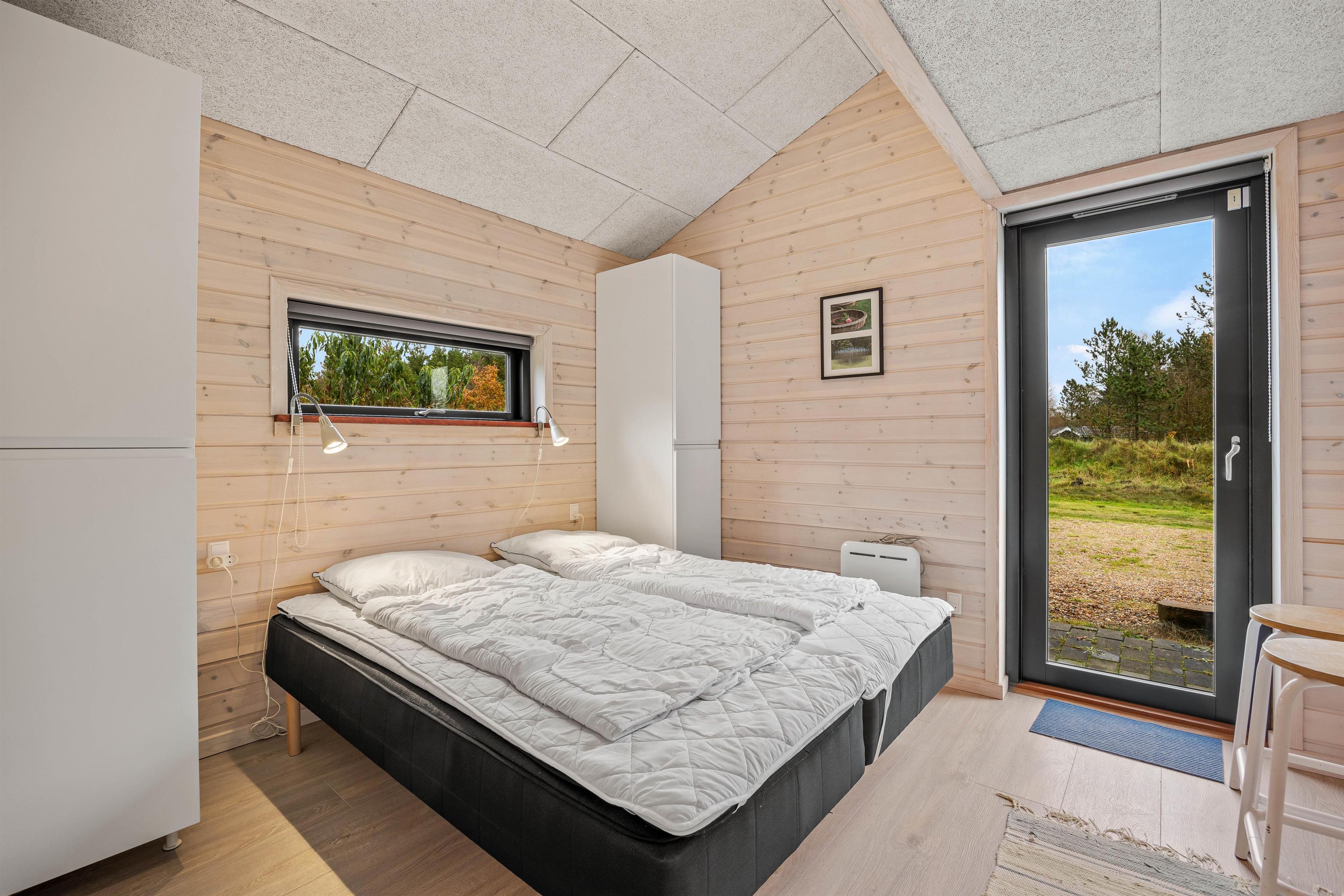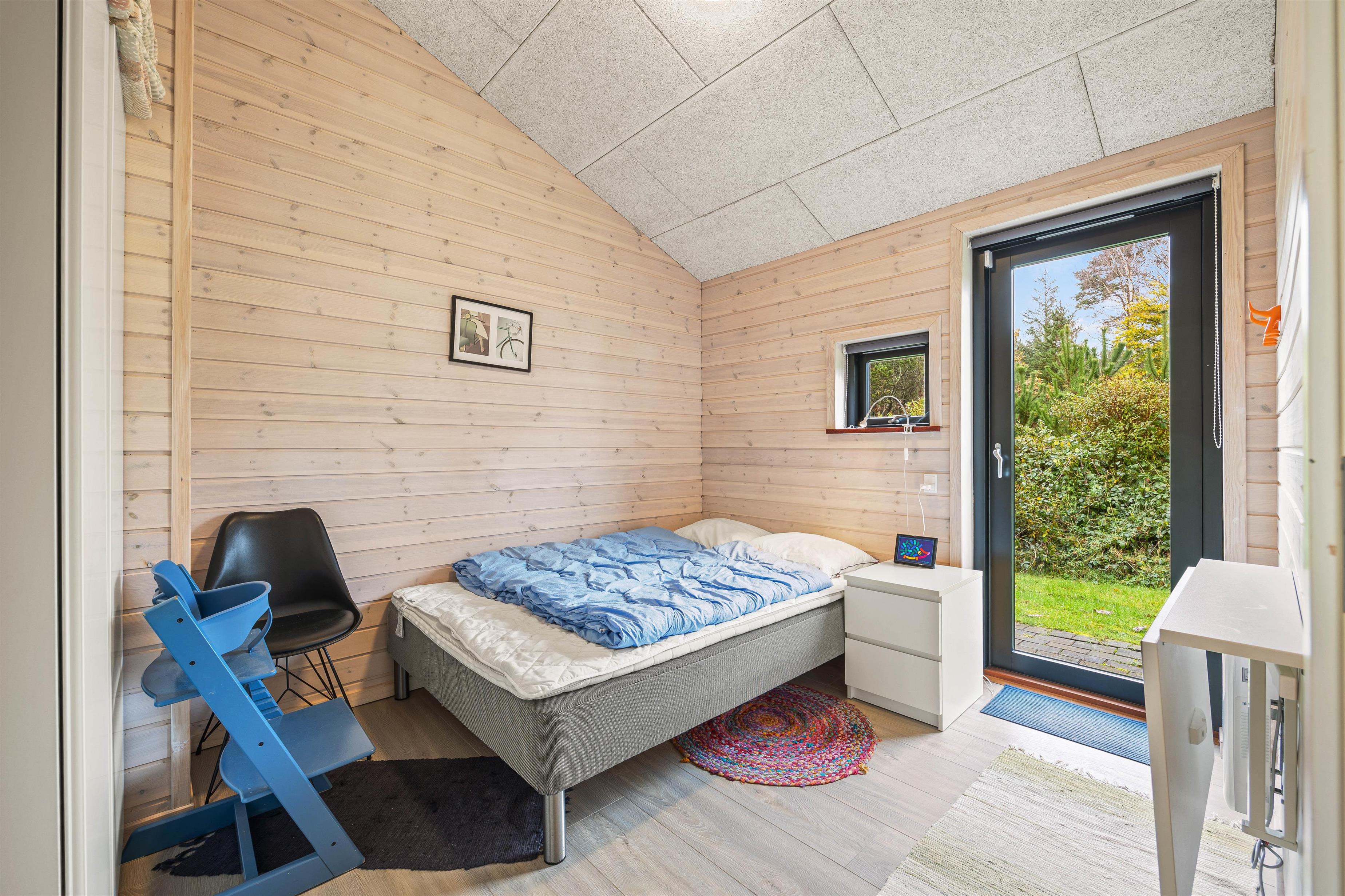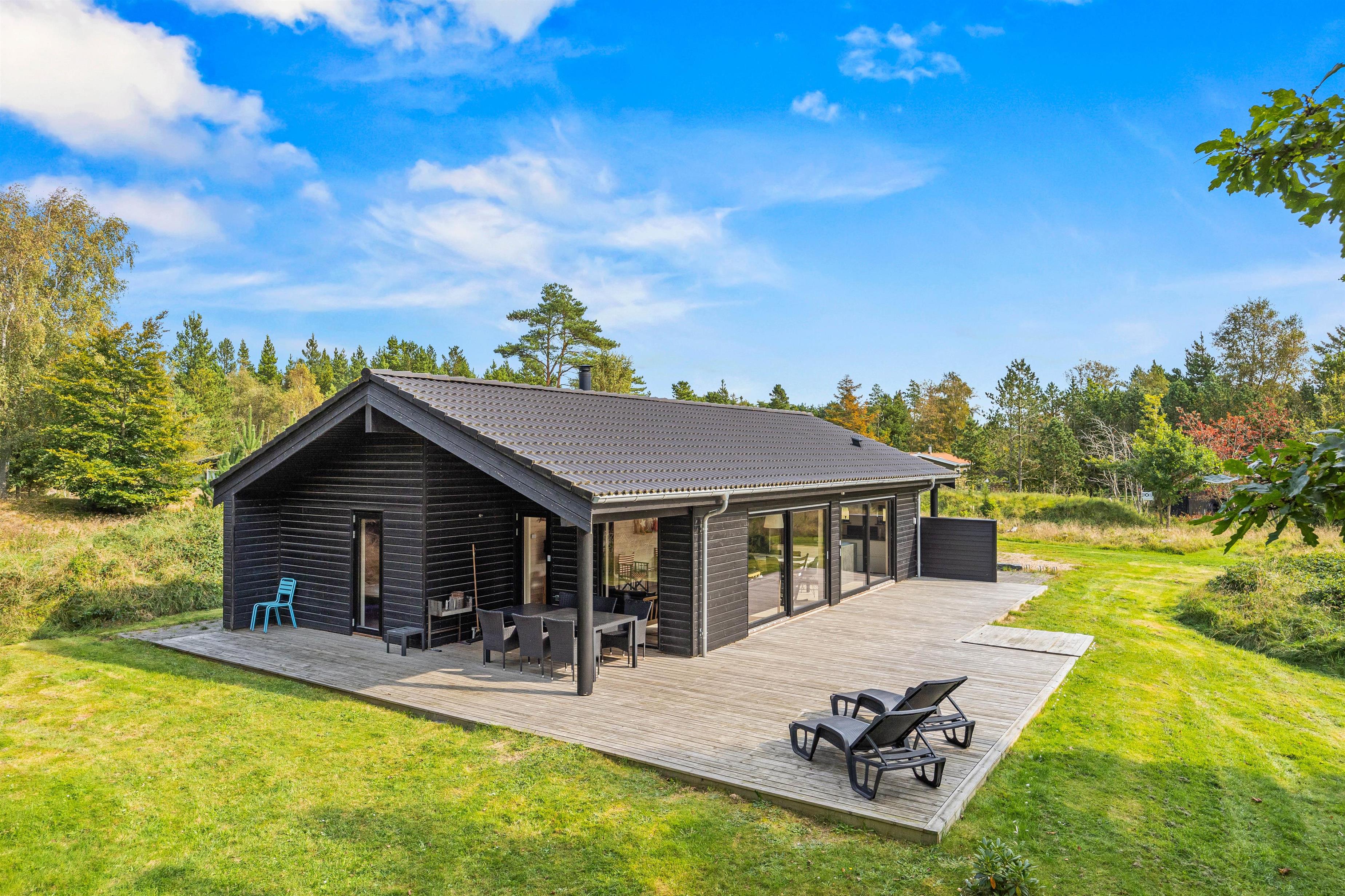 De store vinduespartier og skydedøre gør rummet let og lyst og inviterer naturen ind, og måske er I heldige at se nogle af skoven dyr kigge forbi. Hemsen er som regel et populært hyggested for børnene og teenagerne. Et godt tip: Brug feriehusets energibesparende varmepumpe.