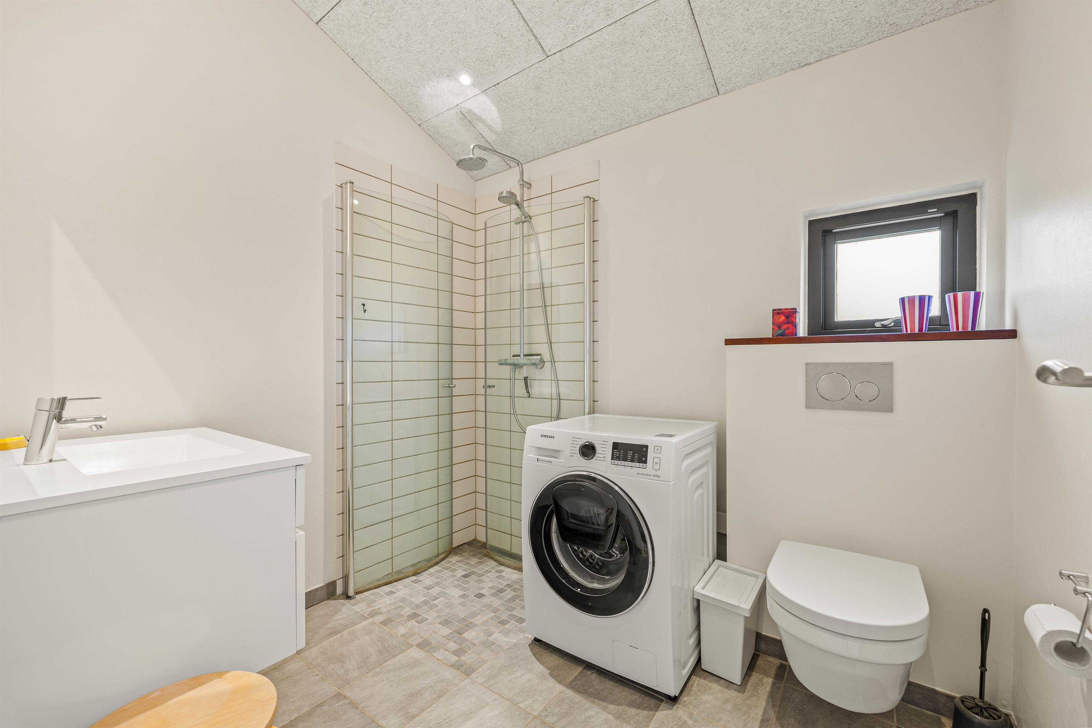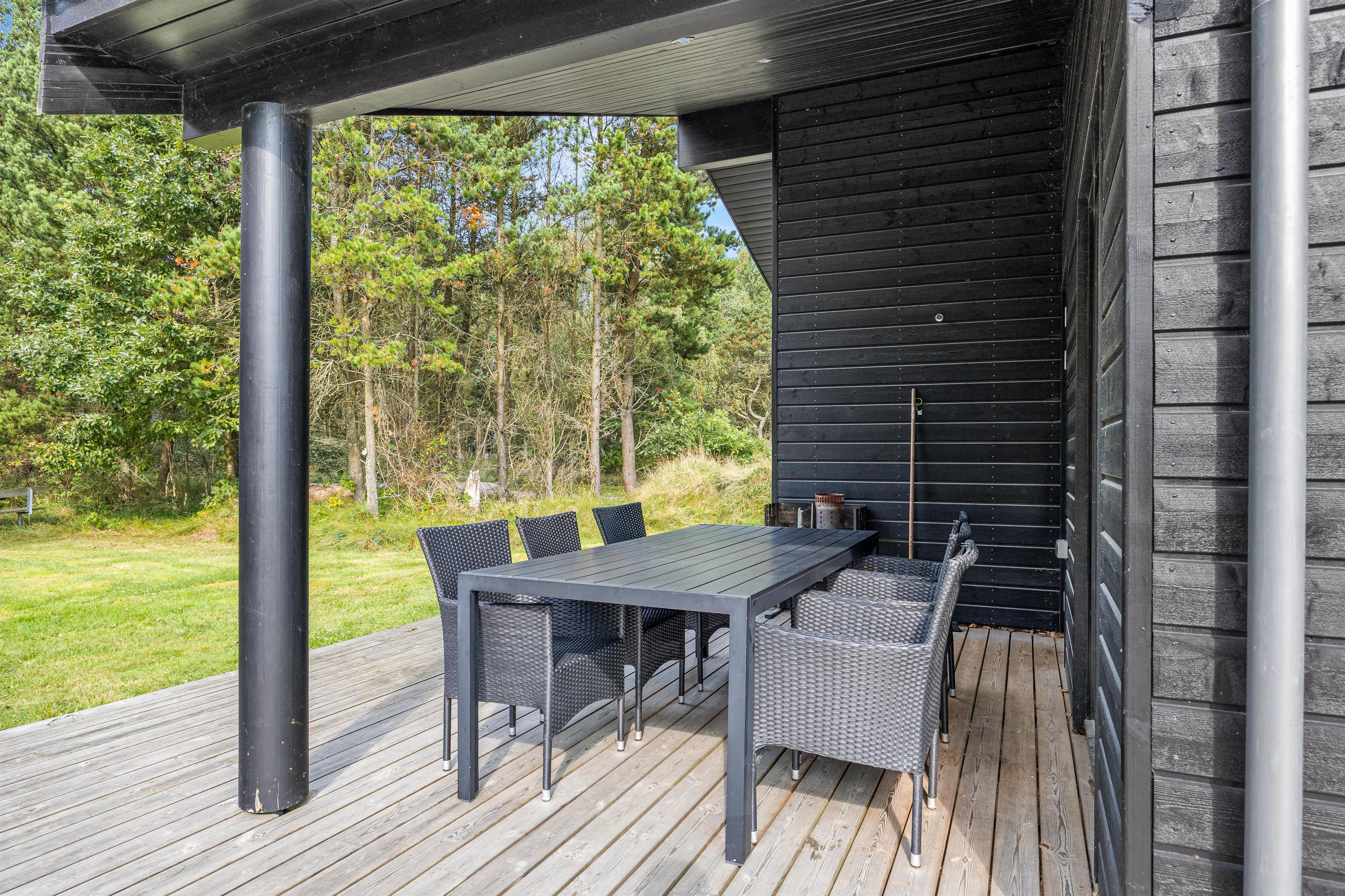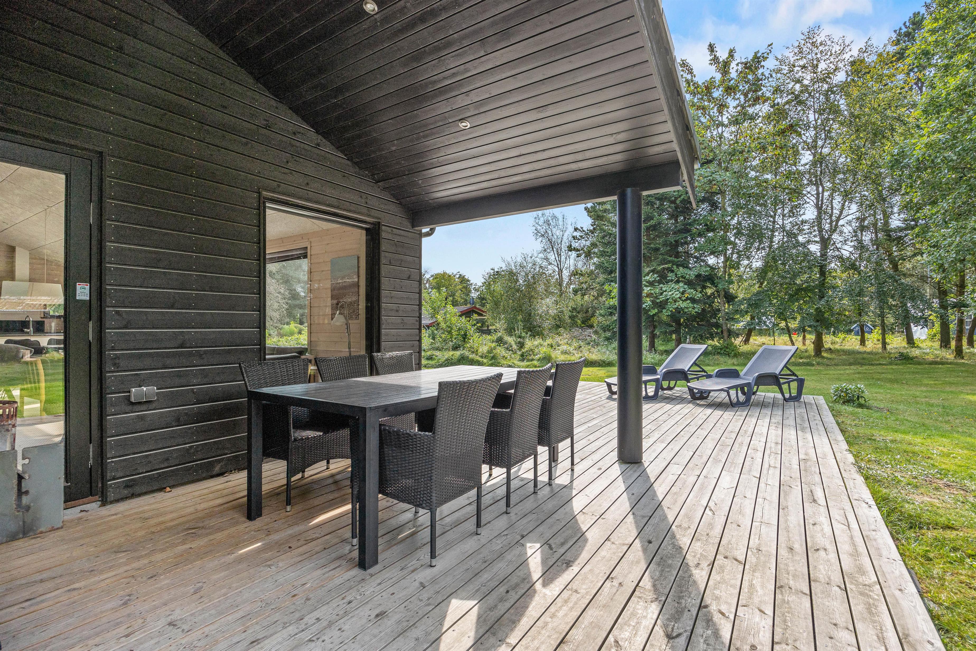 Skulle I liste jer ud om morgenen fra soveværelsets terrassedør for at høre naturen vågne, er der ikke langt til terrassens møbler eller solvogne. Der er nemlig plads til, at de kan stå parat til en kop morgenkaffe. Grillen står naturligvis til rådighed for et godt måltid hele dagen og skulle vind og vejr ikke være til ophold i det fri, kan I trække ind under den overdækkede terrasse.