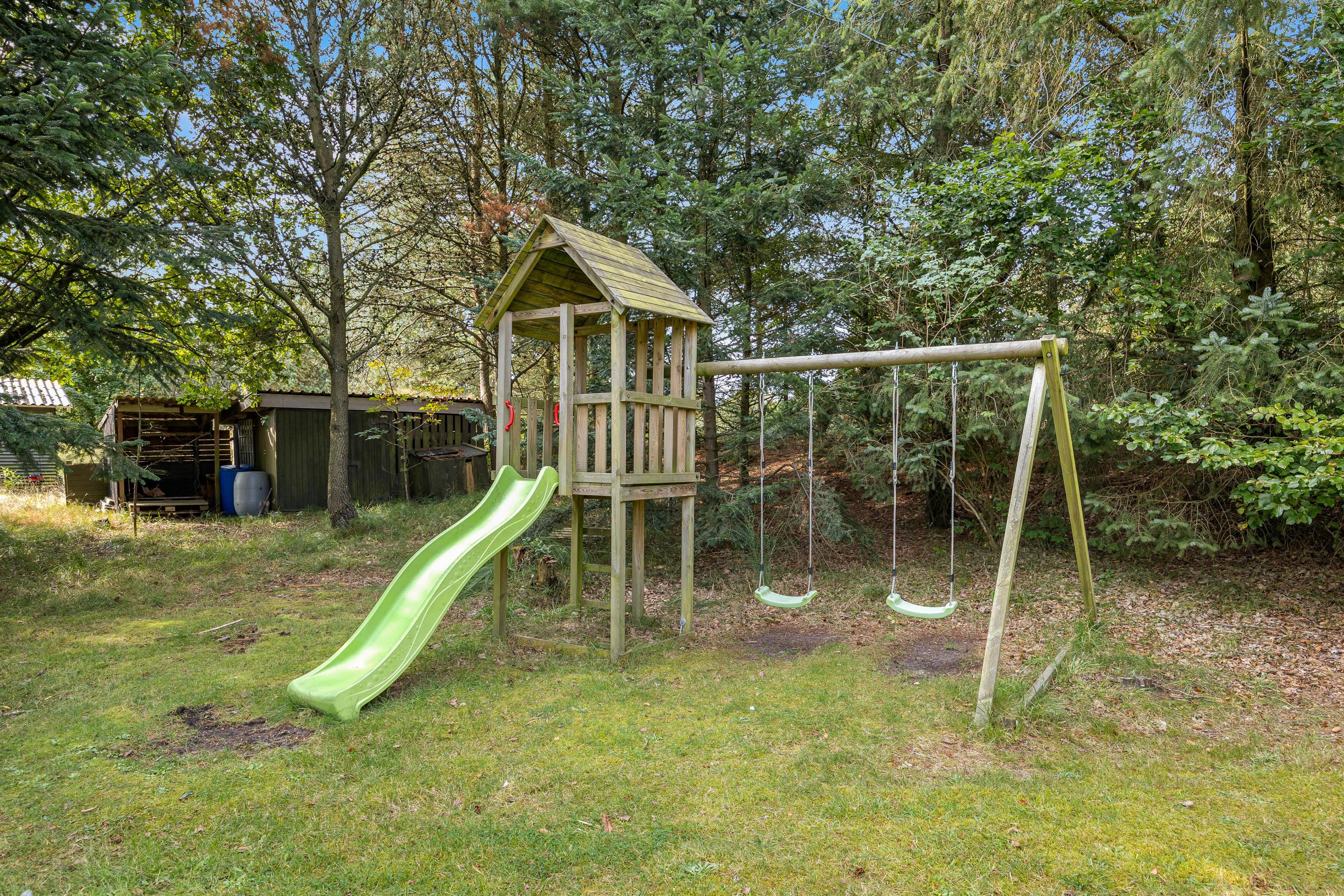 Den 2323 m2 store grund med gynger og sandkasse indbyder alle - både 2- og 4-benede – til at brænde energi af med leg og spil.