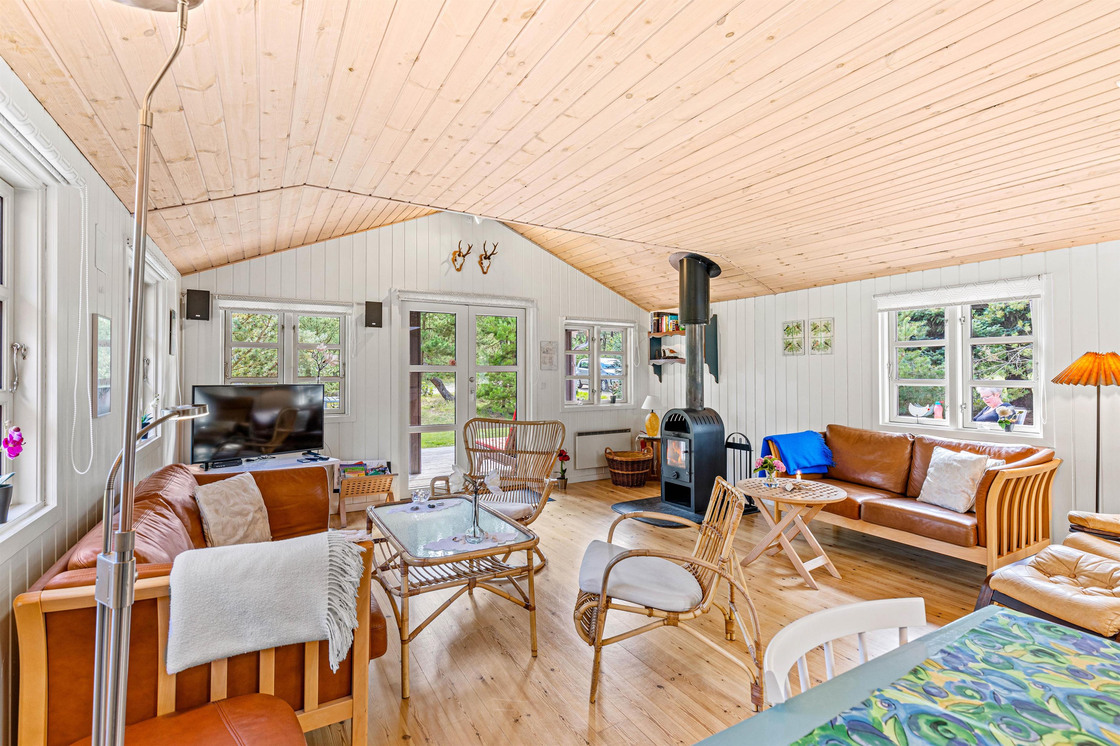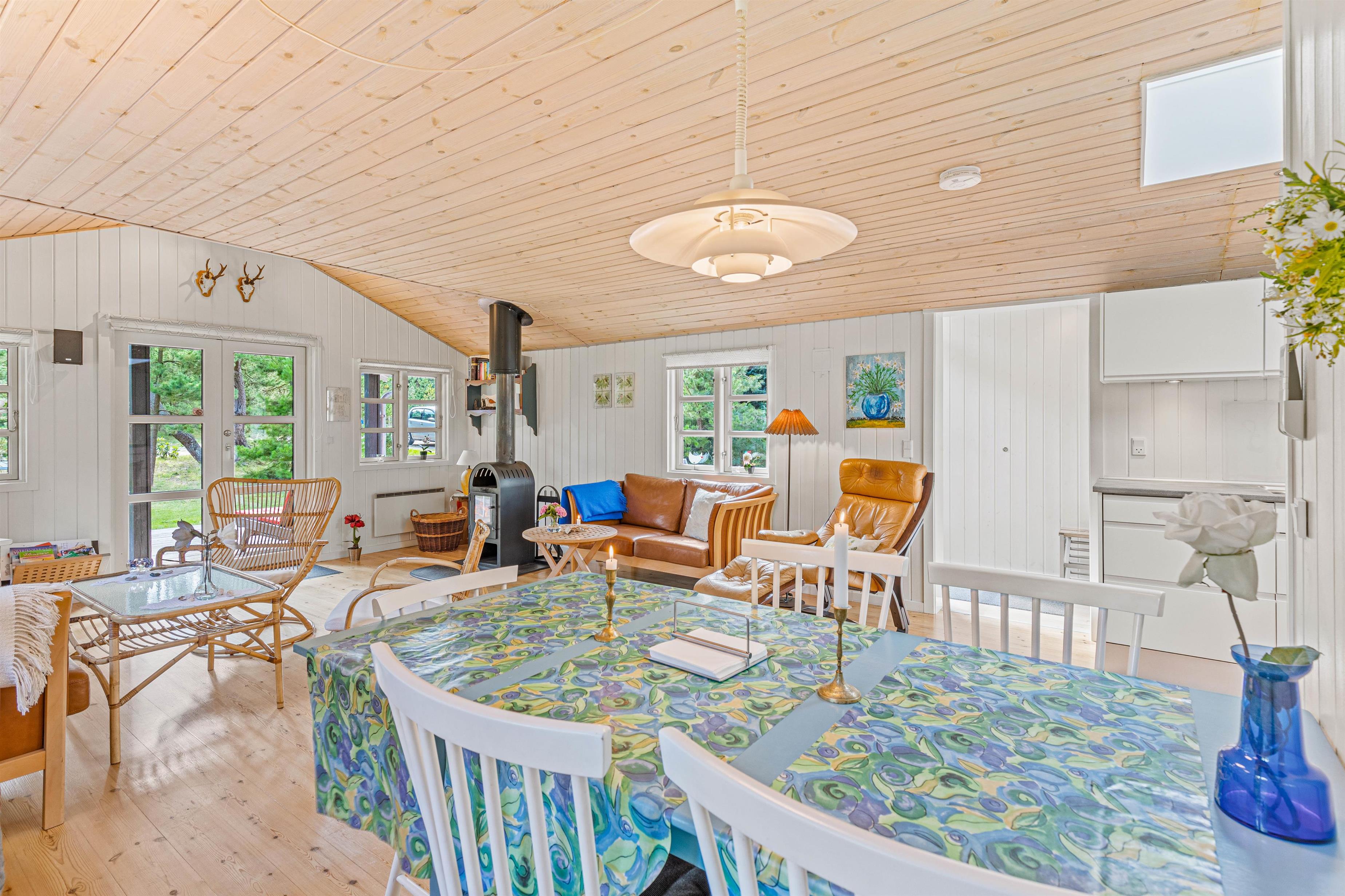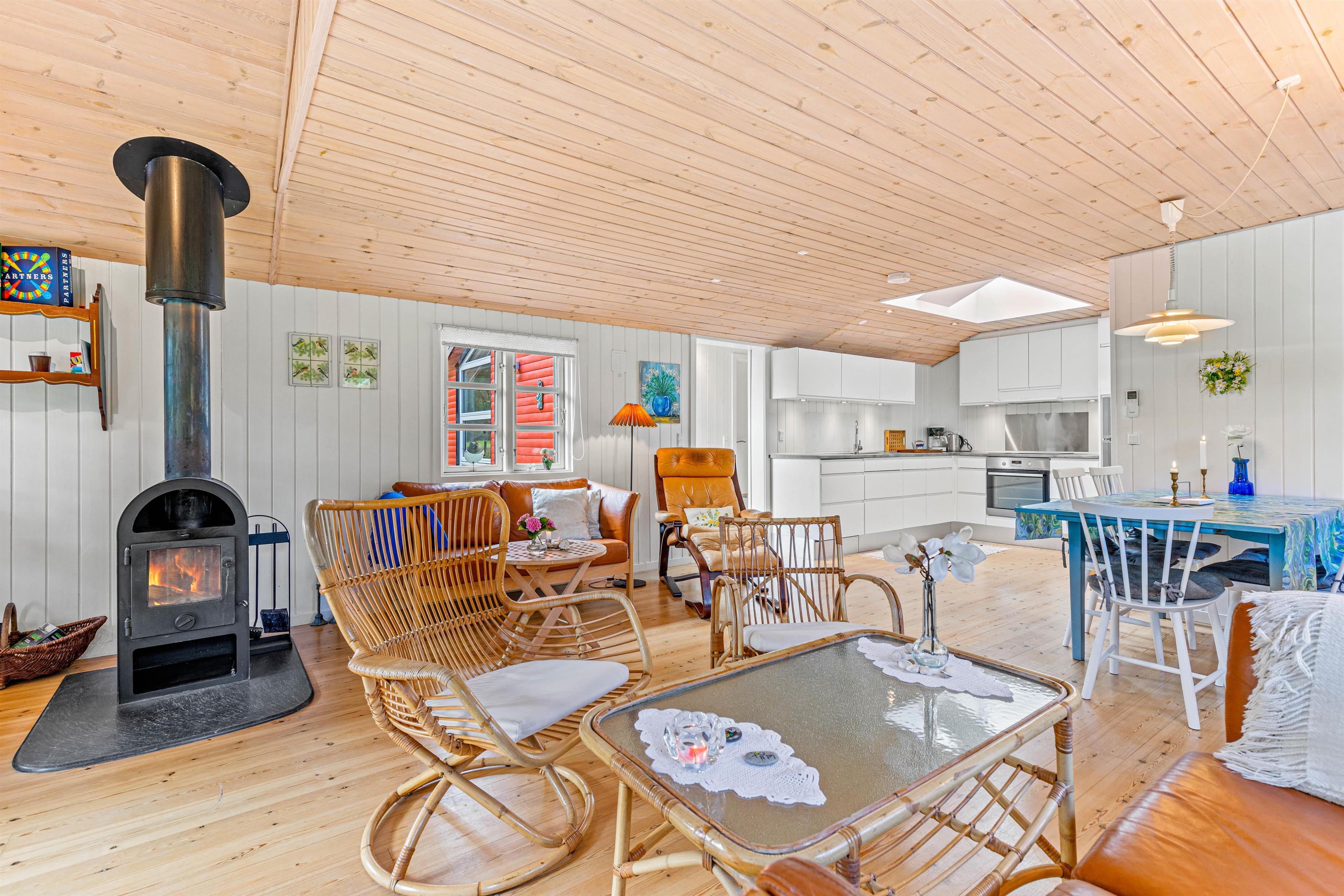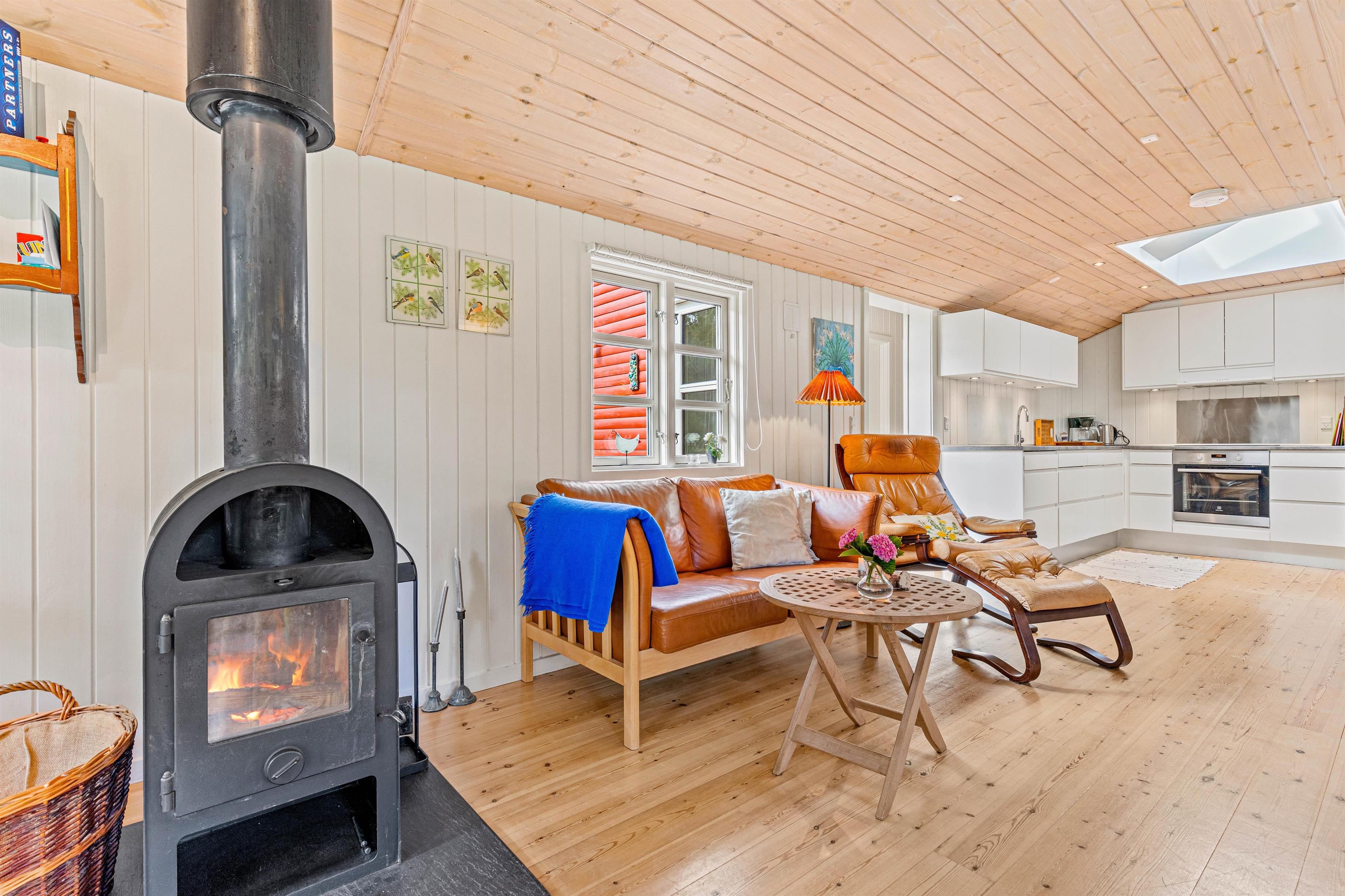 Det 70 m2 store træhus fra 1975 er utroligt godt indrettet med både åbent lyst køkken med opvaskemaskine, mikroovn og induktionskogeplade i direkte sammenhæng med spiseplads og stuen. Her er der flere hyggepladser tæt på brændeovnen, så I kan slappe af med spil, en spændende film eller en god bog, mens ilden knitrer og kaffen brygges.