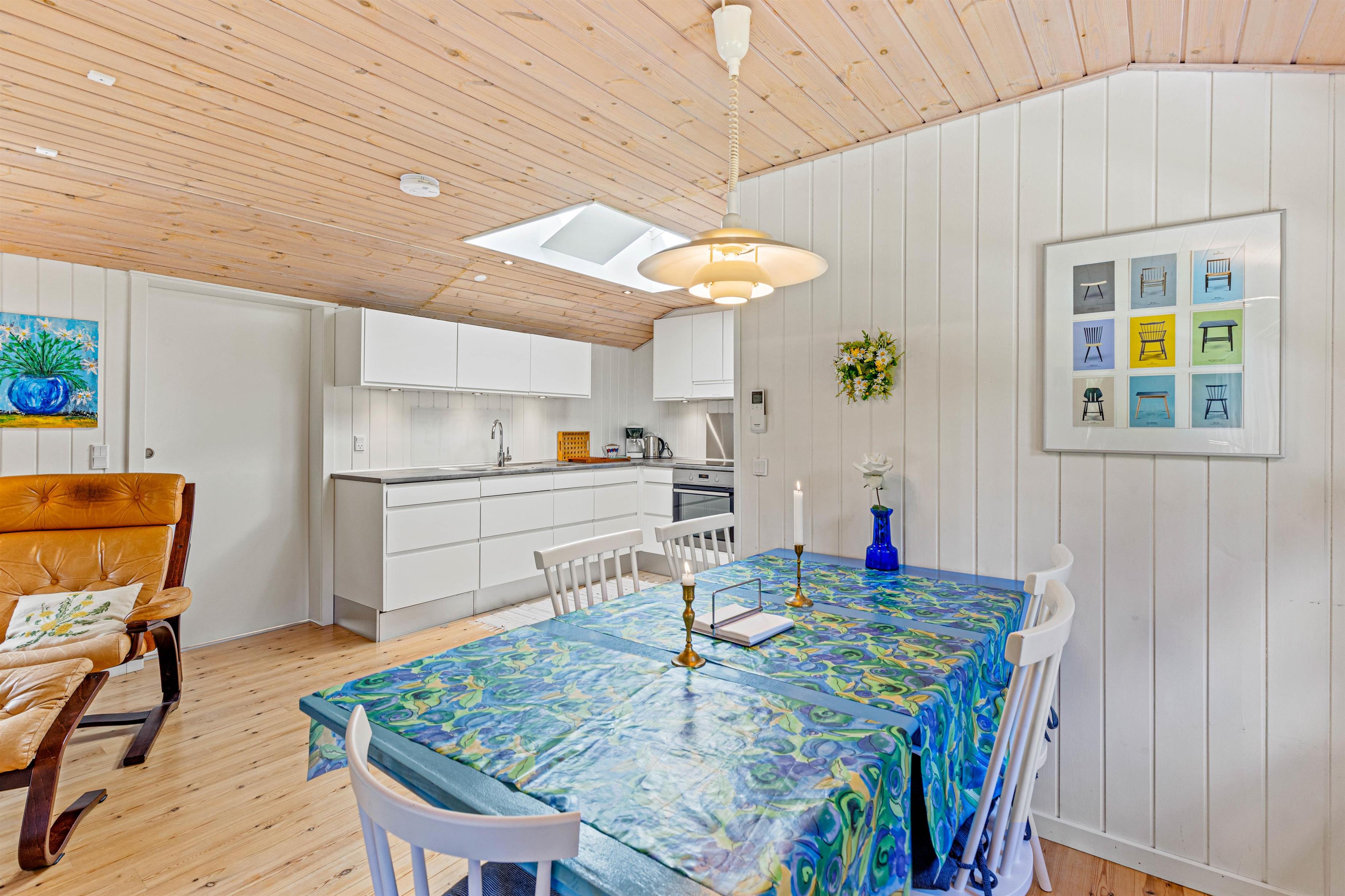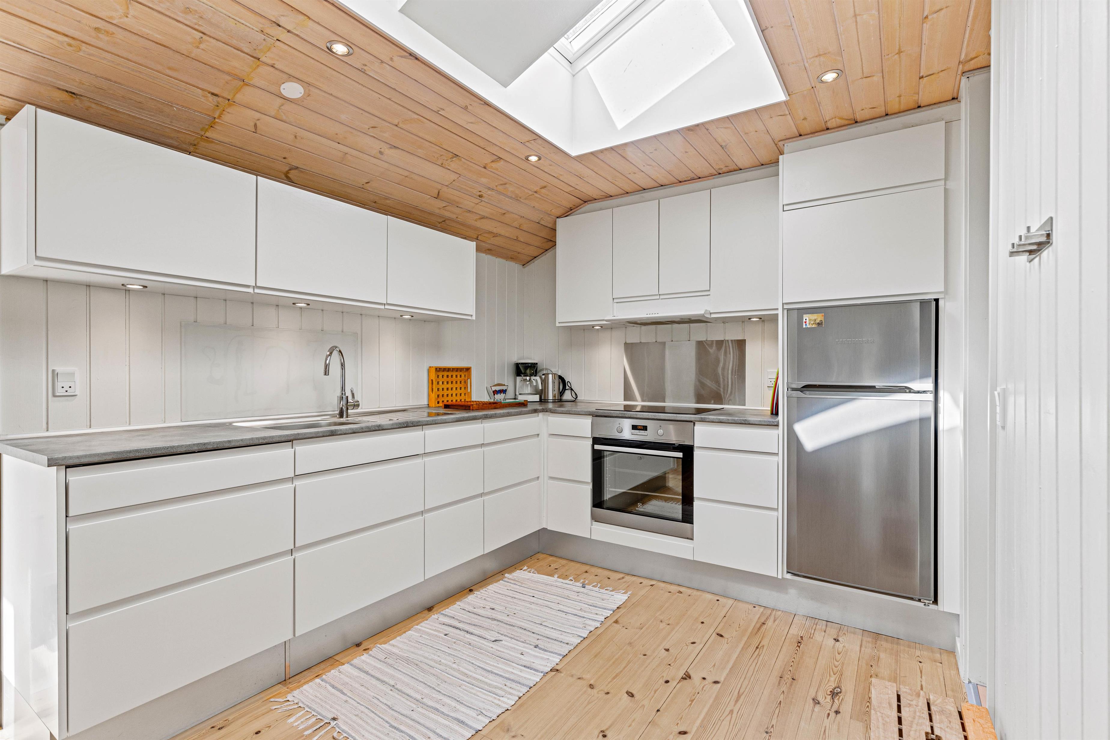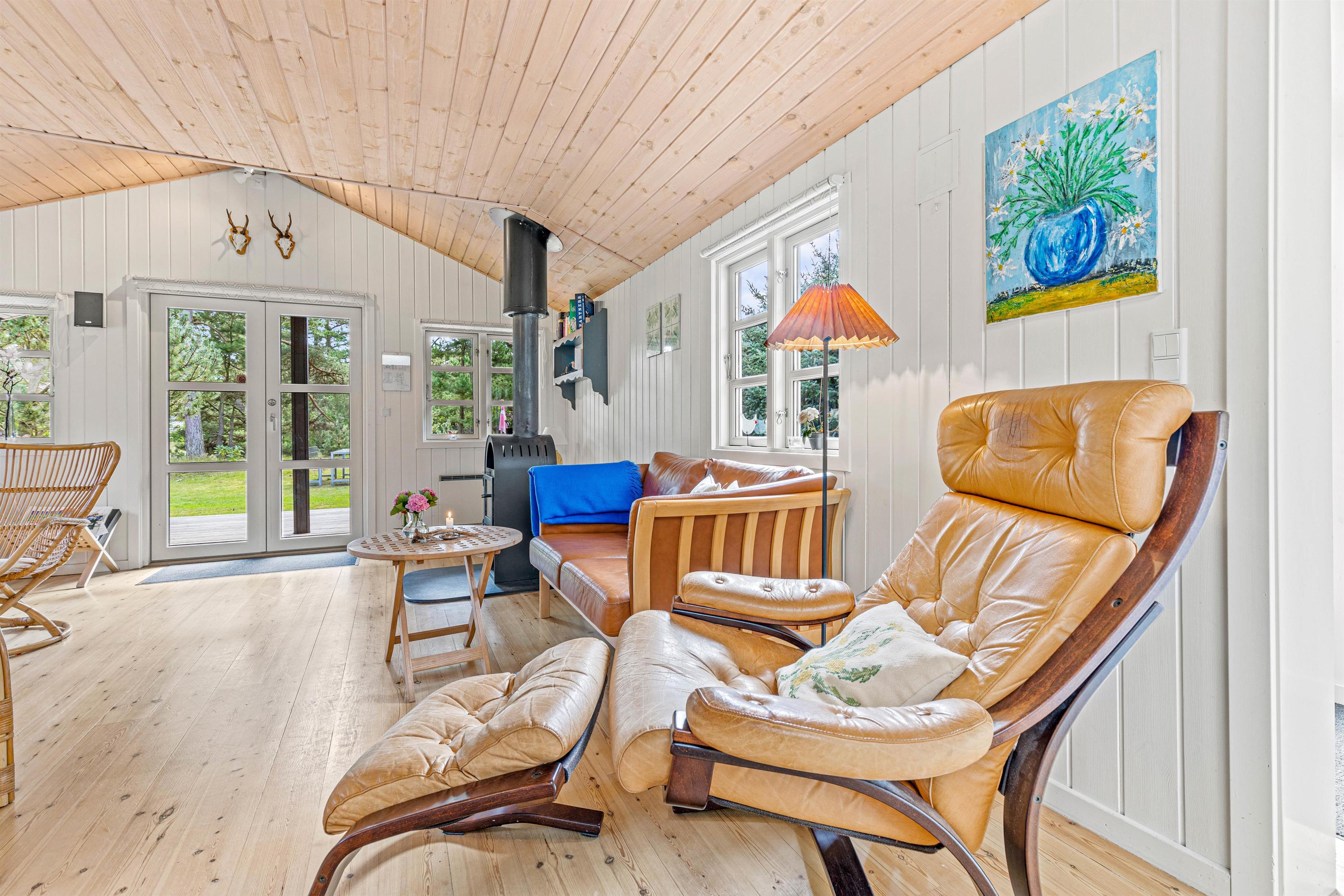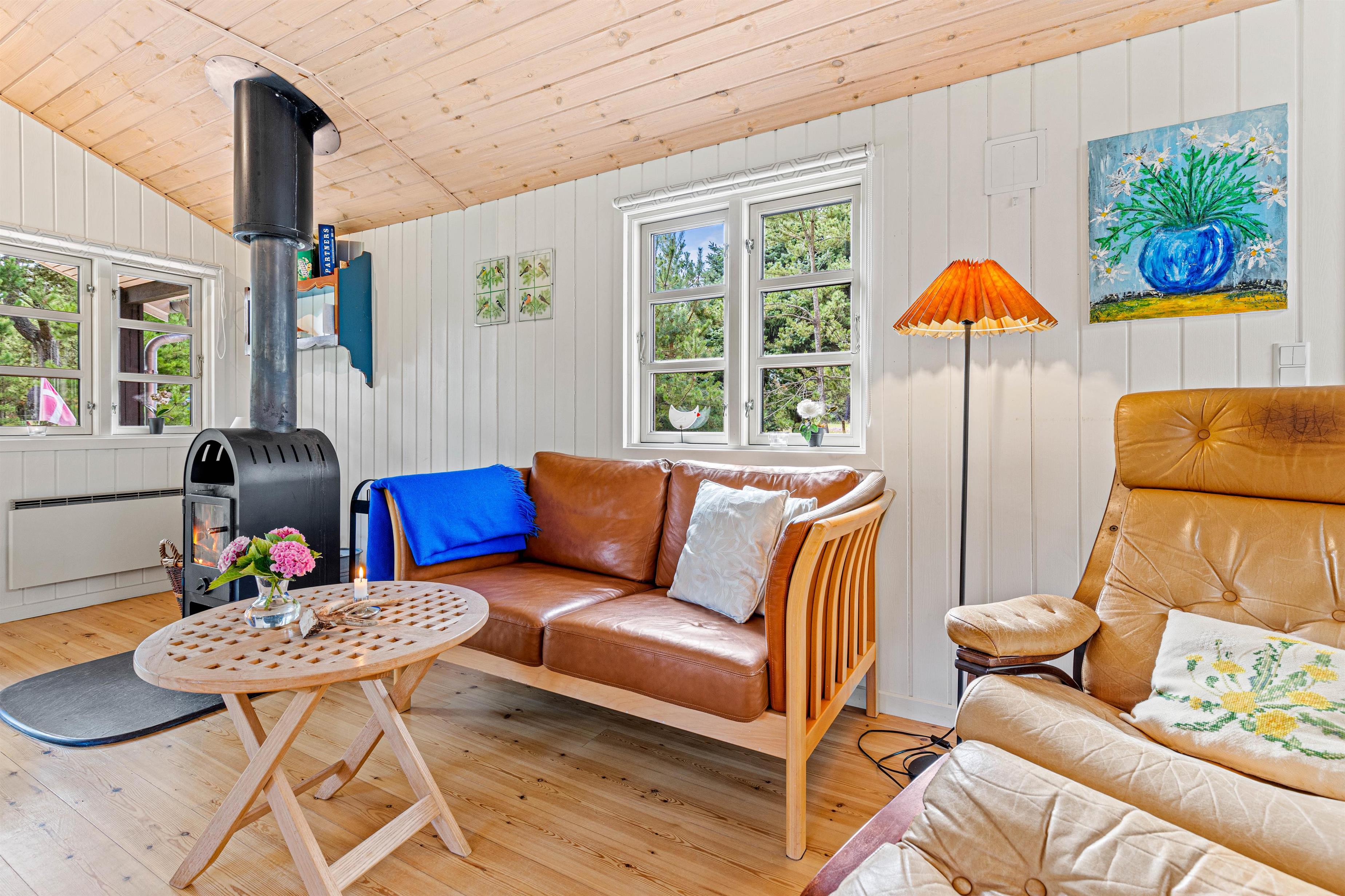 Det 70 m2 store træhus fra 1975 er utroligt godt indrettet med både åbent lyst køkken med opvaskemaskine, mikroovn og induktionskogeplade i direkte sammenhæng med spiseplads og stuen. Her er der flere hyggepladser tæt på brændeovnen, så I kan slappe af med spil, en spændende film eller en god bog, mens ilden knitrer og kaffen brygges.
