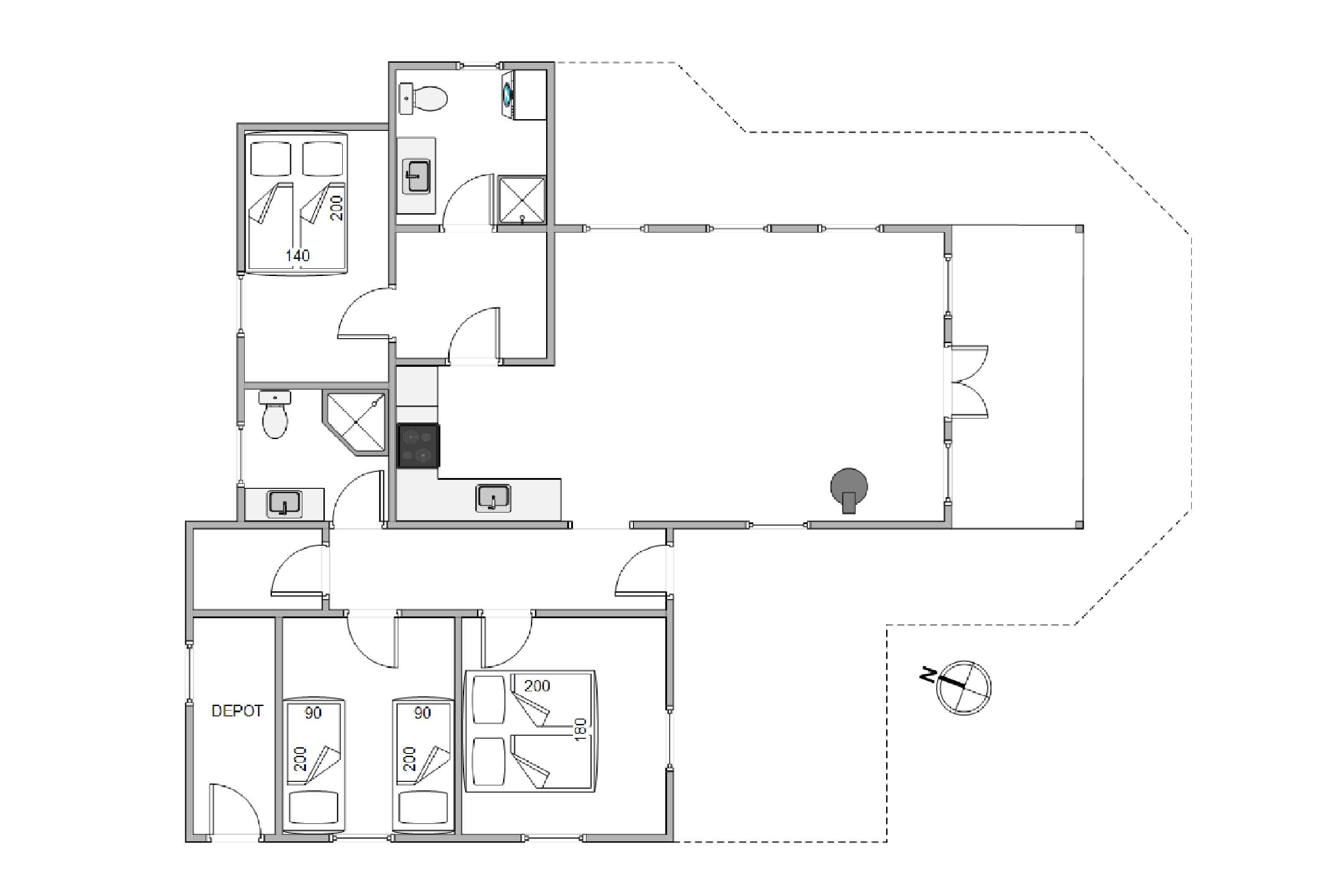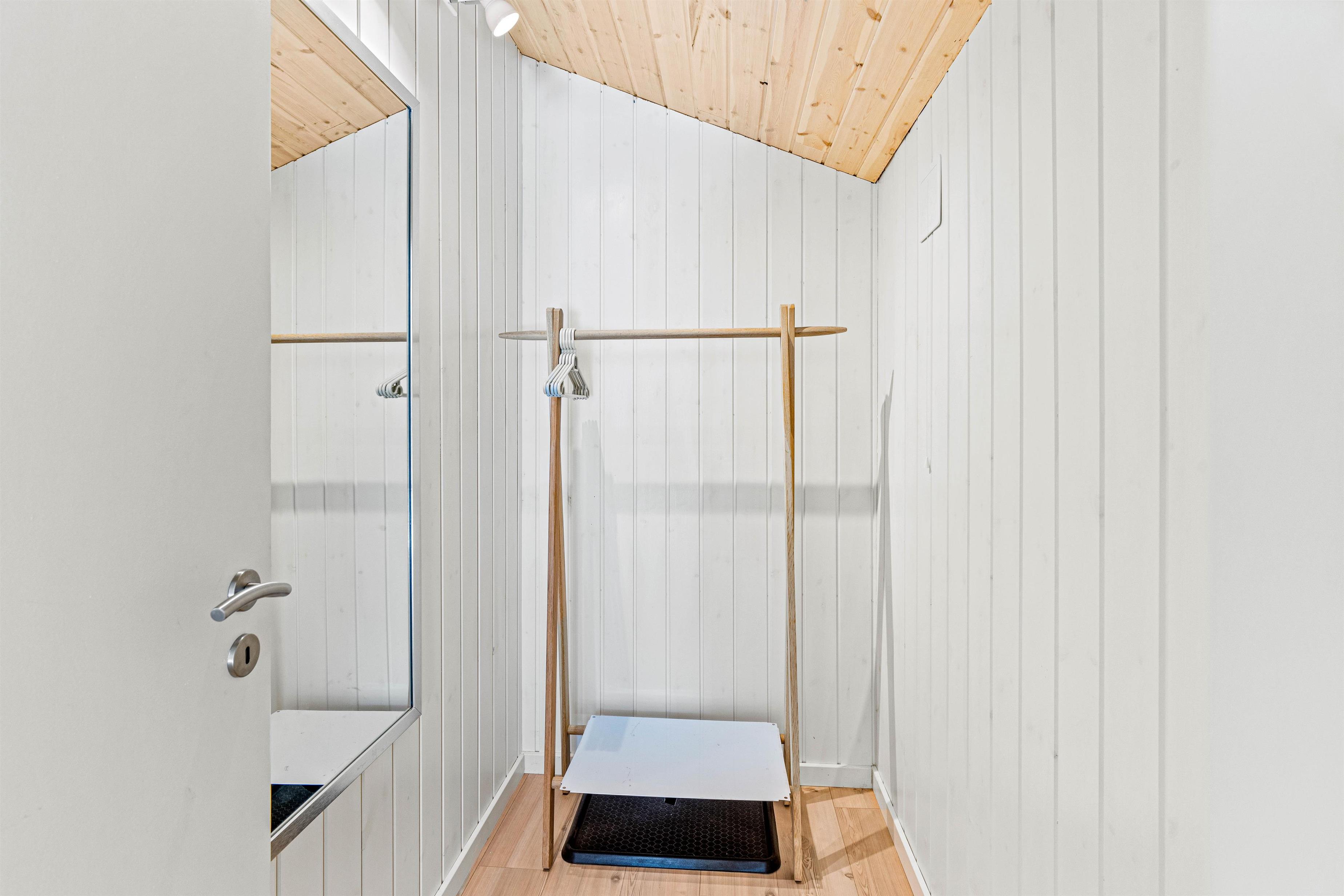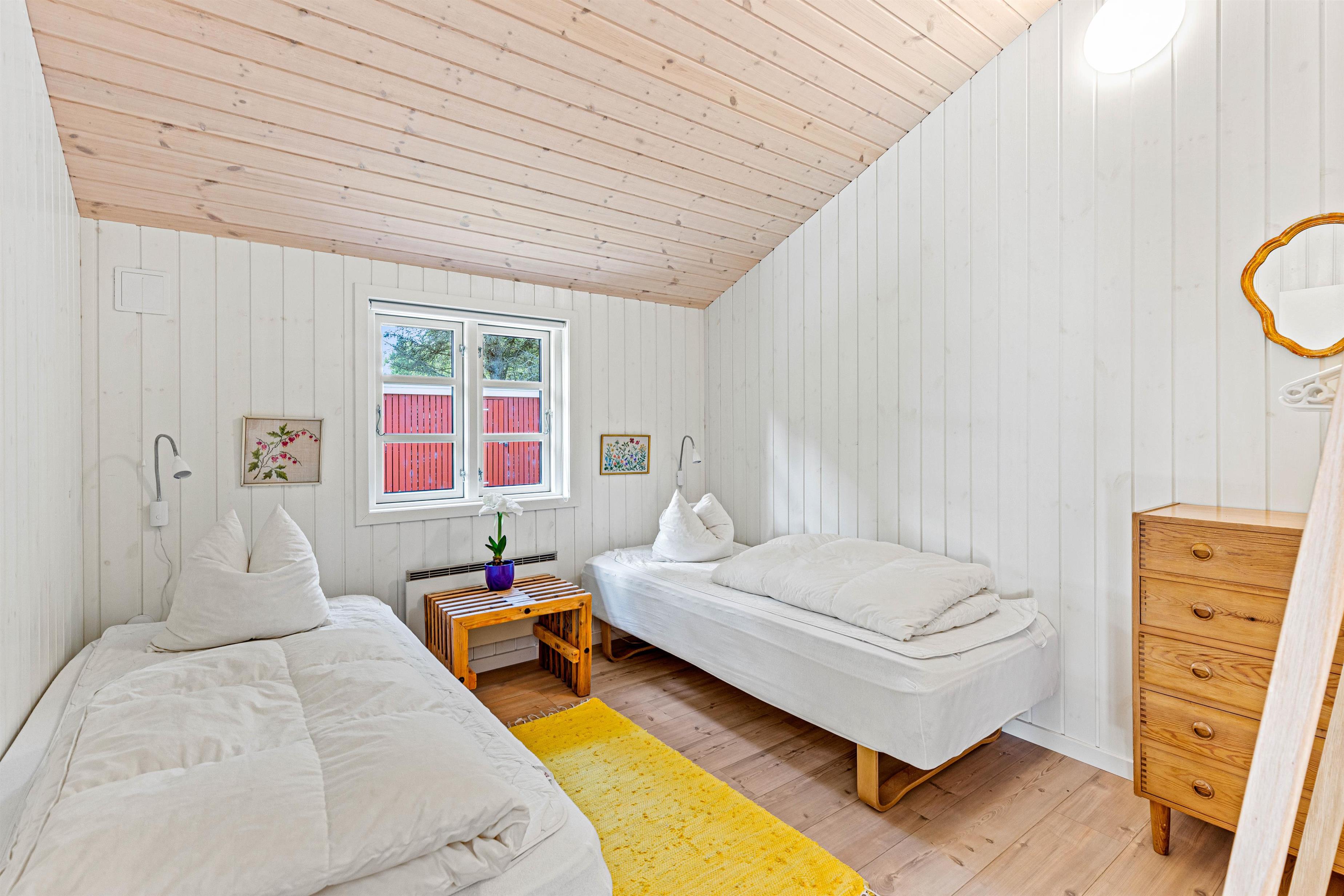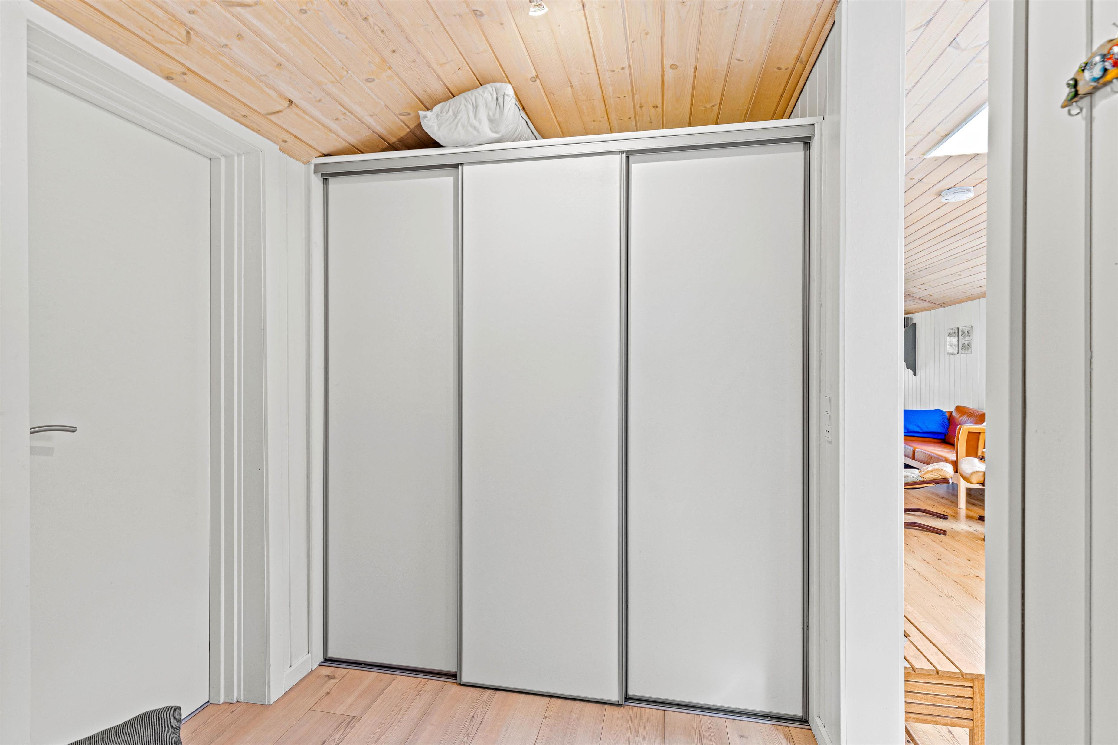 Det 70 m2 store træhus fra 1975 er utroligt godt indrettet med både åbent lyst køkken med opvaskemaskine, mikroovn og induktionskogeplade i direkte sammenhæng med spiseplads og stuen. Her er der flere hyggepladser tæt på brændeovnen, så I kan slappe af med spil, en spændende film eller en god bog, mens ilden knitrer og kaffen brygges.