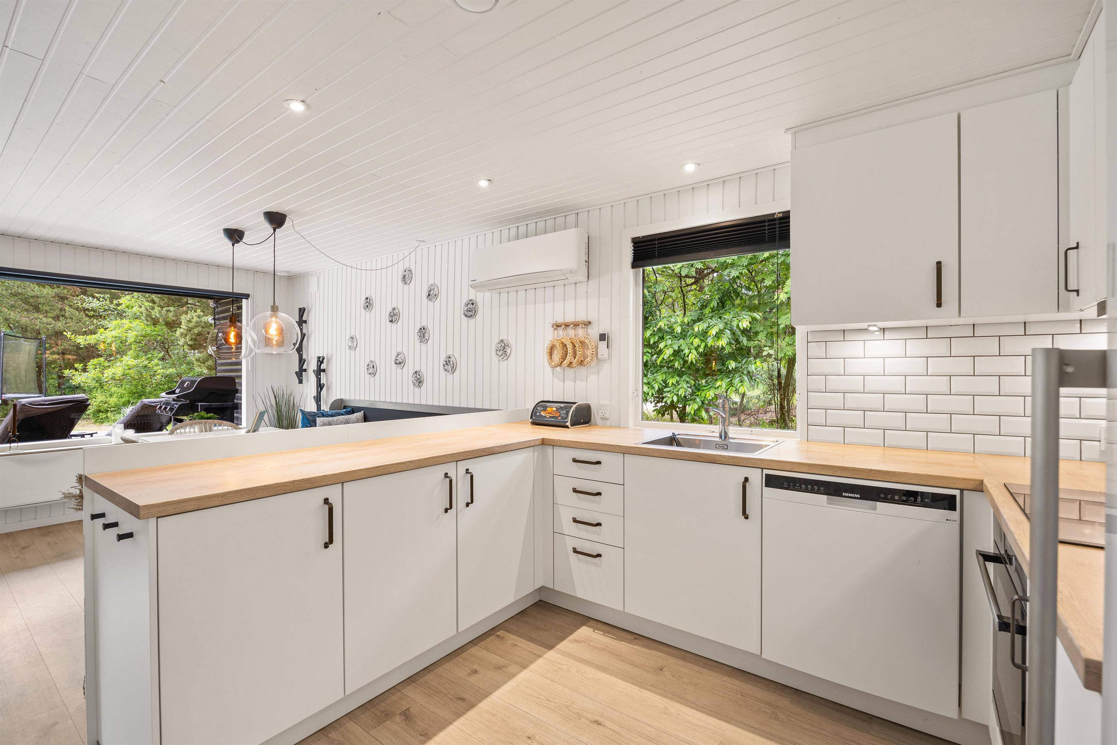 Sommerhuset er lyst og moderne indrettet, og her vil I hurtigt føle jer godt tilpasse i den indbydende atmosfære. Hjerterummet i feriehuset er det hyggelige alrum, hvor hele familien kan samles til gode og mindeværdige feriestunder. Selv når der skal laves mad, går kokken i familien ikke glip af familiehyggen, da køkken, spiseplads og stue ligger samlet i ét.
